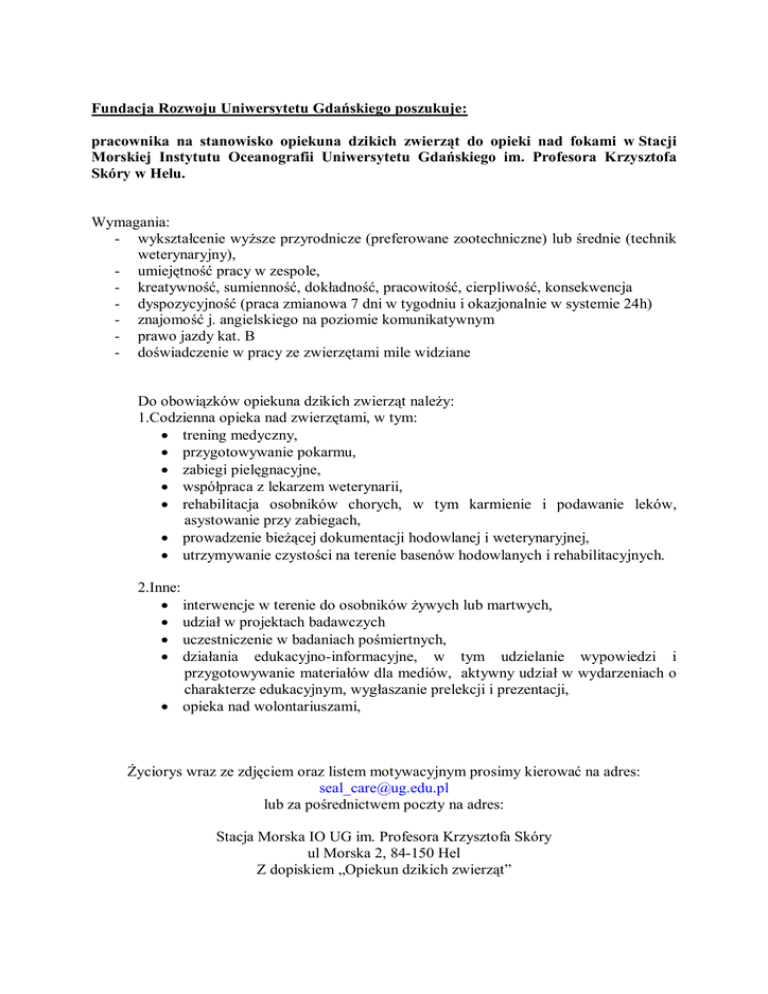 Fundacja Rozwoju Uniwersytetu Gdańskiego poszukuje: pracownika na stanowisko opiekuna dzikich zwierząt do opieki nad fokami w Stacji Morskiej Instytutu Oceanografii Uniwersytetu Gdańskiego im. Profesora Krzysztofa Skóry w Helu. Wymagania: - wykształcenie wyższe przyrodnicze (preferowane zootechniczne) lub średnie (technik weterynaryjny), - umiejętność pracy w zespole, - kreatywność, sumienność, dokładność, pracowitość, cierpliwość, konsekwencja - dyspozycyjność (praca zmianowa 7 dni w tygodniu i okazjonalnie w systemie 24h) - znajomość j. angielskiego na poziomie komunikatywnym - prawo jazdy kat. B - doświadczenie w pracy ze zwierzętami mile widziane Do obowiązków opiekuna dzikich zwierząt należy: 1.Codzienna opieka nad zwierzętami, w tym: trening medyczny, przygotowywanie pokarmu, zabiegi pielęgnacyjne, współpraca z lekarzem weterynarii, rehabilitacja osobników chorych, w tym karmienie i podawanie leków, asystowanie przy zabiegach, prowadzenie bieżącej dokumentacji hodowlanej i weterynaryjnej, utrzymywanie czystości na terenie basenów hodowlanych i rehabilitacyjnych. 2.Inne: interwencje w terenie do osobników żywych lub martwych, udział w projektach badawczych uczestniczenie w badaniach pośmiertnych, działania edukacyjno-informacyjne, w tym udzielanie wypowiedzi i przygotowywanie materiałów dla mediów, aktywny udział w wydarzeniach o charakterze edukacyjnym, wygłaszanie prelekcji i prezentacji, opieka nad wolontariuszami, Życiorys wraz ze zdjęciem oraz listem motywacyjnym prosimy kierować na adres: [email protected] lub za pośrednictwem poczty na adres: Stacja Morska IO UG im. Profesora Krzysztofa Skóry ul Morska 2, 84-150 Hel Z dopiskiem „Opiekun dzikich zwierząt” Termin nadsyłania zgłoszeń: 13.01.2017 Wybrani kandydaci zostaną powiadomieni o terminie rozmowy kwalifikacyjnej. Prosimy o dodanie klauzuli: „Wyrażam zgodę na przetwarzanie moich danych osobowych do celów rekrutacyjnych, zgodnie z ustawą o Ochronie Danych Osobowych z dnia 29.08.1997 r. Dz. U. Nr 133 poz.883”