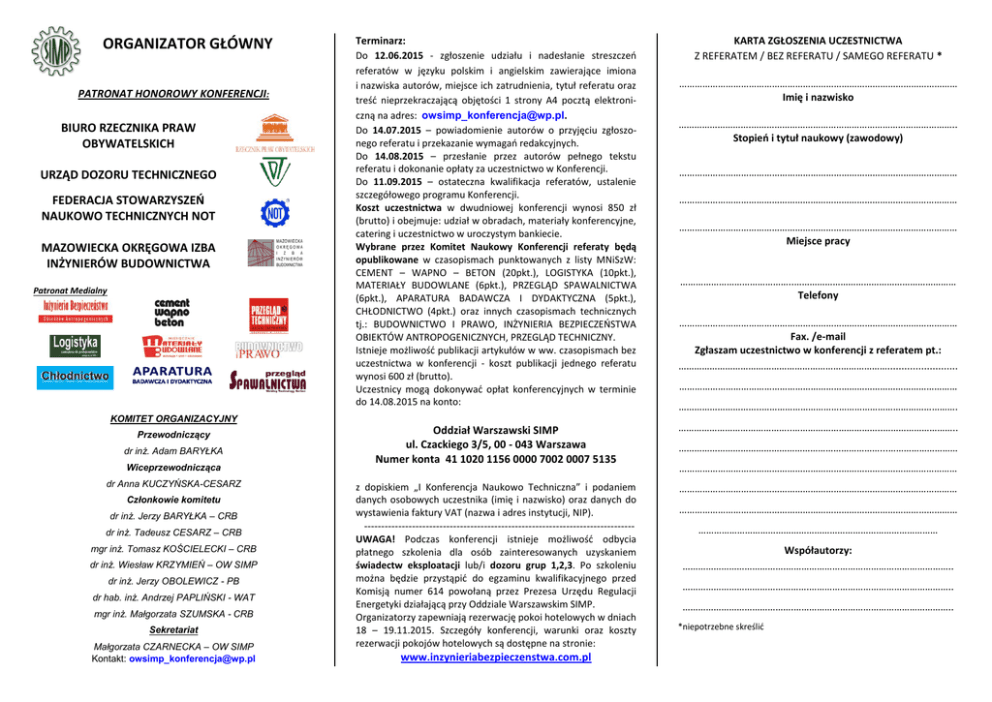 ORGANIZATOR GŁÓWNY PATRONAT HONOROWY KONFERENCJI: BIURO RZECZNIKA PRAW OBYWATELSKICH URZĄD DOZORU TECHNICZNEGO FEDERACJA STOWARZYSZEŃ NAUKOWO TECHNICZNYCH NOT MAZOWIECKA OKRĘGOWA IZBA INŻYNIERÓW BUDOWNICTWA Patronat Medialny Terminarz: Do 12.06.2015 - zgłoszenie udziału i nadesłanie streszczeń referatów w języku polskim i angielskim zawierające imiona i nazwiska autorów, miejsce ich zatrudnienia, tytuł referatu oraz treść nieprzekraczającą objętości 1 strony A4 pocztą elektroniczną na adres: [email protected]. Do 14.07.2015 – powiadomienie autorów o przyjęciu zgłoszonego referatu i przekazanie wymagań redakcyjnych. Do 14.08.2015 – przesłanie przez autorów pełnego tekstu referatu i dokonanie opłaty za uczestnictwo w Konferencji. Do 11.09.2015 – ostateczna kwalifikacja referatów, ustalenie szczegółowego programu Konferencji. Koszt uczestnictwa w dwudniowej konferencji wynosi 850 zł (brutto) i obejmuje: udział w obradach, materiały konferencyjne, catering i uczestnictwo w uroczystym bankiecie. Wybrane przez Komitet Naukowy Konferencji referaty będą opublikowane w czasopismach punktowanych z listy MNiSzW: CEMENT – WAPNO – BETON (20pkt.), LOGISTYKA (10pkt.), MATERIAŁY BUDOWLANE (6pkt.), PRZEGLĄD SPAWALNICTWA (6pkt.), APARATURA BADAWCZA I DYDAKTYCZNA (5pkt.), CHŁODNICTWO (4pkt.) oraz innych czasopismach technicznych tj.: BUDOWNICTWO I PRAWO, INŻYNIERIA BEZPIECZEŃSTWA OBIEKTÓW ANTROPOGENICZNYCH, PRZEGLĄD TECHNICZNY. Istnieje możliwość publikacji artykułów w ww. czasopismach bez uczestnictwa w konferencji - koszt publikacji jednego referatu wynosi 600 zł (brutto). Uczestnicy mogą dokonywać opłat konferencyjnych w terminie do 14.08.2015 na konto: KOMITET ORGANIZACYJNY Przewodniczący dr inż. Adam BARYŁKA Wiceprzewodnicząca dr Anna KUCZYŃSKA-CESARZ Członkowie komitetu dr inż. Jerzy BARYŁKA – CRB dr inż. Tadeusz CESARZ – CRB mgr inż. Tomasz KOŚCIELECKI – CRB dr inż. Wiesław KRZYMIEŃ – OW SIMP dr inż. Jerzy OBOLEWICZ - PB dr hab. inż. Andrzej PAPLIŃSKI - WAT mgr inż. Małgorzata SZUMSKA - CRB Sekretariat Małgorzata CZARNECKA – OW SIMP Kontakt: [email protected] KARTA ZGŁOSZENIA UCZESTNICTWA Z REFERATEM / BEZ REFERATU / SAMEGO REFERATU * ……………………………………………………………………………………………… Imię i nazwisko ……………………….…………………………………………………………………….. Stopień i tytuł naukowy (zawodowy) ……………………………………………………………………………………………… ……………………………………………………………………………………………… ……………………………………………………………………………………………… Miejsce pracy ……………………………………..……………………………………………………… Telefony ……………………………………………………………………………………………… Fax. /e-mail Zgłaszam uczestnictwo w konferencji z referatem pt.: ………………………………………………………………………......................... ……………………………………………………………………………………………… …………………………..…………………………………………………………………. Oddział Warszawski SIMP ul. Czackiego 3/5, 00 - 043 Warszawa Numer konta 41 1020 1156 0000 7002 0007 5135 ……………………………………..……………………………..……………………….. z dopiskiem „I Konferencja Naukowo Techniczna” i podaniem danych osobowych uczestnika (imię i nazwisko) oraz danych do wystawienia faktury VAT (nazwa i adres instytucji, NIP). ……………………………………………………………………………………………… ------------------------------------------------------------------------------UWAGA! Podczas konferencji istnieje możliwość odbycia płatnego szkolenia dla osób zainteresowanych uzyskaniem świadectw eksploatacji lub/i dozoru grup 1,2,3. Po szkoleniu można będzie przystąpić do egzaminu kwalifikacyjnego przed Komisją numer 614 powołaną przez Prezesa Urzędu Regulacji Energetyki działającą przy Oddziale Warszawskim SIMP. Organizatorzy zapewniają rezerwację pokoi hotelowych w dniach 18 – 19.11.2015. Szczegóły konferencji, warunki oraz koszty rezerwacji pokojów hotelowych są dostępne na stronie: www.inzynieriabezpieczenstwa.com.pl ……………………………………………………………………...……………………… ……………………………………………………………………………………………… ……………………………………………………………………………………………… ………………………………………………………………………………… Współautorzy: ………………………………….……………………………………………………….. ………………………………………….……………………………………………….. …………………………………….…………………………………………………….. *niepotrzebne skreślić ORGANIZATORZY KONFERENCJI KOMITET NAUKOWY KONFERENCJI PRZEWODNICZĄCY Prof. dr hab. inż. Jan SZMIDT – PW ODDZIAŁ WARSZAWSKI SIMP przy współpracy z CENTRUM RZECZOZNAWSTWA BUDOWLANEGO WICEPRZEWODNICZĄCY Prof. dr hab. inż. Leonard RUNKIEWICZ – ITB CZŁONKOWIE KOMITETU Dr hab. inż. Tomasz BABUL – IMP W dniach 19-20.11.2015 w Warszawie odbędzie się: I Konferencja Naukowo – Techniczna pt. PROBLEMY INŻYNIERII BEZPIECZENSTWA OBIEKTÓW ANTROPOGENICZNYCH Prof. dr hab. inż. Maciej BOSSAK – ILot Prof. dr hab. inż. Tadeusz BURAKOWSKI – IMP Dr hab. in