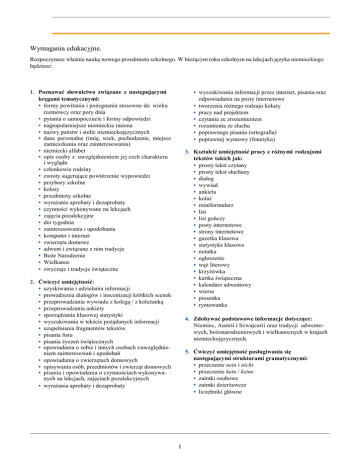 Wymagania edukacyjne. Rozpoczynasz właśnie naukę nowego przedmiotu szkolnego. W bieżącym roku szkolnym na lekcjach języka niemieckiego będziesz: 1. Poznawać słownictwo związane z następującymi kręgami tematycznymi: • formy powitania i pożegnania stosowne do wieku rozmówcy oraz pory dnia • pytania o samopoczucie i formy odpowiedzi • najpopularniejsze niemieckie imiona • nazwy państw i stolic niemieckojęzycznych • dane personalne (imię, wiek, pochodzenie, miejsce zamieszkania oraz zainteresowania) • niemiecki alfabet • opis osoby z uwzględnieniem jej cech charakteru i wyglądu • członkowie rodziny • zwroty sugerujące powtórzenie wypowiedzi • przybory szkolne • kolory • przedmioty szkolne • wyrażanie aprobaty i dezaprobaty • czynności wykonywane na lekcjach • zajęcia pozalekcyjne • dni tygodnia • zainteresowania i upodobania • komputer i internet • zwierzęta domowe • adwent i związane z nim tradycje • Boże Narodzenie • Wielkanoc • zwyczaje i tradycje świąteczne • wyszukiwania informacji przez internet, pisania oraz odpowiadania na posty internetowe • tworzenia różnego rodzaju kolaży • pracy nad projektem • czytania ze zrozumieniem • rozumienia ze słuchu • poprawnego pisania (ortografia) • poprawnej wymowy (fonetyka) 3. Kształcić umiejętność pracy z różnymi rodzajami tekstów takich jak: • prosty tekst czytany • prosty tekst słuchany • dialog • wywiad • ankieta • kolaż • miniformularz • list • list gończy • posty internetowe • strony internetowe • gazetka klasowa • statystyka klasowa • notatka • ogłoszenie • wąż literowy • krzyżówka • kartka świąteczna • kalendarz adwentowy • wiersz • piosenka • rymowanka 2. Ćwiczyć umiejętność: • uzyskiwania i udzielania informacji • prowadzenia dialogów i inscenizacji krótkich scenek • przeprowadzania wywiadu z kolegą / z koleżanką • przeprowadzania ankiety • sporządzania klasowej statystyki • wyszukiwania w tekście pożądanych informacji • uzupełniania fragmentów tekstów • pisania listu • pisania życzeń świątecznych • opowiadania o sobie i innych osobach z uwzględnie niem zainteresowań i upodobań • opowiadania o zwierzętach domowych • opisywania osób, przedmiotów i zwierząt domowych • pisania i opowiadania o czynnościach wykonywa nych na lekcjach, zajęciach pozalekcyjnych • wyrażania aprobaty i dezaprobaty 4. Zdobywać podstawowe informacje dotyczące: Niemiec, Austrii i Szwajcarii oraz tradycji adwento wych, bożonarodzeniowych i wielkanocnych w krajach niemieckojęzycznych. 5. Ćwiczyć umiejętność posługiwania się następującymi strukturami gramatycznymi: • przeczenie nein i nicht • przeczenie kein / keine • zaimki osobowe • zaimki dzierżawcze • liczebniki główne 1 • • • • • • • • • do egzaminu klasyfikacyjnego i sprawdzającego zgodnie ze statutem szkoły. Na semestr otrzymasz ocenę pozytyw ną, gdy opanujesz minimum programowe. Ocena końcowa jest wystawiana na podstawie ocen cząst kowych za każdą sprawność językową: rozumienia ze słu chu, mówienia, czytania ze zrozumieniem i pisania. Będą one sprawdzane za pomocą następujących form: • odpowiedź ustna (skala ocen 1-6) • aktywność na lekcji (skala ocen 1-5) • zadania domowe (skala ocen 1-6) • kartkówka (skala ocen 1-5) z aktualnego materiału • praca klasowa (skala ocen 1-6) - z poszczególnych roz działów tematycznych (4 w ciągu roku) Pamiętaj, że gdy otrzymasz ocenę niedostateczną lub do puszczającą, masz możliwość poprawy (sam musisz zgło sić chęć poprawy nauczycielowi), ocena z poprawy pracy klasowej jest również wpisana do dziennika. W końcowej ocenie zostanie uwzględniona również Twoja postawa na lekcji oraz podejmowanie zadań dodatkowych. • Twoja duża aktywność na zajęciach będzie odnotowy wana w dzienniku, o czym poinformuje Cię nauczyciel. Do odnotowania Twojej aktywności mogą Cię też zgło sić koledzy. • Nauczyciel doceni też Twoją umiejętność pracy w grupie (np. wspólna praca nad projektem), która pomaga kształtować postawę solidarności i współodpowiedzial ności oraz uczy trudnej sztuki kompromisu. • Udział w konkursach przedmiotowych, w zależności od uzyskanych wyników wpływa na podwyższenie oceny końcowej. • Pamiętaj, że dwukrotnie w ciągu semestru możesz zgło sić nieprzygotowanie do zajęć, co wraz z datą będzie odnotowane w dzienniku, ale nie ma wpływu na ocenę końcową. Braki powinnaś / powinieneś wyrównać na na stępną lekcję. • Nieprzygotowanie do pracy klasowej jest przyjmowane jedynie w przypadku dłuższej choroby lub wydarzeń lo sowych potwierdzonych przez rodziców (prawnych opiekunów) lub wychowawcę. Jeśli nie pisałaś / pisałeś pracy klasowej, masz obowiązek napisać ją w terminie wyznaczonym przez nauczyciela. • Nie przewiduje się, abyś dopiero pod koniec semestru po prawiała / poprawiał oceny otrzymane w ciągu semestru. rodzajniki określone i nieokreślone w mianowniku rodzajnik nieokreślony w bierniku bezokolicznik czasowniki regularne i nieregularne czasownik modalny mögen szyk wyrazów w zdaniu oznajmującym zdania pytające forma dopełniacza imion własnych liczba mnoga rzeczowników Szczegółowy wykaz wiadomości i umiejętności na pozio mie podstawowym i ponadpodstawowym jest zawarty w planie wynikowym. Zdobywane umiejętności i poznane wiadomości będą podlegały ocenie. Oceniane będą cztery sprawności języ kowe: • rozumienie ze słuchu, • mówienie, • czytanie ze zrozumieniem, • pisanie. Wszystkie sprawności będą oceniane w zakresach tema tycznych podanych na wstępie. Te zakresy tematyczne są ujęte w 4 rozdziały w Twoim podręczniku. Każdy rozdział kończy się rozbudowaną sekwencją ćwiczeń, która pozwo li Ci samodzielnie określić, czy w satysfakcjonujący Ci