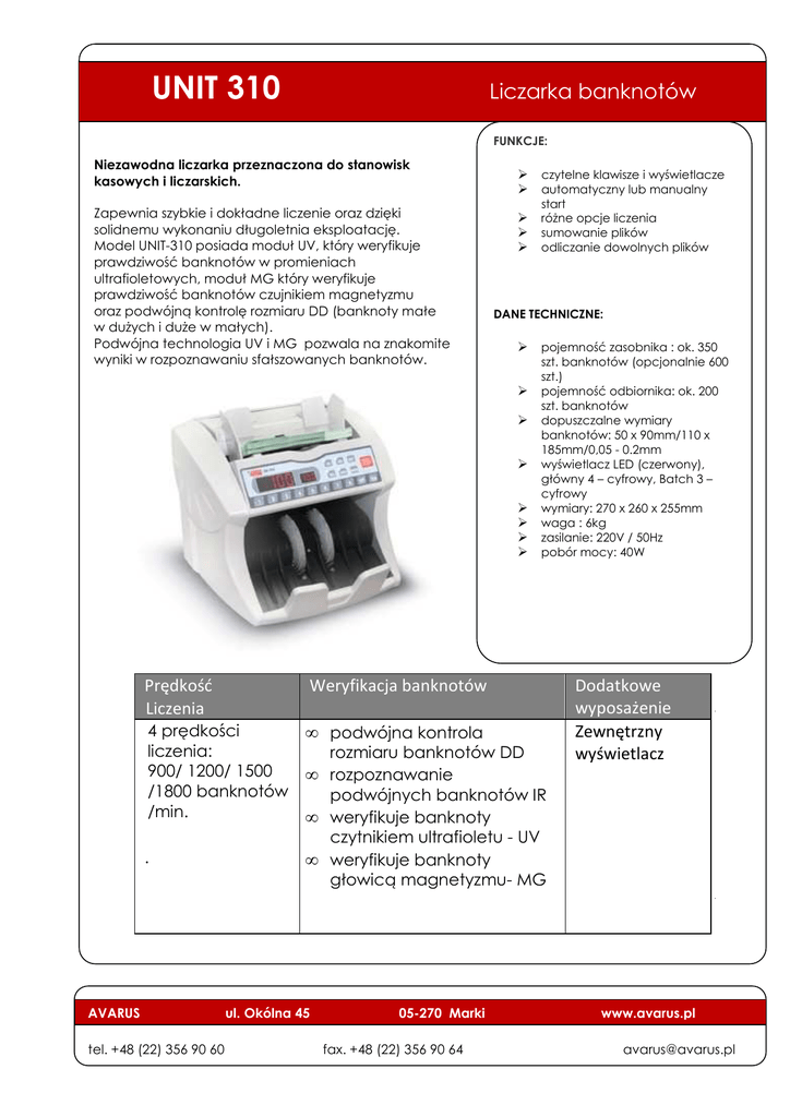 UNIT 310 Liczarka banknotów FUNKCJE: Niezawodna liczarka przeznaczona do stanowisk kasowych i liczarskich. Zapewnia szybkie i dokładne liczenie oraz dzięki solidnemu wykonaniu długoletnia eksploatację. Model UNIT-310 posiada moduł UV, który weryfikuje prawdziwość banknotów w promieniach ultrafioletowych, moduł MG który weryfikuje prawdziwość banknotów czujnikiem magnetyzmu oraz podwójną kontrolę rozmiaru DD (banknoty małe w duŜych i duŜe w małych). Podwójna technologia UV i MG pozwala na znakomite wyniki w rozpoznawaniu sfałszowanych banknotów. DANE TECHNICZNE: Prędkość Liczenia Weryfikacja banknotów 4 prędkości liczenia: 900/ 1200/ 1500 /1800 banknotów /min. • podwójna kontrola . AVARUS tel. +48 (22) 356 90 60 czytelne klawisze i wyświetlacze automatyczny lub manualny start róŜne opcje liczenia sumowanie plików odliczanie dowolnych plików pojemność zasobnika : ok. 350 szt. banknotów (opcjonalnie 600 szt.) pojemność odbiornika: ok. 200 szt. banknotów dopuszczalne wymiary banknotów: 50 x 90mm/110 x 185mm/0,05 - 0.2mm wyświetlacz LED (czerwony), główny 4 – cyfrowy, Batch 3 – cyfrowy wymiary: 270 x 260 x 255mm waga : 6kg zasilanie: 220V / 50Hz pobór mocy: 40W rozmiaru banknotów DD • rozpoznawanie podwójnych banknotów IR • weryfikuje banknoty czytnikiem ultrafioletu - UV • weryfikuje banknoty głowicą magnetyzmu- MG ul. Okólna 45 05-270 Marki fax. +48 (22) 356 90 64 Dodatkowe wyposażenie Zewnętrzny wyświetlacz www.avarus.pl [email protected]