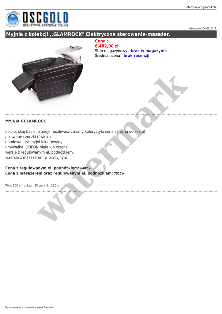 Informacje o produkcie Utworzono 04-03-2017 Myjnia z kolekcji ,,GLAMROCK" Elektryczne sterowanie-masażer. Cena : 6.482,00 zł MYJNIA GGLAMROCK er m ar k Stan magazynowy : brak w magazynie Średnia ocena : brak recenzji obicie: skaj basic (istnieje mozliwość zmiany kolorystyki cena zalezna od skaju) pikowane czoczki (ćwieki) obudowa - tył myjni lakierowany umywalka: ODEON biała lub czarna wersja z regulowanym el. podnózkiem. waersja z masazerem wibracyjnym at Cena z regulowanym el. podnózkiem: 6482 zł Cena z masazerem oraz regulowanym el. podnózkiem: 7527zł w Wys. 100 cm x Szer. 63 cm x Gł. 130 cm Wygenerowano w programie www.oscGold.com
