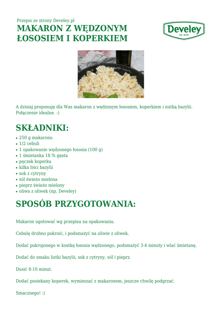 Przepis ze strony Develey.pl MAKARON Z WĘDZONYM ŁOSOSIEM I KOPERKIEM A dzisiaj proponuję dla Was makaron z wędzonym łososiem, koperkiem i nutką bazylii. Połączenie idealne. :) SKŁADNIKI: ● ● ● ● ● ● ● ● ● ● 250 g makaronu 1/2 cebuli 1 opakowanie wędzonego łososia (100 g) 1 śmietanka 18 % gęsta pęczek koperku kilka liści bazylii sok z cytryny sól świeżo mielona pieprz świeżo mielony oliwa z oliwek (np. Develey) SPOSÓB PRZYGOTOWANIA: Makaron ugotować wg przepisu na opakowaniu. Cebulę drobno pokroić, i podsmażyć na oliwie z oliwek. Dodać pokrojonego w kostkę łososia wędzonego, podsmażyć 3-4 minuty i wlać śmietanę. Dodać do smaku listki bazylii, sok z cytryny, sól i pieprz. Dusić 8-10 minut. Dodać posiekany koperek, wymieszać z makaronem, jeszcze chwilę podgrzać. Smacznego! :) Więcej przepisów na trufelkowe inspiracje.