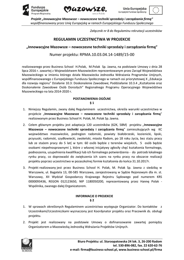 Projekt „Innowacyjne Mazowsze – nowoczesne techniki sprzedaży i zarządzania firmą” współfinansowany przez Unię Europejską w ramach Europejskiego Funduszu Społecznego Załącznik nr 8 do Regulaminu rekrutacji uczestników REGULAMIN UCZESTNICTWA W PROJEKCIE „Innowacyjne Mazowsze – nowoczesne techniki sprzedaży i zarządzania firmą” Numer projektu: RPMA.10.03.04.14-1489/15-00 realizowanego przez Business School H.Polak, M.Polak Sp. Jawna, na podstawie Umowy z dnia 28 lipca 2016 r. zawartej z Województwem Mazowieckim reprezentowanym przez Zarząd Województwa Mazowieckiego w imieniu którego działa Mazowiecka Jednostka Wdrażania Programów Unijnych, współfinansowanego z Europejskiego Funduszu Społecznego w ramach osi priorytetowej X „Edukacja dla rozwoju regionu” Działanie 10.3: Doskonalenie Zawodowe; Poddziałanie 10.3.4 „Kształcenie oraz Doskonalenie Zawodowe Osób Dorosłych” Regionalnego Programu Operacyjnego Województwa Mazowieckiego na lata 2014-2020 r. POSTANOWIENIA OGÓLNE §1 1. Niniejszy Regulamin, zwany dalej Regulaminem uczestnictwa, określa warunki uczestnictwa w projekcie „Innowacyjne Mazowsze – nowoczesne techniki sprzedaży i zarządzania firmą” realizowanym przez Business School H. Polak, M. Polak Sp. Jawna. 2. Celem głównym projektu jest adaptacja 120 uczestników (62K, 58M) projektu „Innowacyjne Mazowsze – nowoczesne techniki sprzedaży i zarządzania firmą” zamieszkujących wg KC województwo mazowieckie, podregion radomski, powiaty białobrzeski, kozienicki, lipski, przysuski, radomski, szydłowiecki, zwoleński, miasto Radom, po 18 roku życia, bez stażu pracy lub ze stażem pracy do 5 lat( w tym: 60 osób będzie z terenów wiejskich, 5 osób będzie osobami niepełnosprawnymi ), które z własnej inicjatywy zgłosiły chęć kształcenia formalnego, podnoszenia, uzupełnienia kwalifikacji lub ich formalnego potwierdzenia - do potrzeb lokalnego rynku pracy, co doprowadzi do zwiększenia ich szans na rynku pracy na obszarze realizacji projektu poprzez uczestnictwo w pozaszkolnej formie kształcenia do końca 31.10.2017r. 3. Projekt realizowany jest przez Business School H. Polak, M. Polak Sp. Jawna z siedzibą w Warszawie, ul. Bagatela 13, 00-585 Warszawa, zarejestrowaną w Sądzie Rejonowym dla m. st. Warszawy, XII Wydział Gospodarczy Krajowego Rejestru Sądowego pod numerem KRS 0000093436, REGON 012123650, NIP 1180050200, reprezentowaną przez Hannę Polak Wspólnika, zwanego dalej Organizatorem. INFORMACJE O PROJEKCIE §2 1. W sprawach określonych Regulaminem uczestnictwa występuje Organizator. Do kontaktów z Uczestnikami/Uczestniczkami wyznaczony jest Koordynator projektu oraz Pracownik ds. obsługi projektu. 2. Projekt jest realizowany na podstawie Umowy o dofinansowanie zawartej pomiędzy Organizatorem a Mazowiecką Jednostką Wdrażania Projektów Unijnych. Biuro Projektu: ul. Staroopatowska 24 lok. 3, 26-200 Radom tel. 530-896-082, fax. 22 620-62-76 e-mail: [email protected], www.business-school.pl/firma Projekt „Innowacyjne Mazowsze – nowoczesne techniki sprzedaży i zarządzania firmą” współfinansowany przez Unię Europejską w ramach Europejskiego Funduszu Społecznego §3 1. Projekt jest realizowany w okresie od 01 września 2016r. do dnia 31 października 2017 r. na terenie województwa mazowieckiego, podregion radomski, powiaty białobrzeski, kozienicki, lipski, przysuski, radomski, szydłowiecki, zwoleński, miasto Radom. 2. Organizator utworzył Biuro projektu, które znajduje się w Radomiu przy ulicy Staroopatowskiej 24 lok. 3. WARUNKI UCZESTNICTWA W PROJEKCIE §4 1. Wsparciem w ramach projektu będą objęte osoby, które z własnej inicjatywy zgłosiły chęć kształcenia formalnego, podnoszenia, uzupełnienia kwalifikacji lub ich formalnego potwierdzenia: a) zamieszkujące na terenie województwa mazowieckiego, podregion radomski, powiaty białobrzeski, kozienicki, lipski, przysuski, radomski, szydłowiecki, zwoleński, miasto Radom b) po 18 roku życia c) bez stażu pracy d) ze stażem pracy do 5 lat e) zamieszkują tereny wiejskie – 60 osób f) osoby niepełnosprawne – 5 osób Weryfikacja nastąpi na podstawie przedłożonych oświadczeń/zaświadczeń. 1. Grupa docelowa projektu liczy 120 osób, w tym 62 kobiety i 58 mężczyzn, 50% osób będzie zamieszkiwać tereny wiejskie, 4% osób będzie osobami niepełnosprawnymi. 2. Nabór będzie prowadzony od września 2016r. w sposób ciągły, otwarty i ogólny. 3. Uczestnictwo w projekcie jest bezpłatne. 4. Uczestnictwo w projekcie rozpoczyna się w dniu udzielenia pierwszego wsparcia (np. początek zajęć) co nie uchybia wzajemnym obowiązkom stron wynikającym z umowy oraz deklaracji uczestnictwa obowiązującym od dnia zawarcia porozumienia. §5 1. Wsparcie w ramach Projektu obejmuje: a) szkolenie E-commerce – nowoczesne metody sprzedaży przez Internet – będzie zorganizowane dla 60 uczestników. Program szkolenia obejmuje łącznie 164h, w tym: strona www – rodzaje, obsługa administracja – 12h sklep internetowy – 48h reklama i marketing w Internecie – 24h ECDL S6 Web Editing – 40h ECDL Współpraca on-line – 40h Biuro Projektu: ul. Staroopatowska 24 lok. 3, 26-200 Radom tel. 530-896-082, fax. 22 620-62-76 e-mail: [email protected], www.business-school.pl/firma Projekt „Innowacyjne Mazowsze – nowoczesne techniki sprzedaży i zarządzania firmą” współfinansowany przez Unię Europejską w ramach Europejskiego Funduszu Społecznego b) szkolenie Księgowy z arkuszami kalkulacyjnymi w zarządzaniu - będzie zorganizowane dla 60 uczestników. Program szkolenia obejmuje łącznie 200 h, w tym: ECDL B4 arkusze kalkulacyjne – 30h ECDL A2 zaawansowane arkusze kalkulacyjne – 60h Księgowość z elementami kadry i płace przy wykorzystaniu arkuszy kalkulacyjnych – 90h Analiza działalności firmy z wykorzystaniem arkuszy kalkulacyjnych - 20h 2. W ramach szkoleń uczestnik projektu otrzyma: a) catering