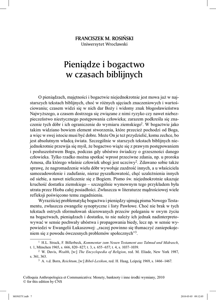 FRANCISZEK M. ROSIÑSKI Uniwersytet Wroc³awski Pieni¹dze i bogactwo w czasach biblijnych O pieniądzach, majętności i bogactwie niejednokrotnie jest mowa już w najstarszych tekstach biblijnych, choć w różnych ujęciach znaczeniowych i wartościowaniu; czasem widzi się w nich dar Boży i widomy znak błogosławieństwa Najwyższego, a czasem dostrzega się związane z nimi ryzyko czy nawet niebezpieczeństwo nieetycznego postępowania człowieka; zarazem podkreśla się znaczenie tych dóbr i ich ograniczenie do wymiaru ziemskiego1. W bogactwie jako takim widziano bowiem element stworzenia, które przecież pochodzi od Boga, a więc w swej istocie musi być dobre. Może On je też przydzielić, komu zechce, bo jest absolutnym władcą świata. Szczególnie w starszych tekstach biblijnych niejednokrotnie przewija się myśl, że bogactwo wiąże się z prawym postępowaniem i posłuszeństwem Bogu, podczas gdy ubóstwo świadczy o grzeszności danego człowieka. Tylko rzadko można spotkać wprost przeciwne zdania, np. u proroka Amosa, dla którego właśnie człowiek ubogi jest uczciwy2. Zdawano sobie także sprawę, że nagromadzenie wielu dóbr wywołuje zazdrość innych, a u właściciela samozadowolenie i zadufanie, nieraz pyszałkowatość, chęć uzależnienia innych od siebie, a nawet nieliczenie się z Bogiem. Pismo św. niejednokrotnie ukazuje kruchość dostatku ziemskiego – szczególnie wymownym tego przykładem była utrata przez Hioba całej posiadłości. Zwłaszcza w literaturze mądrościowej wiele refleksji poświęcono temu zagadnieniu. Wyraziściej problematykę bogactwa i pieniędzy ujmują pisma Nowego Testamentu, zwłaszcza ewangelie synoptyczne i listy Pawłowe. Choć nie brak w tych tekstach ostrych sformułowań skierowanych przeciw poleganiu w swym życiu na bogactwach, pieniądzach i dostatku, to nie należy ich jednak nadinterpretowywać w sensie pochwały ubóstwa i propagowania biedy, lecz np. w sensie wypowiedzi w Ewangelii Łukaszowej: „raczej powinno się tłumaczyć zaniepokojeniem się z powodu ówczesnych problemów społecznych”3. 1 H.L. Strack, F. Billerbeck, Kommentar zum Neuen Testament aus Talmud und Midrasch, t. 1, München 1965, s. 666, 820–827; t. 3, s. 655–657; t. 4, s. 1037–1039. 2 W. Davis, Wealth, [w:] The Encyclopedia of Religion, red. M. Eliade, New York 1987, s. 361, 363. 3 A. v.d. Born, Reichtum, [w:] Bibel-Lexikon, red. H. Haag, Leipzig 1969, s. 1466–1467. Colloquia Anthropologica et Communicativa: Monety, banknoty i inne środki wymiany, 2010 © for this edition by CNS MONETY.indb 7 2010-05-05 09:12:05 8 FRANCISZEK M. ROSIÑSKI Trzeba jednak zauważyć, że kwestie związane z pieniędzmi i bogact wem nie są szczególnie często omawiane w księgach biblijnych, gdyż nie należą do głównych wątków historii zbawienia; np. w Listach Janowych czy Judy Tadeusza nawet nie ma słowa „pieniądze” czy „bogactwo” i ich derywatów. Wskazuje na to m.in. częstość występowania tych słów w Piśmie św.: termin „bogactwo” można spotkać 153 razy, „bogacz” 27 razy, „bogaty” 78 razy, „majątek” 46 razy, „majętność” 21 razy, „skarb” 77 razy, „skarbiec” 59 razy, „mamona” 4 razy, „pieniądz” 156 razy. Częściej jest mowa o „złocie” – 359 razy, słowo „złoty” zaś reprezentowane jest 197 razy. „Srebro”, choć było w zdecydowanie częstszym użytku, wymienione jest 274 razy, „srebrny” w 96 przypadkach, „srebrnik” zaś 10 razy. Są wymieniane też nazwy ówczesnych monet: „sykl” 130 razy, „denar” 17 razy, „talent” 77 razy, „mina” 18 razy, „drachma” 11 razy, „stater” raz, „as” dwukrotnie4. Jak widać, autorzy biblijni nie byli obojętni na sprawy finansowe, majątkowe, ekonomiczne; konteksty zaś, w których jest o nich mowa, są bardzo zróżnicowane. Podobnie wartościowanie etyczne – w dużej mierze zależnie od danej sytuacji i zagadnienia – może być pozytywne, neutralne, często moralnie naganne, złe i powszechnie potępiane. Trzeba jednakże nadmienić, że w księgach świętych, choć nieraz jest w nich mowa o pieniądzach i bogactwie, to jednak nie poświęcono tej tematyce dłuższego wywodu dyskursywnego; są tylko poszczególne wypowiedzi, niekiedy w formie bardziej rozwiniętej refleksji czy przypowieści, które wymagają jednak bardzo oględnej interpretacji, uwzględniającej konkretnych adresatów, kontekst historyczny i dialogowy, oraz bardzo uważnej analizy. Nie można ich też nadinterpretowywać czy zbytnio ekstrapolować pewnych wskazań. To, co obowiązywało uczniów, niekoniecznie odnosi się do „rzesz”. Jak słusznie zauważa H. Daniel-Rops, choć w Biblii nie ma usystematyzowanego prawodawstwa odnoszącego się do różnych sfer życia ekonomicznego i finansowego, „to jednak jego przepisy są dość wyraźne, by móc z nich wysnuć zasady moralne w odniesieniu do pieniądza oraz interesów. I rabbiowie nie omieszkali tego uczynić. Toteż Talmud formułuje wiele przepisów z tej dziedziny, zwłaszcza traktaty, które powstały w Babilonie, wielkim ośrodku handlowym”5. W tekstach biblijnych jest mowa o różnych walorach i kategoriach bogactwa, nie tylko w sensie wartości wymiernych, materialnych, lecz pełni różnego rodzaju dóbr życiowych, wśród których z czasem wyróżniano np. dobra doczesne, techniczne, prestiżowe, duchowe; często dodawano konkretną specyfikację – np. bogaty w mądrość, łaskę, sławę albo „obfitować będziesz w srebro i złoto” 4 Dane liczbowe dotyczą cytacji biblijnych w: J. Flis, Konkordancja Starego i Nowego Testamentu do Biblii Tysiąclecia, Warszawa 1991. 5 H. Daniel-Rops, Życie codzienne w Palestynie w czasach Chrystusa, Warszawa 1994, s. 227. Colloquia Anthropologica et Communicativa: Monety, banknoty i inne środki wymiany, 2010 © for this edition by CNS MONETY.indb 8 2010-05-05 09:12:05 Pieni¹dze i bogactwo w czasach biblijn
