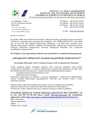 INSTYTUT NA RZECZ EKOROZWOJU INSTITUTE FOR SUSTAINABLE DEVELOPMENT A MEMBER OF EUROPEAN ENVIRONMENTAL BUREAU W interesie przyszłych pokoleń / In the interest of the future generations ul. Nabielaka 15 lok. 1 00-743 Warszawa/Warsaw POLAND www.ine-isd.org.pl www.chronmyklimat.pl www.natura2000.org.pl Tel./Phone: Tel./Phone: Tel./Phone: Fax.: (48-22) 851-04-02 (48-22) 851-04-03 (48-22) 851-04-04 (48-22) 851-04-00 E-mail: [email protected] Szanowni Państwo, W grudniu 2009 roku Parlament Europejski i Rada Europejska zatwierdziły duŜą nowelizację Dyrektywy o charakterystyce energetycznej budynków, tzw: EPBD (2002/91/EC). Przewiduje ona, Ŝe od 2018 roku budynki uŜyteczności publicznej, a od 2020 roku wszystkie nowe budynki będą musiały spełniać standardy zeroemisyjności. Jednocześnie zaostrzono kryteria dotyczące efektywnej energetycznie renowacji istniejących budynków oraz wydawania certyfikatów energetycznych. W związku z tym zapraszamy Państwa do uczestnictwa w panelu dyskusyjnym pt: „Jak poprawić efektywność energetyczną polskiego budownictwa?” 26 kwietnia 2010, godz. 10-13, Centrum Prasowe PAP, ul. Bracka 6/8, Warszawa Celem spotkania będzie wskazanie narzędzi, które zapewnią spełnienie przez Polskę oczekiwanych standardów w zakresie efektywności energetycznej budynków do 2020 roku. Rozwiązań będziemy poszukiwać w ramach dwóch komplementarnych tematów: - wymagań technicznych dla budynków oraz - planowania przestrzennego. Serdecznie zapraszamy do dyskusji z naszymi panelistami z Ministerstwa Infrastruktury, Instytut Techniki Budowlanej, przedsiębiorstw: ISOVER oraz Dworek Polski, a takŜe Zielonego Instytutu. Podczas debaty zapewniony będzie poczęstunek. Udział w spotkaniu jest bezpłatny. Honorowy patronat nad wydarzeniem sprawuje Ministerstwo Infrastruktury. Wydarzenie zostało zorganizowane przy wsparciu European Climate Foundation. ___________________________________________________ Warunkiem udziału jest wysłanie niniejszego zgłoszenia do dnia 12.04.2010 r. na nr fax: (22) 851 04 00 lub adres e-mail: [email protected] lub wypełnienie zgłoszenia on-line http://ine.improve.pl/lang/pl/page/konferencje/id/10/view/4/: Imię i nazwisko: ................................................................................................................ Nazwa organizacji: ........................................................................................................... Adres: ................................................................................................................................ Telefon, fax, e-mail: .......................................................................................................... Program debaty Jak poprawić efektywność energetyczną polskiego budownictwa? 26 kwietnia 2010, godz. 10-13, Centrum Prasowe PAP, ul. Bracka 6/8, Warszawa Paneliści: Olgierd Dziekoński Podsekretarz stanu ds. budownictwa w Ministerstwie Infrastruktury Henryk Kwapisz Specjalista Saint-Gobain ISOVER Polska, członek Komitetu Sterującego Polskiej Platformy Technologicznej Budownictwa Marek Kaproń Prezes Instytutu Techniki Budowlanej Jacek Koziński Prezes i właściciel firmy deweloperskiej Dworek Polski Ludomir Duda Członek Rady Programowej Zielonego Instytutu Moderator: Dariusz Koc – Krajowa Agencja Poszanowania Energii S.A. Przebieg debaty: 1. 10:00-10:15 Powitanie 2. Panel I – Wymagania techniczne dla budynków 10:15-10:40 Wypowiedzi panelistów 10:40-11:15 Dyskusja 3. Panel II – Planowanie przestrzenne w służbie efektywności energetycznej 11:15-11:40 Wypowiedzi panelistów 11:40-12:15 Dyskusja 4. 12:15-13:00 Poczęstunek Patronat medialny: www.ChrońmyKlimat.pl O PANELISTACH mgr inŜ. arch. Olgierd Dziekoński – ukończył Wydział Architektury Politechniki Wrocławskiej, Salzburg Seminar, Harvard Graduate School of Design. Wiceprezydent Miasta st. Warszawy w latach 1990-1994, 1999-2000. Współtworzył warszawską samorządność po demokratycznym przełomie w 1990 roku. Twórca i pierwszy prezes Agencji Rozwoju Komunalnego, wspierającej samorządy w Polsce (ARKA). W latach 2000-2001 Podsekretarz Stanu w Ministerstwie Rozwoju Regionalnego i Budownictwa. Członek wielu organizacji zawodowych m.in.: Krajowej Rady Izby Architektów, Zarządu Rady Architektów Europy, Zarządu Fundacji Małych i Średnich Przedsiębiorstw, Zarządu Unii Metropolii Polskich (do 2006 roku), Komitetu Przestrzennego Zagospodarowania Kraju PAN (do 2005 roku). Obecnie Podsekretarz Stanu ds. budownictwa w Ministerstwie Infrastruktury. mgr inŜ. Henryk Kwapisz - Ukończył Wydział InŜynierii Lądowej Politechniki Warszawskiej. Obecnie pracuje w SAINT-GOBAIN ISOVER POLSKA, będąc jednocześnie członkiem Komitetów Technicznych PKN – ds. Akustyki Architektonicznej, ds. Ochrony Cieplnej Budynków i ds. Wyrobów do Izolacji Cieplnej w Budownictwie, działa aktywnie w Europejskim Stowarzyszeniu Producentów Wyrobów z Wełny Mineralnej EURIMA. Jest członkiem Komitetu Sterującego Polskiej Platformy Technologicznej Budownictwa. mgr inŜ. Marek Kaproń - Absolwent Wydziału InŜynierii Lądowej Politechniki Warszawskiej. Pracował w Polskiej Akademii Nauk, a następnie w Centralnym Ośrodku BadawczoProjektowym Budownictwa Ogólnego (COBPBO). Uczestniczył w szeregu prac badawczych dotyczących budynków wznoszonych metodami uprzemysłowionymi. Był współautorem wytycznych, instrukcji i opracowań badawczo-konstrukcyjnych. W latach 1989 - 1992 pełnił funkcję dyrektora Biura Współpracy z Zagranicą Ministerstwa Gospodarki Przestrzennej i Budownictwa, sprawując nadzór nad zapleczem badawczym resortu. W 1992 roku rozpoczął pracę z francuskim holdingiem THION jako doradca, a po utworzeniu Spółki THION Polska Sp. z o.o. jako dyrektor. Brał jej udział w procesie restrukturyzacji Pracowni Konserwacji Zabytków (Biuro Handlu Zagranicznego) pełniąc funkcję wiceprezesa Zarządu Spółki. Obecnie dyrektor In