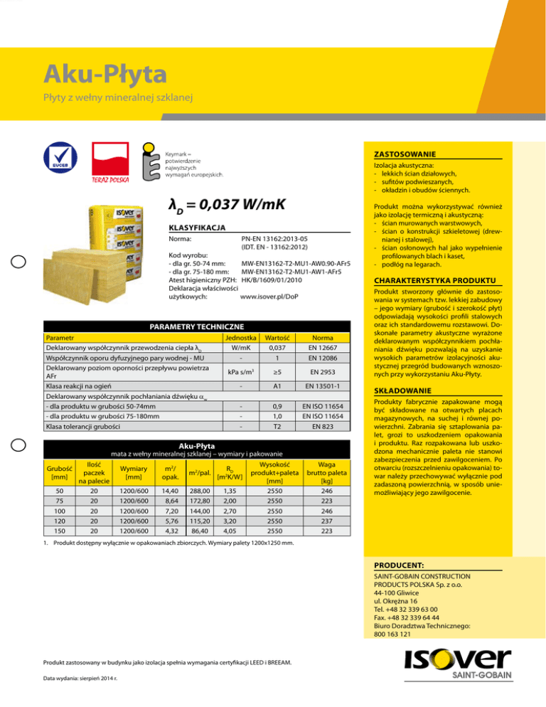 karty_produktoweVI_24.indd Aku-Płyta Płyty z wełny mineralnej szklanej ZASTOSOWANIE Izolacja akustyczna: - lekkich ścian działowych, - sufitów podwieszanych, - okładzin i obudów ściennych. λD = 0,037 W/mK KLASYFIKACJA Norma: PN-EN 13162:2013-05 (IDT. EN - 13162:2012) Kod wyrobu: - dla gr. 50-74 mm: MW-EN13162-T2-MU1-AW0.90-AFr5 - dla gr. 75-180 mm: MW-EN13162-T2-MU1-AW1-AFr5 Atest higieniczny PZH: HK/B/1609/01/2010 Deklaracja właściwości użytkowych: www.isover.pl/DoP PARAMETRY TECHNICZNE Parametr Deklarowany współczynnik przewodzenia ciepła λD Współczynnik oporu dyfuzyjnego pary wodnej - MU Deklarowany poziom oporności przepływu powietrza AFr Klasa reakcji na ogień Deklarowany współczynnik pochłaniania dźwięku aw - dla produktu w grubości 50-74mm - dla produktu w grubości 75-180mm Klasa tolerancji grubości Jednostka W/mK - Wartość 0,037 1 Norma EN 12667 EN 12086 kPa s/m3 ≥5 EN 2953 - A1 EN 13501-1 - 0,9 1,0 T2 EN ISO 11654 EN ISO 11654 EN 823 Aku-Płyta mata z wełny mineralnej szklanej – wymiary i pakowanie Grubość [mm] 50 75 100 120 150 Ilość paczek na palecie 20 20 20 20 20 Wymiary [mm] m2/ opak. m2/pal. RD [m K/W] 1200/600 1200/600 1200/600 1200/600 1200/600 14,40 8,64 7,20 5,76 4,32 288,00 172,80 144,00 115,20 86,40 1,35 2,00 2,70 3,20 4,05 2 Wysokość produkt+paleta [mm] 2550 2550 2550 2550 2550 Waga brutto paleta [kg] 246 223 246 237 223 Produkt można wykorzystywać również jako izolację termiczną i akustyczną: - ścian murowanych warstwowych, - ścian o konstrukcji szkieletowej (drewnianej i stalowej), - ścian osłonowych hal jako wypełnienie profilowanych blach i kaset, - podłóg na legarach. Charakterystyka produktu Produkt stworzony głównie do zastosowania w systemach tzw. lekkiej zabudowy – jego wymiary (grubość i szerokość płyt) odpowiadają wysokości profili stalowych oraz ich standardowemu rozstawowi. Doskonałe parametry akustyczne wyrażone deklarowanym współczynnikiem pochłaniania dźwięku pozwalają na uzyskanie wysokich parametrów izolacyjności akustycznej przegród budowanych wznoszonych przy wykorzystaniu Aku-Płyty. SKŁADOWANIE Produkty fabrycznie zapakowane mogą być składowane na otwartych placach magazynowych, na suchej i równej powierzchni. Zabrania się sztaplowania palet, grozi to uszkodzeniem opakowania i produktu. Raz rozpakowana lub uszkodzona mechanicznie paleta nie stanowi zabezpieczenia przed zawilgoceniem. Po otwarciu (rozszczelnieniu opakowania) towar należy przechowywać wyłącznie pod zadaszoną powierzchnią, w sposób uniemożliwiający jego zawilgocenie. 1. Produkt dostępny wyłącznie w opakowaniach zbiorczych. Wymiary palety 1200x1250 mm. PRODUCENT: SAINT-GOBAIN CONSTRUCTION PRODUCTS POLSKA Sp. z o.o. 44-100 Gliwice ul. Okrężna 16 Tel. +48 32 339 63 00 Fax. +48 32 339 64 44 Biuro Doradztwa Technicznego: 800 163 121 Produkt zastosowany w budynku jako izolacja spełnia wymagania certyfikacji LEED i BREEAM. Data wydania: sierpień 2014 r.