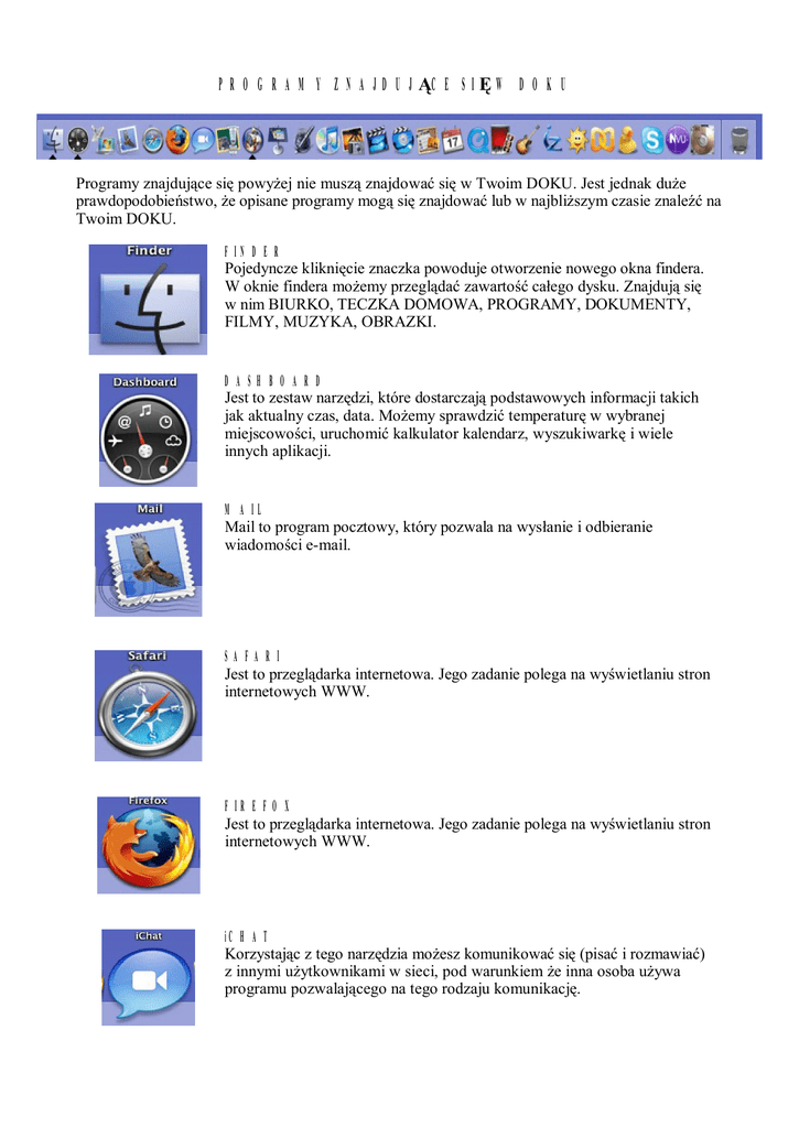 PROGRAMY ZNAJDUJ CE SI W DOKU Programy znajduj ce si powy ej nie musz znajdowa si w Twoim DOKU. Jest jednak du e prawdopodobie stwo, e opisane programy mog si znajdowa lub w najbli szym czasie znale Twoim DOKU. na FINDER Pojedyncze klikni cie znaczka powoduje otworzenie nowego okna findera. W oknie findera mo emy przegl da zawarto ca ego dysku. Znajduj si w nim BIURKO, TECZKA DOMOWA, PROGRAMY, DOKUMENTY, FILMY, MUZYKA, OBRAZKI. DASHBOARD Jest to zestaw narz dzi, które dostarczaj podstawowych informacji takich jak aktualny czas, data. Mo emy sprawdzi temperatur w wybranej miejscowo ci, uruchomi kalkulator kalendarz, wyszukiwark i wiele innych aplikacji. MAIL Mail to program pocztowy, który pozwala na wys anie i odbieranie wiadomo ci e-mail. SAFARI Jest to przegl darka internetowa. Jego zadanie polega na wy wietlaniu stron internetowych WWW. FIREFOX Jest to przegl darka internetowa. Jego zadanie polega na wy wietlaniu stron internetowych WWW. iCHAT Korzystaj c z tego narz dzia mo esz komunikowa si (pisa i rozmawia ) z innymi u ytkownikami w sieci, pod warunkiem e inna osoba u ywa programu pozwalaj cego na tego rodzaju komunikacj . NEOOFFICE Jest to darmowy edytor tekstu. Program NeoOffice Writer umo liwia projektowanie i tworzenie dokumentów tekstowych zawieraj cych grafik , tabele lub wykresy. Dokumenty mo na zapisywa w ró nych formatach, w tym: Microsoft Word, HTML, a nawet PDF firmy Adobe KEYNOTE Program do tworzenia prezentacji o filmowej jako ci. PAGES To prosty w obs udze, a jednocze nie bogaty w funkcje edytor tekstów, za pomoc którego mo na tworzy wspaniale wygl daj ce dokumenty, takie jak listy, ulotki, plakaty, biuletyny czy broszury sk adane na trzy cz ci. iTUNES Program pozwala na pobieranie utworów muzycznych z p yty CD na dysk komputera, dzi ki czemu mo na je odtwarza bez konieczno ci ka dorazowego wk adania p yty CD. Umo liwia równie tworzenie p yt z asnymi kolekcjami. iPHOTO Jest to narz dzie pozwalaj ce porz dkowanie zdj , obrazków, clip-artów, rysunków, ilustracji oraz innych plików graficznych. Program pozwala na tworzenie albumów, pokazów slajdów. Program wyposa ony jest równie w proste narz dzie do obróbki zdj . IMOVIE HD Jest to program do monta u filmów. Film mo na pobra z kamery doda efekty specjalne, przej cia, muzyk . Film mo na nast pnie zapisa w pliku lub na p ycie DVD. iDVD Program oferuje mo liwo sk adania filmów i zdj mo na nagra jako film DVD. w materia który iWEB To program do tworzenia i edycji stron WWW. iCAL Program pozwala na tworzenie wielu kolorowych terminarzy, list, spraw do za atwienia i spisów wa nych wydarze . QUICKTIME PLAYER Jest to program do odtwarzania filmów. PHOTO BOOTH Program PhotoBooth, czyli "kiosk fotograficzny", daje mo liwo natychmiastowego pstrykania zdj osoby siedz cej przed ekranem, przy czym sam ekran na sekund zmienia si w „lamp b yskow ”. Do czone filtry pozwalaj na tworzenie wykrzywionych karykatur fotografowanego obiektu. GARAGEBAND Jest to narz dzie przeznaczone do komponowania i nagrywania muzyki. SKYPE Za pomoc tego programu mo na rozmawia , s ucha , ogl da , czyta i pisa do dowolnych osób, na ca ym wiecie, nie przejmuj c si odleg ci i czasem. Po czenia w ramach programu skype s bezp atne. KOSZ Kosz to element, do którego wrzucamy wszystkie niepotrzebne