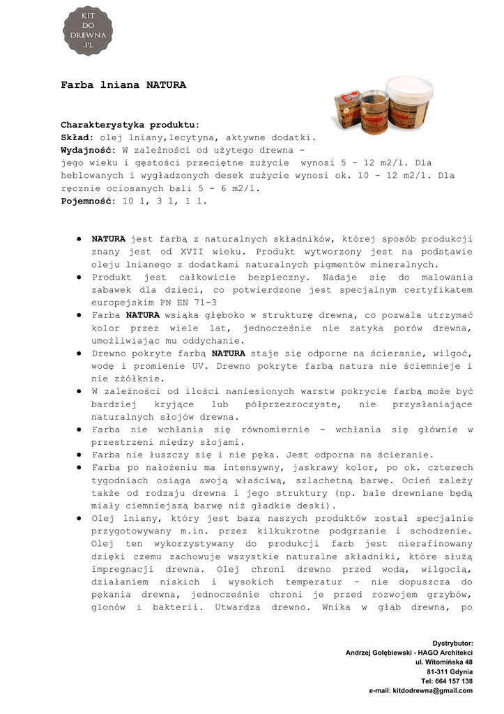 Farba lniana NATURA Charakterystyka produktu: Skład: olej lniany,lecytyna, aktywne dodatki. Wydajność: W zależności od użytego drewna jego wieku i gęstości przeciętne zużycie wynosi 5 12 m2/l. Dla heblowanych i wygładzonych desek zużycie wynosi ok. 10 12 m2/l. Dla ręcznie ociosanych bali 5 6 m2/l. Pojemność: 10 l, 3 l, 1 l. ● NATURA jest farbą z naturalnych składników, której sposób produkcji znany jest od XVII wieku. Produkt wytworzony jest na podstawie oleju lnianego z dodatkami naturalnych pigmentów mineralnych. ● Produkt jest całkowicie bezpieczny. Nadaje się do malowania zabawek dla dzieci, co potwierdzone jest specjalnym certyfikatem europejskim PN EN 713 ● Farba NATURA wsiąka głęboko w strukturę drewna, co pozwala utrzymać kolor przez wiele lat, jednocześnie nie zatyka porów drewna, umożliwiając mu oddychanie. ● Drewno pokryte farbą NATURA staje się odporne na ścieranie, wilgoć, wodę i promienie UV. Drewno pokryte farbą natura nie ściemnieje i nie zżółknie. ● W zależności od ilości naniesionych warstw pokrycie farbą może być bardziej kryjące lub półprzezroczyste, nie przysłaniające naturalnych słojów drewna. ● Farba nie wchłania się równomiernie wchłania się głównie w przestrzeni między słojami. ● Farba nie łuszczy się i nie pęka. Jest odporna na ścieranie. ● Farba po nałożeniu ma intensywny, jaskrawy kolor, po ok. czterech tygodniach osiąga swoją właściwą, szlachetną barwę. Ocień zależy także od rodzaju drewna i jego struktury (np. bale drewniane będą miały ciemniejszą barwę niż gładkie deski). ● Olej lniany, który jest bazą naszych produktów został specjalnie przygotowywany m.in. przez kilkukrotne podgrzanie i schodzenie. Olej ten wykorzystywany do produkcji farb jest nierafinowany dzięki czemu zachowuje wszystkie naturalne składniki, które służą impregnacji drewna. Olej chroni drewno przed wodą, wilgocią, działaniem niskich i wysokich temperatur nie dopuszcza do pękania drewna, jednocześnie chroni je przed rozwojem grzybów, glonów i bakterii. Utwardza drewno. Wnika w głąb drewna, po Dystrybutor: Andrzej Gołębiewski HAGO Architekci ul. Witomińska 48 81311 Gdynia Tel: 664 157 138 email: [email protected] wyschnięciu powierzchnia nie jest tłusta, pozostaje delikatnie aksamitna w dotyku Zastosowanie: ● na zewnątrz i do wewnątrz ● do gładkich powierzchni desek i bali ● fasady domów, meble ogrodowe, architektura ogrodowa, altany, płoty, balustrady, ● meble, okna, framugi, okiennice, drzwi, zabawki Sposób użycia: Farba powinna być gruntownie wymieszana przed rozpoczęciem pracy jak i w trakcie jej trwania. Drewno powinno być wcześniej przygotowane i, w razie potrzeby, wyrównane drobnym papierem ściernym. Farba powinna być nakładana cienkimi warstwami za pomocą pędzla, gąbki lub wałka do farby. Po 24 godzinach pozostałości farby należy zetrzeć szmatką. Czas wsiąkania bejcy jest zależny od rodzaju drewna. Zleca się nałożenie od 2 do 3 warstw substancji, przy czym każda kolejna powinna być położona dopiero po wyschnięciu poprzedniej warstwy. Nakładając kit należy korzystać z rękawic ochronnych zgodnie z normą EN 374. Nakładając kit należy korzystać z gogli ochronnych zgodnych z normą EN 166. Przy profesjonalnym nakładaniu kitu zaleca się stosowanie stroju ochronnego. Czyszczenie narzędzi i przechowywanie: Nie wykorzystany grunt przechowywać w zamkniętym, oryginalnym opakowaniu w przewiewnym pomieszczeniu. Nie wystawiać na długotrwałe i silne działanie promieni słonecznych. Narzędzia wykorzystane w trakcie pracy, czyścić wodą zaraz po zakończeniu pracy, przed zaschnięciem substancji. Dystrybutor: Andrzej Gołębiewski HAGO Architekci ul. Witomińska 48 81311 Gdynia Tel: 664 157 138 email: [email protected] Paleta barw farb Natura pojedyncze podwójne malowanie malowanie ZIELONY JASNO NIEBIESKI SREBRNY BIAŁY MAHOŃ BRĄZ Dystrybutor: Andrzej Gołębiewski HAGO Architekci ul. Witomińska 48 81311 Gdynia Tel: 664 157 138 email: [email protected] OREGON JASNY ORZECH CIEMNY ORZECH Dystrybutor: Andrzej Gołębiewski HAGO Architekci ul. Witomińska 48 81311 Gdynia Tel: 664 157 138 email: [email protected] UWAGA! W przypadku kontaktu ze skórą może wywoływać podrażnienie lub reakcje alerginczne. Produkt może wywołać podrażnienie gardła i problemy z oddychaniem. Dystrybutor: Andrzej Gołębiewski HAGO Architekci ul. Witomińska 48 81311 Gdynia Tel: 664 157 138 email: [email protected]