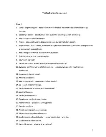 Technikum czteroletnie Klasa I 1. Lekcja organizacyjna – bezpieczeństwo w drodze do szkoły i ze szkoły oraz na jej terenie. 2. Spacer po szkole - zasady bhp, plan budynku szkolnego, plan ewakuacji 3. Wybór samorządu klasowego 4. Prawa i obowiązki ucznia Zapoznanie uczniów ze Statutem Szkoły. 5. Zapoznanie z WSO szkoły , omówienie kryteriów zachowania, procedur postępowania w sytuacjach szczególnych. 6. Moje miejsce w nowej klasie i w nowej szkole. 7. Zajęcia integracyjno – adaptacyjne. 8. Czym jest agresja? 9. Jak się zachować wobec przejawów agresji i przemocy? 10. Sytuacje konfliktowe w szkole i w domu – przyczyny i sposoby neutralizacji konfliktów. 11. Uczymy się jak się uczyć. 12. Mikołajki klasowe 13. Warto pamiętać - sposoby na dobrą pamięć. 14. Co to jest stres? Dyskusja. 15. Jak sobie radzić w sytuacjach stresowych? 16. Wigilia klasowa. 17. Jak się zrelaksować? 18. Pozytywne myślenie czyni cuda. 19. Asertywność – pożądana umiejętność. 20. Bezpieczne ferie . 21. Nikotynizm i jego konsekwencje. 22. Alkoholizm i jego konsekwencje. 23. Uzależnienie od narkotyków – zniewolenie ciała i umysłu. 24. Uzależnienie od Internetu. 25. Jak sobie radzę z własnymi uczuciami? 1 26. Czy warto mieć przyjaciela? 27. Zdrowy styl życia. 28. Jak zdrowo się odżywiać? 29. Bulimia i anoreksja. 30. W jaki sposób dbasz o higienę ciała i umysłu? 31. Bezpieczne wakacje KLASA II 1. Przypomnienie o prawach i obowiązkach ucznia, zmiany w Statucie Szkoły, WSO. 2. Wybieramy samorząd klasowy. 3. Nasza postawa a model absolwenta ZSP Nr 3 im. Króla Jana III Sobieskiego 4. Szanuję ludzi starszych. 5. Wolontariusz – jego prawa i obowiązki. 6. W niewoli uzależnień. 7. Tolerancja. Czy jestem tolerancyjny? 8. Akceptuję siebie? 9. Współpraca czy rywalizacja. 10. Potrafię zaplanować swój czas. 11. Telefon komórkowy – savoir-vivre komunikacji telefonicznej. 12. AIDS – można się go ustrzec. 13. Tradycje mojej rodziny – Wigilia. 14. Tydzień pod hasłem: jestem lepszy dla siebie i innych – doskonalę siebie. 15. Radzę sobie z agresją – panuję nad swoimi emocjami. 16. Potrafię ocenić swoje zachowanie zgodnie ze szkolnym systemem oceniania. 17. Jak sobie radzić z przygnębieniem i apatią? 18. Bezpieczne ferie. 19. Lokalny patriotyzm – Sylwetka Patrona Szkoły 20. Dbam o swoje zdrowie – fizyczne i psychiczne. 21. Wrażliwość – wada czy zaleta? 22. Moje osiemnaste urodziny. 23. Analiza ocen cząstkowych i frekwencji. 2 24. Trzeźwość – impreza bez alkoholu i używek. 25. Czy jestem już dorosły? 26. Rozwijam swoje zainteresowania. 27. Żyję w zgodzie z innymi. 28. Praca i jej znaczenie. 29. Moje plany na przyszłość. 30. Bezpieczeństwo podczas wakacji. KLASA III 1. Znamy nasze prawa i obowiązki – Statut Szkoły i WSO. 2. Samodzielność myślenia. 3. Wybór samorządu klasowego. 4. Nowe zawody i kierunki studiów – zajęcia z doradcami zawodowymi 5. Wymarzony zawód – prezentacje uczniów. 6. Praca i jej znaczenie. 7. Jestem w Europie – możliwości pracy. 8. Na czym polega kultura osobista? 9. Akceptuję siebie? 10. Wigilia klasowa. 11. Potrafię ocenić swoje zachowanie zgodnie ze szkolnym systemem oceniania. 12. Tolerancja. Czy jestem tolerancyjny? 13. Nowotwór piersi – program „Różowej wstążeczki”. 14. Stres pod kontrolą – zajęcia z pedagogiem szkolnym. 15. Bezpieczne ferie. 16. Jak uczyć się szybko i skutecznie? 17. Sposoby wyrażania swoich uczuć. 18. . Jak sobie radzić z przygnębieniem i apatią? 19. Dobrze widzi się tylko sercem – dyskusja o przyjaźni. 20. Tolerowanie siebie a funkcjonowanie w środowisku rówieśniczym. 21. Dlaczego należy pomagać innym? 3 22. Rozwijam swoje zainteresowania. 23. Ja – odpowiedzialny obywatel. 24. Aktywność własna w rozwoju – rozwijamy się przez całe życie. 25. Być czy mieć – co wybrać? 26. Odpowiedzialność = dojrzałość. 27. Na czy polega dojrzałość? 28. Młodość i afirmacja życia. 29. Bezpieczne wakacje. Klasa IV 1. Znamy nasze prawa i obowiązki – Statut Szkoły i WSO. 2. Wybór samorządu klasowego 3. Wypełnianie deklaracji maturalnych (egzaminu zawodowego). 4. Omówienie przepisów dotyczących przebiegu matury (egzaminu zawodowego). 5. Konformizm i jego skutki. 6. Jednostka , a społeczeństwo – czy pojedynczy człowiek ma wpływ na to, co dzieje się na świecie? 7. Koniec szkoły – i co dalej? 8. Wigilia klasowa. 9. Zmieniający się rynek pracy, a kształcenie ustawiczne. 10. Zajęcia z doradcą zawodowym dotyczące określenia predyspozycji i zainteresowań zawodowych, planowania kariery zawodowej. 11. Stres w życiu człowieka i sposoby radzenia sobie z nim. 12. Bezpieczne ferie. 13. Mam wpływ na swoje życie. 14. Autoprezentacja – jak dobrze zdać maturę. 15. Aktywność własna w rozwoju - rozwijamy się przez całe życie. 16. Moda na „dopalacze” – o groźnych skutkach zażywania substancji psychoaktywnych. 17. Nasza prywatność a wirtualny świat. 4 18. Gdzie szukać pomocy w sytuacjach kryzysowych. 19. Bezpieczne wakacje. Trzyletnie zasadnicze szkoły zawodowe: KLASA I 1. Lekcja organizacyjna. 2. Poznajmy się – integracja zespołu klasowego. 3. Wybór samorządu klasowego. 4. Zajęcia integracyjne z pedagogiem szkolnym. 5. „100 pytań do… . Spotkanie z kierownikiem zajęć praktycznych”. 6. Moje prawa – wokół dokumentów szkolnych (Statut, WSO). 7. Moje obowiązki – wokół dokumentów szkolnych (Statut, WSO). 8. Uczymy się jak się uczyć. 9. Czym jest agresja? 10. Jak się zachować wobec przejawów agresji i przemocy? 11. Sytuacje konfliktowe w szkole i w domu – przyczyny i sposoby neutralizacji 12. konfliktów 13. Mikołajki klasowe 14. Poznajemy naszą szkołę i jej tradycje. 15. Warto pamiętać - sposoby na dobrą pamięć. 16. Co to jest stres? Dyskusja. 17. Wigilia klasowa. 18. Jak sobie radzić w sytuacjach stresowych? 19. Kompleks? A cóż to takiego? 20