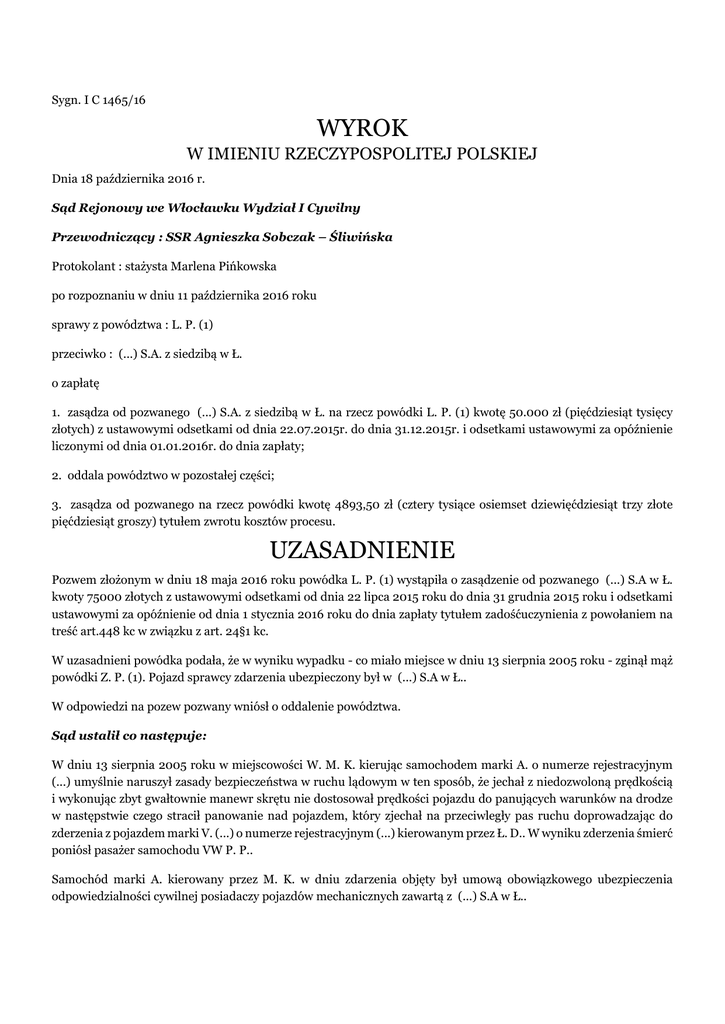 Sygn. I C 1465/16 WYROK W IMIENIU RZECZYPOSPOLITEJ POLSKIEJ Dnia 18 października 2016 r. Sąd Rejonowy we Włocławku Wydział I Cywilny Przewodniczący : SSR Agnieszka Sobczak – Śliwińska Protokolant : stażysta Marlena Pińkowska po rozpoznaniu w dniu 11 października 2016 roku sprawy z powództwa : L. P. (1) przeciwko : (...) S.A. z siedzibą w Ł. o zapłatę 1. zasądza od pozwanego (...) S.A. z siedzibą w Ł. na rzecz powódki L. P. (1) kwotę 50.000 zł (pięćdziesiąt tysięcy złotych) z ustawowymi odsetkami od dnia 22.07.2015r. do dnia 31.12.2015r. i odsetkami ustawowymi za opóźnienie liczonymi od dnia 01.01.2016r. do dnia zapłaty; 2. oddala powództwo w pozostałej części; 3. zasądza od pozwanego na rzecz powódki kwotę 4893,50 zł (cztery tysiące osiemset dziewięćdziesiąt trzy złote pięćdziesiąt groszy) tytułem zwrotu kosztów procesu. UZASADNIENIE Pozwem złożonym w dniu 18 maja 2016 roku powódka L. P. (1) wystąpiła o zasądzenie od pozwanego (...) S.A w Ł. kwoty 75000 złotych z ustawowymi odsetkami od dnia 22 lipca 2015 roku do dnia 31 grudnia 2015 roku i odsetkami ustawowymi za opóźnienie od dnia 1 stycznia 2016 roku do dnia zapłaty tytułem zadośćuczynienia z powołaniem na treść art.448 kc w związku z art. 24§1 kc. W uzasadnieni powódka podała, że w wyniku wypadku - co miało miejsce w dniu 13 sierpnia 2005 roku - zginął mąż powódki Z. P. (1). Pojazd sprawcy zdarzenia ubezpieczony był w (...) S.A w Ł.. W odpowiedzi na pozew pozwany wniósł o oddalenie powództwa. Sąd ustalił co następuje: W dniu 13 sierpnia 2005 roku w miejscowości W. M. K. kierując samochodem marki A. o numerze rejestracyjnym (...) umyślnie naruszył zasady bezpieczeństwa w ruchu lądowym w ten sposób, że jechał z niedozwoloną prędkością i wykonując zbyt gwałtownie manewr skrętu nie dostosował prędkości pojazdu do panujących warunków na drodze w następstwie czego stracił panowanie nad pojazdem, który zjechał na przeciwległy pas ruchu doprowadzając do zderzenia z pojazdem marki V. (...) o numerze rejestracyjnym (...) kierowanym przez Ł. D.. W wyniku zderzenia śmierć poniósł pasażer samochodu VW P. P.. Samochód marki A. kierowany przez M. K. w dniu zdarzenia objęty był umową obowiązkowego ubezpieczenia odpowiedzialności cywilnej posiadaczy pojazdów mechanicznych zawartą z (...) S.A w Ł.. M. K. został skazany za popełnione przestępstwo (art.177§1 i 2 kk) na 2 lata pozbawienia wolności z warunkowym zawieszeniem jej wykonania na 5-letni okres próby. W dacie zdarzenia Z. P. (1) miał 27 lat i pozostawał w związku małżeńskim z L. P. (1), która wówczas miała 24 lata. Małżeństwo zawarte zostało w dniu 25 października 2003 roku. Z. P. (1) i L. P. (1) (wówczas M.) poznali się w roku 2000. Będąc parą, jeszcze przed ślubem, przeprowadzili się do W., gdzie razem zamieszkali. Z. P. (1) rozpoczął pracę w (...) gdzie zarabiał w granicach 1700-1900 zł miesięcznie. L. P. (1) podjęła pracę w sklepie. Jej pobory kształtowały się na poziomie 540-600 zł miesięcznie. W roku 2005 małżonkowie kupili mieszkanie, które remontowali. Planowali powiększenie rodziny. Byli zgodną parą, darzyli się uczuciem. Dużo czasu spędzali razem, nie prowadzili intensywnego życia towarzyskiego chociaż w święta czy w uroczystości rodzinne spotykali się w gronie swych rodzin. Przy czym rodzina L. P. (1) zamieszkiwała w odległości około 70 km od W.. O śmierci męża L. P. (1) dowiedziała się od ciotki swego męża. Na wiadomość o śmierci Z. P. (1) do L. P. (1) przyjechali członkowie obu rodzin. L. P. (1) zażywała wówczas środki uspokajające dostępne bez recepty. L. P. (1) otrzymała wsparcie ze strony swojej rodziny. Matka chciała ją zabrać do domu rodzinnego, siostra natomiast oferowała swoje towarzystwo, deklarowała chęć pozostania przez pewien czas z L. P.. Ciotka Z. P. (1), która zamieszkiwała we W., zaproponowała L. P. (1) aby ta zamieszkała u niej. L. P. (1) nie przyjęła propozycji matki ani siostry. Uznała, że sama musi uporać się ze stratą. W tym okresie nie korzystała z pomocy psychiatry bądź psychologa. 2 razy nocowała natomiast u ciotki męża, później zdarzało się jej również tam okazjonalnie nocować. W pierwszym okresie po śmierci Z. P. (1), kobieta pozostawała w częstym kontakcie ze swoja rodziną. Jeździła do rodziny, bądź też członkowie rodziny odwiedzali ją we W.. Przez cały czas była czynna zawodowo. Po 3-4 latach po śmierci męża L. P. (1) nawiązała relacje z innym mężczyzną, związek trwał około 4-5 lat. Czasowo mężczyzna ten zamieszkiwał wspólnie z L. P. (1). Później kobieta spotykała się z drugim mężczyzną, nie była z nim jednak w związku. Obecnie L. P. (1) nie jest z nikim związana. Zamieszkuje samotnie w mieszkaniu, które kupiła wspólnie z mężem. Pracuje zawodowo (miała jedynie rok przerwy z przyczyn leżących po stronie pracodawcy). Utrzymuje kontakty ze swoja rodziną – rodzicami, rodzeństwem. Z uwagi na fakt, że tak rodzice jak i rodzeństwo nie zamieszkują we W., spotyka się z nimi jedynie w święta, uroczystości rodzinne. Pozostaje też z nimi w kontakcie telefonicznym. Okazjonalnie spotyka się z ciotką męża, nie utrzymuje natomiast kontaktów z pozostałą jego rodziną. Ma znajomych oraz jedną przyjaciółkę, której się zwierza i z którą spotyka się średnio raz w miesiącu. Dowód: zeznania L. P. k. 50v-52, zeznania świadka W. D. k. 49v-50, świadka A. Z. k. 50, akta szkody Sąd zważył co następuje: Na wstępie odnieść należy się do stanowiska pozwanego co do braku możliwości – w zaistniałym stanie faktycznym - dochodzenia przez powoda na podstawie art.448 kc w zw. z art.24§1 kc zadośćuczynienia za krzywdę doznaną w następstwie śmierci osoby bliskiej w wyniku deliktu. W ocenie Sądu zapatrywanie pozwanego nie zasługuje na uwzględnienie. Ugruntowany 