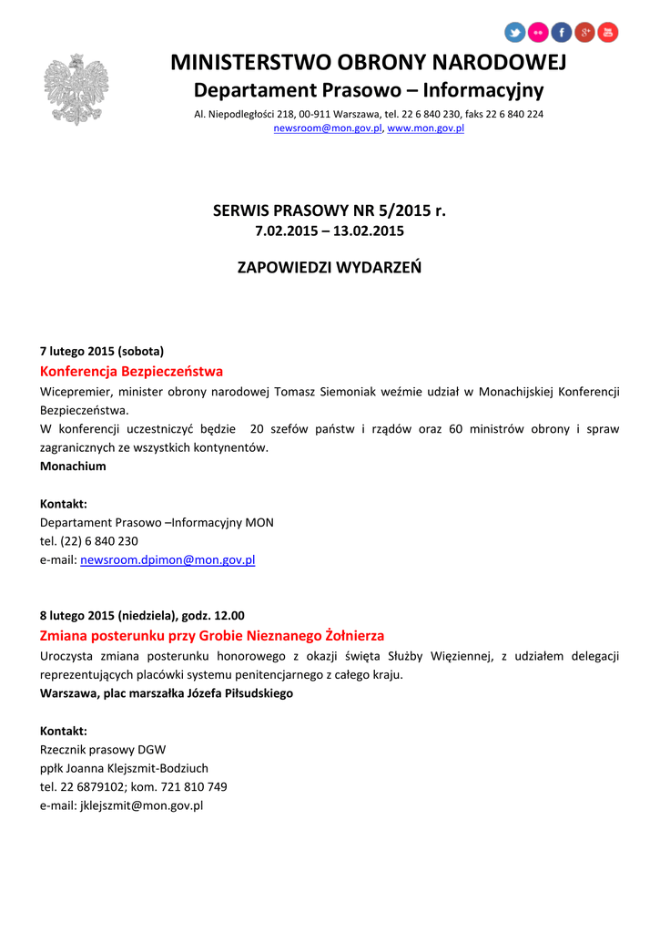 MINISTERSTWO OBRONY NARODOWEJ Departament Prasowo – Informacyjny Al. Niepodległości 218, 00-911 Warszawa, tel. 22 6 840 230, faks 22 6 840 224 [email protected], www.mon.gov.pl SERWIS PRASOWY NR 5/2015 r. 7.02.2015 – 13.02.2015 ZAPOWIEDZI WYDARZEŃ 7 lutego 2015 (sobota) Konferencja Bezpieczeństwa Wicepremier, minister obrony narodowej Tomasz Siemoniak weźmie udział w Monachijskiej Konferencji Bezpieczeństwa. W konferencji uczestniczyć będzie 20 szefów państw i rządów oraz 60 ministrów obrony i spraw zagranicznych ze wszystkich kontynentów. Monachium Kontakt: Departament Prasowo –Informacyjny MON tel. (22) 6 840 230 e-mail: [email protected] 8 lutego 2015 (niedziela), godz. 12.00 Zmiana posterunku przy Grobie Nieznanego Żołnierza Uroczysta zmiana posterunku honorowego z okazji święta Służby Więziennej, z udziałem delegacji reprezentujących placówki systemu penitencjarnego z całego kraju. Warszawa, plac marszałka Józefa Piłsudskiego Kontakt: Rzecznik prasowy DGW ppłk Joanna Klejszmit-Bodziuch tel. 22 6879102; kom. 721 810 749 e-mail: [email protected] 9-13 lutego 2015 (poniedziałek-piątek) Żołnierska rywalizacja Zawody użyteczno-bojowe pododdziałów 16 Dywizji Zmechanizowanej. Orzysz Kontakt: Szef sekcji prasowej 16DZ mjr Zbigniew Tuszyński tel. 693 168 261 e-mail: [email protected] 9-23 lutego 2015 (poniedziałek-poniedziałek) Szkolenia żołnierzy Szkolenie poligonowe 1 Batalionu Strzelców Podhalańskich 21 Brygady Strzelców Podhalańskich. 16.02 - ćwiczenie taktyczne z wojskami 1Kompanii Zmechanizowanej 1bsp. Nowa Dęba Kontakt: Oficer prasowy 21BSP kpt. Konrad Radzik tel. 691 677 515 e-mail: [email protected] 10 lutego 2015 (wtorek), godz. 10.00-14. 30 Konferencja: Bilans polskiej obecności w Afganistanie Polski Instytut Spraw Międzynarodowych i Dowództwo Operacyjne Rodzajów Sił Zbrojnych zapraszają na konferencję Bilans polskiej obecności w Afganistanie. Więcej… Warszawa, Centralna Biblioteka Wojskowa (ul. Ostrobramska 109, sala konferencyjna, I piętro) Kontakt: PISM tel. (22) 556 80 70/71 e-mail: [email protected] 10 lutego 2015 (wtorek) Zmagania konkursowe Konkurs o miano Mistrza Artylerii 11 Pułku Artylerii. Węgorzewo Kontakt: Oficer prasowy 11pa st. chor. szt. Robert Kopiczko tel. 603 620 622 e-mail: [email protected] 10 lutego 2015 (wtorek) Akcja honorowego krwiodawstwa Żołnierze i pracownicy Centrum Szkolenia Łączności i Informatyki oddadzą honorowo krew. Zegrze Kontakt: Oficer prasowy CSŁiI kpt. Krzysztof Baran tel. 722 380-054 e-mail: [email protected] 11 lutego 2015 (środa), godz. 11.30 Prezentacja monografii Podsekretarz stanu w MON Maciej Jankowski weźmie udział w prezentacji monografii dr. Andrzeja Drzycimskiego Westerplatte (tom 1: Westerplatte w budowie 1926-1939, tom2: Reduta wojenna 1939). Warszawa, Centralna Biblioteka Wojskowa (ul. Ostrobramska 109) Kontakt: CBW tel. (22) 6 817 394 e-mail: [email protected] 11 lutego – 2 marca 2015 (środa - poniedziałek) Szkolenie poligonowe Pododdziały 10 Brygady Kawalerii Pancernej wezmą udział w szkoleniu poligonowym. Orzysz Kontakt: Oficer prasowy 10BKPanc kpt. Justyna Balik tel. 75 355 033 e-mail: [email protected] 12 lutego 2015 (czwartek) Pancerny załadunek Załadunek 15 czołgów T-72 1 Batalionu Czołgów z 21 Brygady Strzelców Podhalańskich na transport kolejowy (przed wyjazdem na szkolenie poligonowe do Drawska). Żurawica Kontakt: Oficer prasowy 21BSP kpt. Konrad Radzik tel. 691 677 515 e-mail: [email protected] 12 lutego 2015 (czwartek) Rywalizacja czołgistów Zawody użyteczno-bojowe załóg czołgów Leopard 2A4. Świętoszów Kontakt: Oficer prasowy 10BKPanc kpt. Justyna Balik tel. 75 355 033 e-mail: [email protected] KRONIKA 30 stycznia 2015 (piątek) Wicepremier Tomasz Siemoniak w Paryżu W piątek wicepremier, minister obrony narodowej Tomasz Siemoniak przebywał w Paryżu, gdzie uczestniczył w V konsultacjach rządów Polski i Francji. Polskiej delegacji przewodniczyła prezes Rady Ministrów Ewa Kopacz. Więcej… 31 stycznia 2015 (sobota) Rusza kwalifikacja wojskowa Tegoroczna kwalifikacja wojskowa obejmie około 270 tys. osób i będzie prowadzona od 2 lutego do 30 kwietnia br. Termin rozpoczęcia kwalifikacji wojskowej, czas jej trwania, a także roczniki i grupy osób, których będzie dotyczyła określa rozporządzenie ministra spraw wewnętrznych i ministra obrony narodowej z 6 listopada 2014 r. w sprawie przeprowadzenia kwalifikacji wojskowej w 2015 r. Więcej… 1 lutego 2015 (niedziela) „Afganistan: stabilizacja i bezpieczeństwo” Multimedialna wystawa, będąca podsumowaniem misji wojskowej w Afganistanie, jest już dostępna dla krakowskiej publiczności. – Zdjęcia, film i prezentacja multimedialna stanowią całość. Opowiadają o naszej obecności w Afganistanie, o tym, co zrobiliśmy, aby choć trochę zmienić na lepsze życie Afgańczyków – powiedział podczas otwarcia wystawy kmdr Janusz Walczak, dyrektor Departamentu PrasowoInformacyjnego MON. Więcej… 3 lutego 2015 (wtorek) Jubileusz 100-lecia We wtorek w Słupcy odbyły się uroczyste obchody jubileuszu setnych urodzin rotmistrza Franciszka Andrzejaka. Więcej… 3 lutego 2015 (wtorek) Przyjęto założenie offsetowe dla "Wisły" i "Orki" Założenia do umowy offsetowej w związku z pozyskaniem systemu obrony powietrznej średniego zasięgu "Wisła" oraz okrętów podwodnych nowego typu "Orka" zostały jednogłośnie przyjęte podczas posiedzenia komitetu offsetowego. Więcej… 3 lutego 2015 (wtorek) Leopardy 2A5 na poligonie Żołnierze z 34 Brygady Kawalerii Pancernej z Żagania rozpoczęli szkolenie poligonowe w Ośrodku Szkolenia Poligonowego Wojsk Lądowych Żagań – Karliki. Więcej… 4 lutego 2015 (środa) Wspólnie dla bezpieczeństwa państwa Dowódca Generalny Rodzajów Sił Zbrojnych zawarł porozumienie o współpracy z Komendantem Głównym Straży Granicznej. Generał broni pilot Lech Majewski i generał dywizji SG Dominik Tracz p