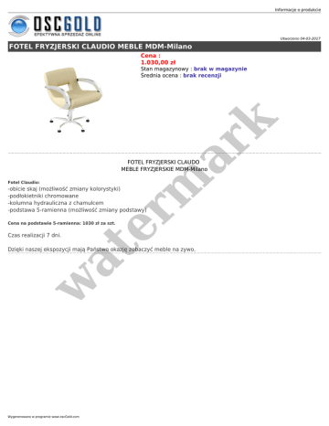 Informacje o produkcie Utworzono 04-03-2017 FOTEL FRYZJERSKI CLAUDIO MEBLE MDM-Milano Cena : 1.030,00 zł er m ar k Stan magazynowy : brak w magazynie Średnia ocena : brak recenzji FOTEL FRYZJERSKI CLAUDO MEBLE FRYZJERSKIE MDM-Milano Fotel Claudio: -obicie skaj (możliwość zmiany kolorystyki) -podłokietniki chromowane -kolumna hydrauliczna z chamulcem -podstawa 5-ramienna (możliwość zmiany podstawy) Cena na podstawie 5-ramienna: 1030 zł za szt. at Czas realizacji 7 dni. w Dzięki naszej ekspozycji mają Państwo okazję zobaczyć meble na zywo. Wygenerowano w programie www.oscGold.com