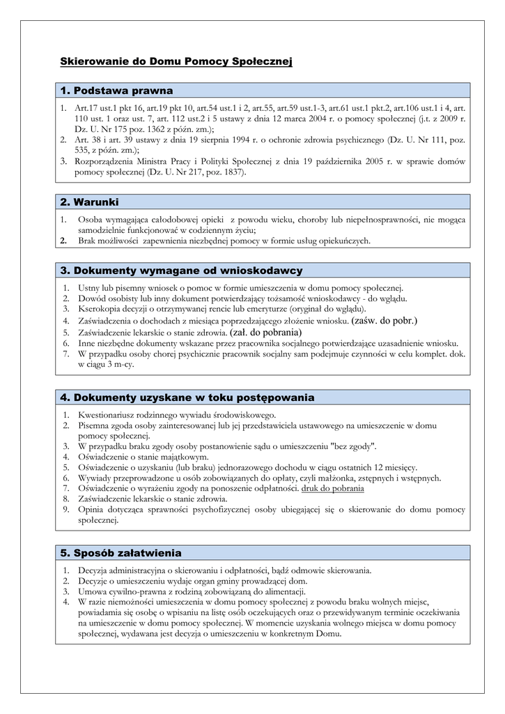 Skierowanie do Domu Pomocy Społecznej 1. Podstawa prawna 1. Art.17 ust.1 pkt 16, art.19 pkt 10, art.54 ust.1 i 2, art.55, art.59 ust.1-3, art.61 ust.1 pkt.2, art.106 ust.1 i 4, art. 110 ust. 1 oraz ust. 7, art. 112 ust.2 i 5 ustawy z dnia 12 marca 2004 r. o pomocy społecznej (j.t. z 2009 r. Dz. U. Nr 175 poz. 1362 z późn. zm.); 2. Art. 38 i art. 39 ustawy z dnia 19 sierpnia 1994 r. o ochronie zdrowia psychicznego (Dz. U. Nr 111, poz. 535, z późn. zm.); 3. Rozporządzenia Ministra Pracy i Polityki Społecznej z dnia 19 października 2005 r. w sprawie domów pomocy społecznej (Dz. U. Nr 217, poz. 1837). 2. Warunki 1. 2. Osoba wymagająca całodobowej opieki z powodu wieku, choroby lub niepełnosprawności, nie mogąca samodzielnie funkcjonować w codziennym życiu; Brak możliwości zapewnienia niezbędnej pomocy w formie usług opiekuńczych. 3. Dokumenty wymagane od wnioskodawcy 1. 2. 3. 4. 5. 6. 7. Ustny lub pisemny wniosek o pomoc w formie umieszczenia w domu pomocy społecznej. Dowód osobisty lub inny dokument potwierdzający tożsamość wnioskodawcy - do wglądu. Kserokopia decyzji o otrzymywanej rencie lub emeryturze (oryginał do wglądu). Zaświadczenia o dochodach z miesiąca poprzedzającego złożenie wniosku. (zaśw. do pobr.) Zaświadczenie lekarskie o stanie zdrowia. (zał. do pobrania) Inne niezbędne dokumenty wskazane przez pracownika socjalnego potwierdzające uzasadnienie wniosku. W przypadku osoby chorej psychicznie pracownik socjalny sam podejmuje czynności w celu komplet. dok. w ciągu 3 m-cy. 4. Dokumenty uzyskane w toku postępowania 1. Kwestionariusz rodzinnego wywiadu środowiskowego. 2. Pisemna zgoda osoby zainteresowanej lub jej przedstawiciela ustawowego na umieszczenie w domu pomocy społecznej. 3. W przypadku braku zgody osoby postanowienie sądu o umieszczeniu "bez zgody". 4. Oświadczenie o stanie majątkowym. 5. Oświadczenie o uzyskaniu (lub braku) jednorazowego dochodu w ciągu ostatnich 12 miesięcy. 6. Wywiady przeprowadzone u osób zobowiązanych do opłaty, czyli małżonka, zstępnych i wstępnych. 7. Oświadczenie o wyrażeniu zgody na ponoszenie odpłatności. druk do pobrania 8. Zaświadczenie lekarskie o stanie zdrowia. 9. Opinia dotycząca sprawności psychofizycznej osoby ubiegającej się o skierowanie do domu pomocy społecznej. 5. Sposób załatwienia 1. 2. 3. 4. Decyzja administracyjna o skierowaniu i odpłatności, bądź odmowie skierowania. Decyzje o umieszczeniu wydaje organ gminy prowadzącej dom. Umowa cywilno-prawna z rodziną zobowiązaną do alimentacji. W razie niemożności umieszczenia w domu pomocy społecznej z powodu braku wolnych miejsc, powiadamia się osobę o wpisaniu na listę osób oczekujących oraz o przewidywanym terminie oczekiwania na umieszczenie w domu pomocy społecznej. W momencie uzyskania wolnego miejsca w domu pomocy społecznej, wydawana jest decyzja o umieszczeniu w konkretnym Domu. 6. Termin załatwienia sprawy Do 30 dni od daty złożenia wniosku, a sprawy szczególnie skomplikowane nie później niż w ciągu 2 miesięcy od dnia wszczęcia postepowania. 7. Odpłatność 1. Mieszkaniec domu - 70% dochodu, nie więcej niż pełny koszt utrzymania ustalony dla właściwego dps. 2. Pozostałą część pokrywa: rodzina jeżeli osiąga dochód wyższy niż 250% kryterium dochodowego lub dobrowolnie deklaruje opłatę; gmina kierująca; lub inne osoby. 8. Procedura odwoławcza Odwołanie do Samorządowego Kolegium Odwoławczego za pośrednictwem Dyrektora MOPS w terminie 14 dni od doręczenia.