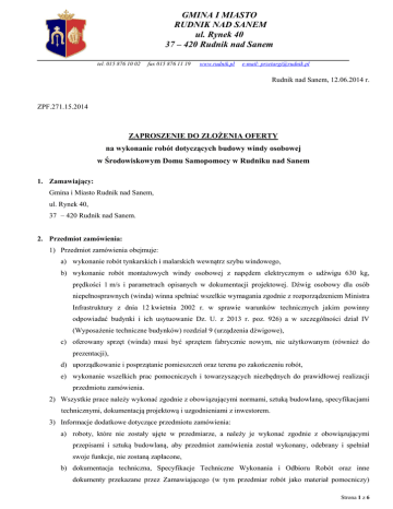 GMINA I MIASTO RUDNIK NAD SANEM ul. Rynek 40 37 – 420 Rudnik nad Sanem tel. 015 876 10 02 fax 015 876 11 19 www.rudnik.pl e-mail: [email protected] Rudnik nad Sanem, 12.06.2014 r. ZPF.271.15.2014 ZAPROSZENIE DO ZŁOŻENIA OFERTY na wykonanie robót dotyczących budowy windy osobowej w Środowiskowym Domu Samopomocy w Rudniku nad Sanem 1. Zamawiający: Gmina i Miasto Rudnik nad Sanem, ul. Rynek 40, 37 – 420 Rudnik nad Sanem. 2. Przedmiot zamówienia: 1) Przedmiot zamówienia obejmuje: a) wykonanie robót tynkarskich i malarskich wewnątrz szybu windowego, b) wykonanie robót montażowych windy osobowej z napędem elektrycznym o udźwigu 630 kg, prędkości 1 m/s i parametrach opisanych w dokumentacji projektowej. Dźwig osobowy dla osób niepełnosprawnych (winda) winna spełniać wszelkie wymagania zgodnie z rozporządzeniem Ministra Infrastruktury z dnia 12 kwietnia 2002 r. w sprawie warunków technicznych jakim powinny odpowiadać budynki i ich usytuowanie Dz. U. z 2013 r. poz. 926) a w szczególności dział IV (Wyposażenie techniczne budynków) rozdział 9 (urządzenia dźwigowe), c) oferowany sprzęt (winda) musi być sprzętem fabrycznie nowym, nie użytkowanym (również do prezentacji), d) uporządkowanie i posprzątanie pomieszczeń oraz terenu po zakończeniu robót, e) wykonanie wszelkich prac pomocniczych i towarzyszących niezbędnych do prawidłowej realizacji przedmiotu zamówienia. 2) Wszystkie prace należy wykonać zgodnie z obowiązującymi normami, sztuką budowlaną, specyfikacjami technicznymi, dokumentacją projektową i uzgodnieniami z inwestorem. 3) Informacje dodatkowe dotyczące przedmiotu zamówienia: a) roboty, które nie zostały ujęte w przedmiarze, a należy je wykonać zgodnie z obowiązującymi przepisami i sztuką budowlaną, aby przedmiot zamówienia został wykonany, odebrany i spełniał swoje funkcje, nie zostaną zapłacone, b) dokumentacja techniczna, Specyfikacje Techniczne Wykonania i Odbioru Robót oraz inne dokumenty przekazane przez Zamawiającego (w tym przedmiar robót jako materiał pomocniczy) Strona 1 z 6 GMINA I MIASTO RUDNIK NAD SANEM ul. Rynek 40 37 – 420 Rudnik nad Sanem tel. 015 876 10 02 fax 015 876 11 19 www.rudnik.pl e-mail: [email protected] służą ustaleniu ceny za wykonanie przedmiotu zamówienia, a wymagania choćby w jednym z nich są obowiązujące dla Wykonawcy tak, jakby zawarte były w całej dokumentacji. W przypadku rozbieżności w ustaleniach poszczególnych dokumentów obowiązuje następująca kolejność: STWiOR, dokumentacja techniczna, przedmiar robót, umowa oraz warunki opisane w zaproszeniu do złożenia oferty. c) wykonawca jest zobligowany do zgłoszenia wszelkich niezgodności w załączonej dokumentacji do Zamawiającego. Wprowadzenie zmian, bez zgody Zamawiającego, zostanie uznane za zmianę przedmiotu zamówienia i będzie skutkowało odrzuceniem oferty, d) oferty muszą obejmować wykonanie całego zakresu rzeczowego przedmiotu zamówienia, e) w przypadku, gdy Zamawiający dokonał opisu przedmiotu zamówienia w dokumentacji poprzez wskazanie przykładowych znaków towarowych lub pochodzenia, Wykonawcy są zobowiązani do oferowania materiałów/urządzeń określonych w dokumentacji lub równoważnych o parametrach tego typu, lecz nie gorszych od wskazanych. Wszystkie wskazane z nazwy materiały i przyjęte technologie użyte w dokumentacji technicznej należy rozumieć jako określenie wymaganych parametrów technicznych lub standardów jakościowych. Materiały równoważne muszą być w ofercie wymienione z nazwy, a ciężar udowodnienia o zachowaniu parametrów wymaganych przez Zamawiającego leży po stronie składającego ofertę, f) użyte materiały muszą mieć aktualne dokumenty, dopuszczające do stosowania w budownictwie, zgodnie z przepisami obowiązującymi w tym zakresie, g) Wykonawca robót ponosi odpowiedzialność za jakość wykonywanych robót oraz zastosowanych materiałów, h) przed złożeniem oferty zaleca się dokonanie wizji lokalnej, celem sprawdzenia miejsca wykonywania robót, warunków związanych z wykonaniem robót będących przedmiotem zamówienia, dokonania w miejscu instalacji dźwigu dokładnych pomiarów w celu sprawdzenia zgodności z wymiarami podanymi w dokumentacji projektowej budynku oraz celem uzyskania jakichkolwiek dodatkowych informacji koniecznych do wyceny prac, gdyż wyklucza się możliwość roszczeń Wykonawcy z tytułu błędnego skalkulowania ceny lub pominięcia elementów niezbędnych do wykonania przedmiotu umowy. Koszt wizji lokalnej ponosi Wykonawca. i) Wykonawca udziela 3-letniej gwarancji bez ograniczeń jej zakresu na wszelkie roboty objęte zamówieniem, w tym na wbudowane urządzenia licząc od dnia podpisania przez strony protokołu odbioru końcowego przedmiotu umowy. W tym zakresie wykonawca będzie zobowiązany na własny koszt do: konserwowania i serwisowania dźwigu w zakresie podstawowym w sposób ustalony Instrukcją Konserwacji i Przepisami o Budowie i Eksploatacji Elektrycznych Dźwigów Pionowych oraz Dokumentacją Techniczno-Ruchową urządzeń, utrzymania dźwigu w stałym ruchu, dokonywanie przeglądów urządzeń dźwigowych oraz Strona 2 z 6 GMINA I MIASTO RUDNIK NAD SANEM ul. Rynek 40 37 – 420 Rudnik nad Sanem tel. 015 876 10 02 fax 015 876 11 19 www.rudnik.pl e-mail: [email protected] usuwanie na bieżąco zauważonych nieprawidłowości w działaniu tych urządzeń. Zgłoszoną przez Zamawiającego usterkę Wykonawca zobowiązany usunąć jest w ciągu najbliższych 48 godzin. j) Wykonawca będzie zobowiązany na własny koszt do uzyskania decyzji administracyjnych warunkujących dopuszczenie urządzenia do eksploatacji: sporządzenie dokumentacji do rejestracji w Urzędzie Dozoru Technicznego i jej zatwierdzenie, dopuszczenie do eksploatacji, wykonanie prób, odbioru i rozruchu urządzenia dźwigowego z udziałem wymaganych instytucji, rejestrację windy w UDT, dostarczenie dokumentacji technicznej dźwig