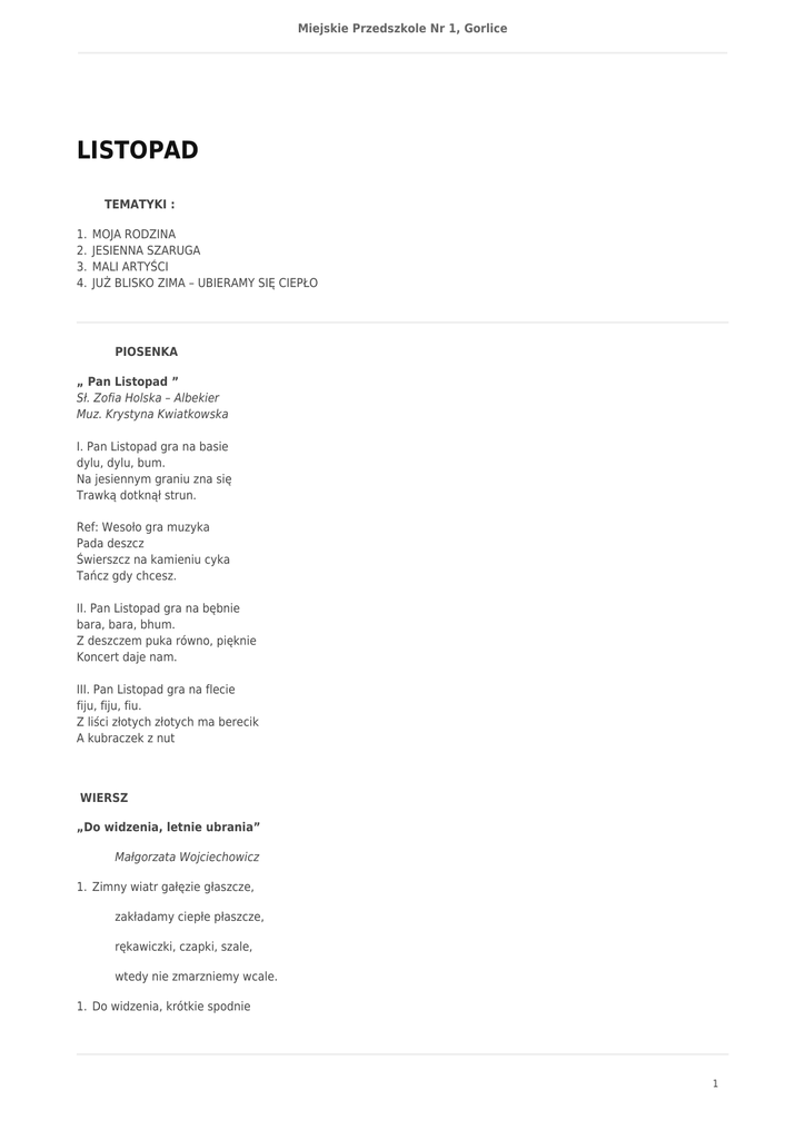 Miejskie Przedszkole Nr 1, Gorlice LISTOPAD TEMATYKI : 1. 2. 3. 4. MOJA RODZINA JESIENNA SZARUGA MALI ARTYŚCI JUŻ BLISKO ZIMA – UBIERAMY SIĘ CIEPŁO PIOSENKA „ Pan Listopad ” Sł. Zofia Holska – Albekier Muz. Krystyna Kwiatkowska I. Pan Listopad gra na basie dylu, dylu, bum. Na jesiennym graniu zna się Trawką dotknął strun. Ref: Wesoło gra muzyka Pada deszcz Świerszcz na kamieniu cyka Tańcz gdy chcesz. II. Pan Listopad gra na bębnie bara, bara, bhum. Z deszczem puka równo, pięknie Koncert daje nam. III. Pan Listopad gra na flecie fiju, fiju, fiu. Z liści złotych złotych ma berecik A kubraczek z nut WIERSZ „Do widzenia, letnie ubrania” Małgorzata Wojciechowicz 1. Zimny wiatr gałęzie głaszcze, zakładamy ciepłe płaszcze, rękawiczki, czapki, szale, wtedy nie zmarzniemy wcale. 1. Do widzenia, krótkie spodnie 1 Miejskie Przedszkole Nr 1, Gorlice latem było w nich wygodnie! Bluzki-króciutkie rękawki już wkładamy dziś do szafki. 1. Gdy ochładza się powietrze, pomyśl o wełnianym swetrze, 2