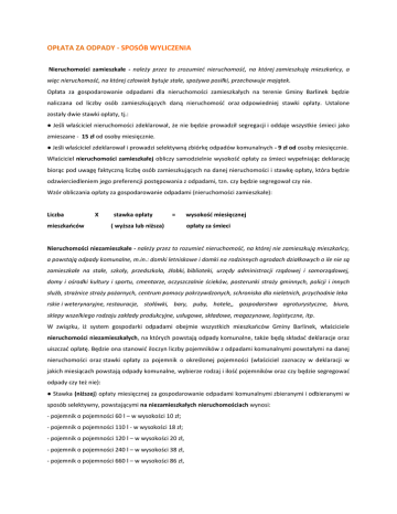 OPŁATA ZA ODPADY - SPOSÓB WYLICZENIA Nieruchomości zamieszkałe - należy przez to zrozumied nieruchomośd, na której zamieszkują mieszkaocy, a więc nieruchomośd, na której człowiek bytuje stale, spożywa posiłki, przechowuje majątek. Opłata za gospodarowanie odpadami dla nieruchomości zamieszkałych na terenie Gminy Barlinek będzie naliczana od liczby osób zamieszkujących daną nieruchomośd oraz odpowiedniej stawki opłaty. Ustalone zostały dwie stawki opłaty, tj.: ● Jeśli właściciel nieruchomości zdeklarował, że nie będzie prowadził segregacji i oddaje wszystkie śmieci jako zmieszane - 15 zł od osoby miesięcznie. ● Jeśli właściciel zdeklarował i prowadzi selektywną zbiórkę odpadów komunalnych - 9 zł od osoby miesięcznie. Właściciel nieruchomości zamieszkałej obliczy samodzielnie wysokośd opłaty za śmieci wypełniając deklarację biorąc pod uwagę faktyczną liczbę osób zamieszkujących na danej nieruchomości i stawkę opłaty, która będzie odzwierciedleniem jego preferencji postępowania z odpadami, tzn. czy będzie segregował czy nie. Wzór obliczania opłaty za gospodarowanie odpadami (nieruchomości zamieszkałe): Liczba X mieszkaoców stawka opłaty = ( wyższa lub niższa) wysokośd miesięcznej opłaty za śmieci Nieruchomości niezamieszkałe - należy przez to rozumied nieruchomośd, na której nie zamieszkują mieszkaocy, a powstają odpady komunalne, m.in.: domki letniskowe i domki na rodzinnych ogrodach działkowych o ile nie są zamieszkałe na stałe, szkoły, przedszkola, żłobki, biblioteki, urzędy administracji rządowej i samorządowej, domy i ośrodki kultury i sportu, cmentarze, oczyszczalnie ścieków, posterunki straży gminnych, policji i innych służb, strażnice straży pożarnych, centrum pomocy pokrzywdzonych, schroniska dla nieletnich, przychodnie leka rskie i weterynaryjne, restauracje, stołówki, bary, puby, hotele,, gospodarstwa agroturystyczne, biura, sklepy wszelkiego rodzaju zakłady produkcyjne, usługowe, składowe, magazynowe, logistyczne, itp. W związku, iż system gospodarki odpadami obejmie wszystkich mieszkaoców Gminy Barlinek, właściciele nieruchomości niezamieszkałych, na których powstają odpady komunalne, także będą składad deklaracje oraz uiszczad opłatę. Będzie ona stanowid iloczyn liczby pojemników z odpadami komunalnymi powstałymi na danej nieruchomości oraz stawki opłaty za pojemnik o określonej pojemności (właściciel zaznaczy w deklaracji w jakich miesiącach powstają odpady komunalne, wybierze rodzaj i ilośd pojemników oraz czy będzie segregowad odpady czy też nie): ● Stawka (niższej) opłaty miesięcznej za gospodarowanie odpadami komunalnymi zbieranymi i odbieranymi w sposób selektywny, powstającymi na niezamieszkałych nieruchomościach wynosi: - pojemnik o pojemności 60 l – w wysokości 10 zł; - pojemnik o pojemności 110 l - w wysokości 18 zł; - pojemnik o pojemności 120 l – w wysokości 20 zł, - pojemnik o pojemności 240 l – w wysokości 38 zł, - pojemnik o pojemności 660 l – w wysokości 86 zł, - pojemnik o pojemności 770 l – w wysokości 94 zł, - pojemnik o pojemności 1100 l – w wysokości 100 zł, 3 - pojemnik o pojemności 5 m – w wysokości 407zł, 3 - pojemnik o pojemności 7m - w wysokości 558 zł, 3 - pojemnik o pojemności 9m - w wysokości 703 zł, 3 - pojemnik o pojemności 16m - w wysokości 1223 zł, - worek o pojemności 60l - w wysokości 4 zł, - worek o pojemności 120l - w wysokości 8 zł, ● Stawka (wyższej) opłaty miesięcznej za gospodarowanie odpadami komunalnymi zbieranymi i odbieranym w sposób nieselektywny, powstającymi na niezamieszkałych nieruchomościach wynosi: - pojemnik o pojemności 60 l – 19 zł, - pojemnik o pojemności 110 l – 35 zł, - pojemnik o pojemności 120 l – 38 zł, - pojemnik o pojemności 240 l – 75 zł, - pojemnik o pojemności 260 l – 79 zł, - pojemnik o pojemności 660 l – 168 zł, - pojemnik o pojemności 770 l – 184 zł, - pojemnik o pojemności 1100 l – 196 zł, 3 - pojemnik o pojemności 5 m – w wysokości 797zł, 3 - pojemnik o pojemności 7m - w wysokości 1094 zł, 3 - pojemnik o pojemności 9m - w wysokości 1378 zł, 3 - pojemnik o pojemności 16m - w wysokości 2398 zł, Wzór obliczania opłaty za gospodarowanie odpadami (nieruchomości niezamieszkałe): liczba X pojemników stawka opłaty (wyższa lub niższa) = wysokośd miesięcznej opłaty za śmieci Nieruchomości mieszane - należy przez to rozumied nieruchomośd, których częśd jest zamieszkała natomiast częśd niezamieszkała, a powstają na niej odpady komunalne. Właściciele takich nieruchomości będą obliczad wysokośd opłaty za gospodarowanie odpadami komunalnymi według wzorców przedstawionych wyżej - odpowiednio do części zamieszkałej (ilośd mieszkaoców x stawka wyższa lub niższa = wysokośd opłaty) i części niezamieszkałej (liczba pojemników x stawka wyższa lub niższa = wysokośd opłaty). Obie kwoty sumujemy.