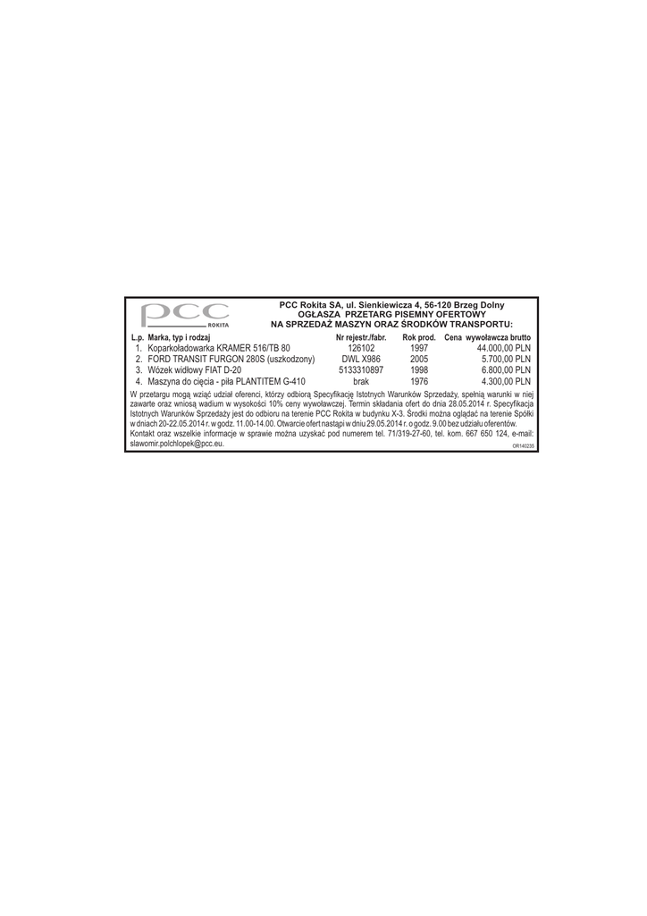 PCC Rokita SA, ul. Sienkiewicza 4, 56-120 Brzeg Dolny OG£ASZA PRZETARG PISEMNY OFERTOWY NA SPRZEDA¯ MASZYN ORAZ ŒRODKÓW TRANSPORTU: L.p. Marka, typ i rodzaj 1. 2. 3. 4. Koparko³adowarka KRAMER 516/TB 80 FORD TRANSIT FURGON 280S (uszkodzony) Wózek wid³owy FIAT D-20 Maszyna do ciêcia - pi³a PLANTITEM G-410 Nr rejestr./fabr. 126102 DWL X986 5133310897 brak Rok prod. Cena wywo³awcza brutto 1997 2005 1998 1976 44.000,00 PLN 5.700,00 PLN 6.800,00 PLN 4.300,00 PLN W przetargu mog¹ wzi¹æ udzia³ oferenci, którzy odbior¹ Specyfikacjê Istotnych Warunków Sprzeda¿y, spe³ni¹ warunki w niej zawarte oraz wnios¹ wadium w wysokoœci 10% ceny wywo³awczej. Termin sk³adania ofert do dnia 28.05.2014 r. Specyfikacja Istotnych Warunków Sprzeda¿y jest do odbioru na terenie PCC Rokita w budynku X-3. Œrodki mo¿na ogl¹daæ na terenie Spó³ki w dniach 20-22.05.2014 r. w godz. 11.00-14.00. Otwarcie ofert nast¹pi w dniu 29.05.2014 r. o godz. 9.00 bez udzia³u oferentów. Kontakt oraz wszelkie informacje w sprawie mo¿na uzyskaæ pod numerem tel. 71/319-27-60, tel. kom. 667 650 124, e-mail: [email protected]. OR140235