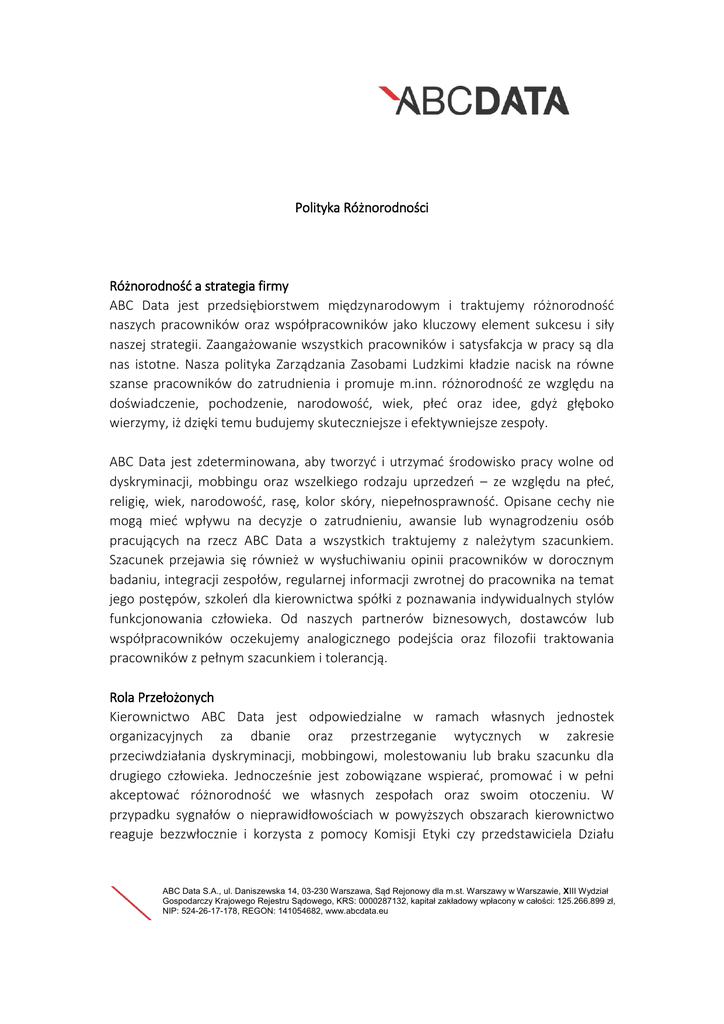 Polityka Różnorodności Różnorodność a strategia firmy ABC Data jest przedsiębiorstwem międzynarodowym i traktujemy różnorodność naszych pracowników oraz współpracowników jako kluczowy element sukcesu i siły naszej strategii. Zaangażowanie wszystkich pracowników i satysfakcja w pracy są dla nas istotne. Nasza polityka Zarządzania Zasobami Ludzkimi kładzie nacisk na równe szanse pracowników do zatrudnienia i promuje m.inn. różnorodność ze względu na doświadczenie, pochodzenie, narodowość, wiek, płeć oraz idee, gdyż głęboko wierzymy, iż dzięki temu budujemy skuteczniejsze i efektywniejsze zespoły. ABC Data jest zdeterminowana, aby tworzyć i utrzymać środowisko pracy wolne od dyskryminacji, mobbingu oraz wszelkiego rodzaju uprzedzeń – ze względu na płeć, religię, wiek, narodowość, rasę, kolor skóry, niepełnosprawność. Opisane cechy nie mogą mieć wpływu na decyzje o zatrudnieniu, awansie lub wynagrodzeniu osób pracujących na rzecz ABC Data a wszystkich traktujemy z należytym szacunkiem. Szacunek przejawia się również w wysłuchiwaniu opinii pracowników w dorocznym badaniu, integracji zespołów, regularnej informacji zwrotnej do pracownika na temat jego postępów, szkoleń dla kierownictwa spółki z poznawania indywidualnych stylów funkcjonowania człowieka. Od naszych partnerów biznesowych, dostawców lub współpracowników oczekujemy analogicznego podejścia oraz filozofii traktowania pracowników z pełnym szacunkiem i tolerancją. Rola Przełożonych Kierownictwo ABC Data jest odpowiedzialne w ramach własnych jednostek organizacyjnych za dbanie oraz przestrzeganie wytycznych w zakresie przeciwdziałania dyskryminacji, mobbingowi, molestowaniu lub braku szacunku dla drugiego człowieka. Jednocześnie jest zobowiązane wspierać, promować i w pełni akceptować różnorodność we własnych zespołach oraz swoim otoczeniu. W przypadku sygnałów o nieprawidłowościach w powyższych obszarach kierownictwo reaguje bezzwłocznie i korzysta z pomocy Komisji Etyki czy przedstawiciela Działu ABC Data S.A., ul. Daniszewska 14, 03-230 Warszawa, Sąd Rejonowy dla m.st. Warszawy w Warszawie, XIII Wydział Gospodarczy Krajowego Rejestru Sądowego, KRS: 0000287132, kapitał zakładowy wpłacony w całości: 125.266.899 zł, NIP: 524-26-17-178, REGON: 141054682, www.abcdata.eu Zasobów Ludzkich oraz Działu Prawnego w celu ich wyjaśnienia. Kierownictwo spółki oraz wszyscy pracownicy są zobowiązani przestrzegać polityki anty mobbingowej oraz stosować wdrożony w ABC Data Kodeks etyki. Zgłaszanie nieprawidłowości Pracownicy mają możliwość zgłaszania przypadków dyskryminacji swoim przełożonym, przełożonym wyższego szczebla, pracownikom działu Zasobów Ludzkich lub Działu Prawnego. Istnieje możliwość zgłoszenia anonimowego w postaci wypełnienia stosownego formularza. Działania polegające na dyskryminacji, molestowaniu, mobbingu podlegają analizie i nie są akceptowalne w ABC Data. Pracownicy dopuszczający się wymienionych zachowań podlegać będą działaniom dyscyplinarnym a firma uczyni wszystko w celu wyjaśnienia zdarzenia oraz przeciwdziałaniu ich ponownemu zaistnieniu. Stała poprawa Za analizę realizacji polityki różnorodności odpowiedzialny jest Dyrektor ds Zarządzania Personelem, a w cyklu rocznym przedstawiany jest raport do Zarządu spółki. ABC Data zapewnia kadrze kierowniczej właściwą edukację oraz udostępnia wiedzę w zakresie przeciwdziałaniu dyskryminacji, mobbingowi oraz promowaniu różnorodności i regularnie usprawnia swoje praktyki w tym zakresie. ABC Data S.A., ul. Daniszewska 14, 03-230 Warszawa, Sąd Rejonowy dla m.st. Warszawy w Warszawie, XIII Wydział Gospodarczy Krajowego Rejestru Sądowego, KRS: 0000287132, kapitał zakładowy wpłacony w całości: 125.266.899 zł, NIP: 524-26-17-178, REGON: 141054682, www.abcdata.eu