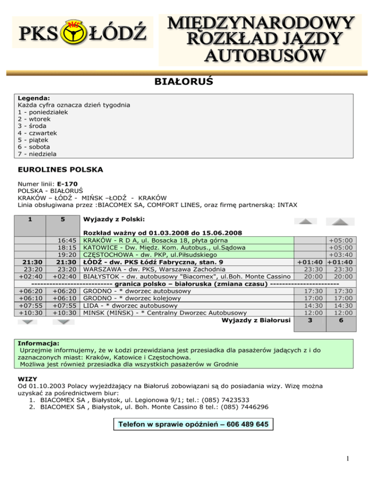 BIAŁORUŚ Legenda: Każda cyfra oznacza dzień tygodnia 1 - poniedziałek 2 - wtorek 3 - środa 4 - czwartek 5 - piątek 6 - sobota 7 - niedziela EUROLINES POLSKA Numer linii: E-170 POLSKA - BIAŁORUŚ KRAKÓW – ŁÓDŹ - MIŃSK –ŁODŹ - KRAKÓW Linia obsługiwana przez :BIACOMEX SA, COMFORT LINES, oraz firmę partnerską: INTAX 1 5 Wyjazdy z Polski: Rozkład ważny od 01.03.2008 do 15.06.2008 16:45 KRAKÓW - R D A, ul. Bosacka 18, płyta górna +05:00 18:15 KATOWICE - Dw. Międz. Kom. Autobus., ul.Sądowa +05:00 19:20 CZĘSTOCHOWA - dw. PKP, ul.Piłsudskiego +03:40 21:30 21:30 ŁÓDŹ - dw. PKS Łódź Fabryczna, stan. 9 +01:40 +01:40 23:20 23:20 WARSZAWA - dw. PKS, Warszawa Zachodnia 23:30 23:30 +02:40 +02:40 BIAŁYSTOK - dw. autobusowy "Biacomex", ul.Boh. Monte Cassino 20:00 20:00 --------------------------- granica polsko – białoruska (zmiana czasu) ----------------------+06:20 +06:20 GRODNO - * dworzec autobusowy 17:30 17:30 +06:10 +06:10 GRODNO - * dworzec kolejowy 17:00 17:00 +07:55 +07:55 LIDA - * dworzec autobusowy 14:30 14:30 +10:30 +10:30 MINSK (MIŃSK) - * Centralny Dworzec Autobusowy 12:00 12:00 3 6 Wyjazdy z Białorusi Informacja: Uprzejmie informujemy, że w Łodzi przewidziana jest przesiadka dla pasażerów jadących z i do zaznaczonych miast: Kraków, Katowice i Częstochowa. Możliwa jest również przesiadka dla wszystkich pasażerów w Grodnie WIZY Od 01.10.2003 Polacy wyjeżdżający na Białoruś zobowiązani są do posiadania wizy. Wizę można uzyskać za pośrednictwem biur: 1. BIACOMEX SA , Białystok, ul. Legionowa 9/1; tel.: (085) 7423533 2. BIACOMEX SA , Białystok, ul. Boh. Monte Cassino 8 tel.: (085) 7446296 Telefon w sprawie opóźnień – 606 489 645 1 ZASADY SPRZEDAŻY BILETÓW NA TRASIE: POLSKA - BIAŁORUŚ EUROLINES POLSKA ZNIŻKI: 10 % - młodzież od 12-26 lat, seniorzy powyżej 60 r.ż. 50 % - dzieci od 5 do 12 lat oraz inwalidzi I grupy i ich opiekunowie 80 % - dzieci do 4 lat 4-ty bilet - preferencyjna zniżka dla stałych klientów po oddaniu 3-ch wykorzystanych biletów Eurolines Polska. Przysługuje wówczas kupno 4-go biletu ze zniżką o jedną grupę korzystniejszą do przysługującej. UWAGA: Dzieci i młodzież do lat 16 mogą podróżować tylko pod opieką osoby dorosłej. Młodzież w wieku 16-18 lat może podróżować bez osoby dorosłej, lecz tylko za okazaniem poświadczonej notarialnie zgody obojga rodziców (lub opiekunów) na samodzielną podróż z adnotacją zawierającą telefon bądź adres kontaktowy osoby zapraszającej, bądź na podstawie odpowiedniego "Upoważnienia na przewóz osób", przygotowanego w tym celu przez Eurolines Polska. BILETY Bilet jest imiennym dokumentem uprawniającym do przejazdu i nie może być odstąpiony innej osobie. Bilet można wykupić w jednym lub obu kierunkach z określoną lub nieokreśloną datą powrotu (bilet "Open"). Bilet dwustronny "OPEN" jest ważny 6 miesięcy od dnia wyjazdu. Rezerwacja Open dokonywana w miarę wolnych miejsc - BEZPŁATNIE. ZMIANA TERMINU PODRÓŻY Zmiana terminu podróży do 1-go dnia przed wyjazdem: - W Polsce 30,00 PLN - Na Białorusi 5,00 USD W dniu wyjazdu zmiana terminu jest niemożliwa. ZWROTY - W przypadku rezygnacji z przejazdu do 1 dnia przed terminem odjazdu zwraca się równowartość ceny biletu po potrąceniu 10 %. - W przypadku niewykorzystania 1-go kierunku jazdy dla biletu 2-stronnego, zwrotowi podlega różnica cen biletu dwukierunkowego i jednokierunkowego pomniejszona o 10 %. - W dniu wyjazdu nie uznaje się żadnych zwrotów. BAGAŻ Dopuszczalny bagaż opłacony w cenie biletu - 1 sztuki bagażu zasadniczego do luku bagażowego do 25 kg (o wymiarach łącznych 160 cm) oraz 1 sztuka bagażu podręcznego do 5 kg. Nadbagaż - nie przewiduje się możliwości zabierania bagażu dodatkowego. Przewożenie zwierząt w autokarze jest zabronione. REZERWACJE W POLSCE: - Biuro Turystyczne PKS w Łodzi Plac Sałacińskiego 1 - Dw. Fabryczny tel. 042 631-92-30 - Punkt sprzedaży biletów m.narodowych w Pabianicach ul. Kilińskiego 1 - SDH "Trzy Korony" tel. 042 215-25-53 - Punkt Usług na ul. Smugowej 26 (Wydział Praw Jazdy i Rejestracji Pojazdów). tel. 42) 638 59 91 REZERWACJE NA BIAŁORUSI: - GRODNO, Dw. Autobusowy, ul. Krasnoarmijna 7a tel. (0152) 72-33-14 INTAX Dw. Kolejowy, Intaks, tel. (0152) 72-23-14 BIURO TURYSTYCZNE, UL. Dzierżyńskiego 1 tel.; (0156) 72-24-32 - LIDA, Dworzec Autobusowy, tel.: (0156) 27676 - MIŃSK, INTAX ul. Muzykalnyj 1/2, tel. (0172) 20-92-78 Dw. Autobusowy Wschodni, ul. Waniejewo 34 Dw. Autobusowy Zachodni, ul. Bobruńskaja Dw. Autobusowy Moskiewski, ul. Filimonowa 61 2