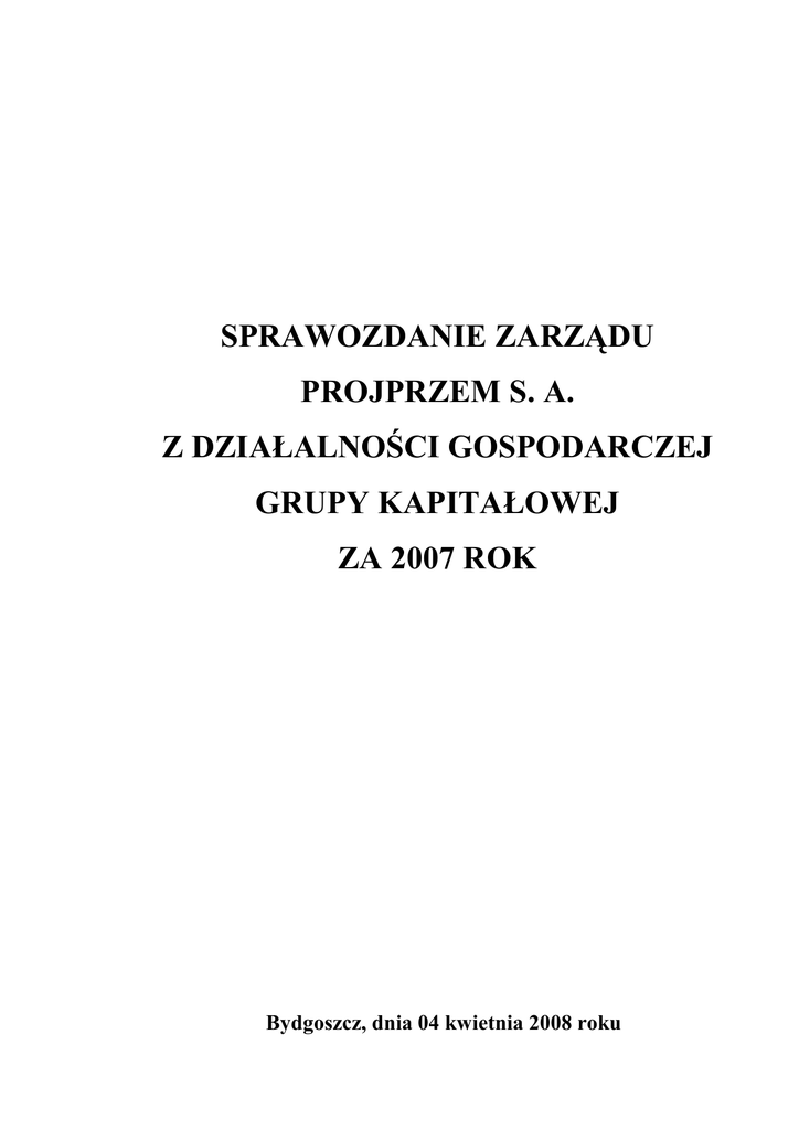 SPRAWOZDANIE ZARZĄDU PROJPRZEM S. A. Z DZIAŁALNOŚCI GOSPODARCZEJ GRUPY KAPITAŁOWEJ ZA 2007 ROK Bydgoszcz, dnia 04 kwietnia 2008 roku Sprawozdanie Zarządu PROJPRZEM S.A. – 2004 rok 1 Sprawozdanie Zarządu PROJPRZEM S.A. z działalności Grupy Kapitałowej za 2007 rok 1. Opis organizacji grupy kapitałowej emitenta ze wskazaniem jednostek podlegających konsolidacji oraz opis zmian w organizacji grupy kapitałowej emitenta z podaniem ich przyczyn Na dzień 31 grudnia 2007 roku Grupa Kapitałowa PROJPRZEM S.A. składała się z następujących podmiotów: − PROJPRZEM S.A. – jednostki dominującej oraz jednostek zaleŜnych: − PROJPRZEM DOM Sp. z o.o. z siedzibą w Bydgoszczy, w której kapitale zakładowym PROJPRZEM S.A. posiadał 10.000 udziałów o wartości 100 zł kaŜdy, co stanowiło 100% kapitału zakładowego i dawało 100% głosów na Zgromadzeniu Wspólników; kapitał zakładowy Spółki wynosił 1.000 tys. zł; Spółka została powołana w celu prowadzenia działalności deweloperskiej w zakresie budownictwa mieszkaniowego; na sfinansowanie części programu deweloperskiego zostały wniesione przez PROJPRZEM S.A. dopłaty do kapitału Spółki w wysokości 4.500 tys. złotych, − PROJPRZEM BUD Sp. z o.o. z siedzibą w Bydgoszczy, w której kapitale zakładowym PROJPRZEM S.A. posiadał 409 udziałów o wartości 1.000 zł kaŜdy, co stanowiło 99,76 % kapitału zakładowego i dawało 99,76 % głosów na Zgromadzeniu Wspólników; kapitał zakładowy Spółki wynosił 410 tys. zł; PROJPRZEM BUD Sp. z o.o. jest spółką, która działała uprzednio pod firmą OP ZRIPOL Sp. z o.o.; celem działalności Spółki jest wykonawstwo w zakresie budownictwa mieszkaniowego, głównie na zlecenie PROJPRZEM DOM Sp. z o.o., − Lubuskiego Przedsiębiorstwa Budownictwa Przemysłowego PROJPRZEM Sp. z o.o. z siedzibą w Nowej Soli, w której kapitale zakładowym PROJPRZEM S.A. posiadał 830 udziałów o wartości 5.000 zł kaŜdy, co stanowiło 100% kapitału zakładowego i dawało 100% głosów na Zgromadzeniu Wspólników; kapitał zakładowy Spółki wynosił 4.150 tys. zł; Spółka kontynuuje działalność nabytego przez PROJPRZEM S.A. w ramach prywatyzacji Lubuskiego Przedsiębiorstwa Budownictwa Przemysłowego w Nowej Soli w zakresie robót budowlanomontaŜowych, − PROMSTAHL GmbH z siedzibą w Gehrden k. Hannoveru na terenie Republiki Federalnej Niemiec, w której PROJPRZEM S.A. posiadał udziały o wartości nominalnej 50.000 EURO, co dawało 100% głosów na Zgromadzeniu Wspólników oraz stanowiło 100% kapitału; celem powołania Spółki jest sprzedaŜ produkowanych przez PROJPRZEM S.A. wyrobów metalowych na terenie Niemiec i innych krajów Europy. Graficzne przedstawienie struktury organizacyjnej grupy jednostek powiązanych PROJPRZEM S.A. oraz informacje dotyczące rodzaju powiązań w grupie na dzień 31 grudnia 2007 roku przedstawiały się następująco: 2/35 Sprawozdanie Zarządu PROJPRZEM S.A. z działalności Grupy Kapitałowej za 2007 rok PROJPRZEM S.A. 100,00 % kapitału zakładowego PROJPRZEM DOM Sp. z o.o. 99,76 % kapitału zakładowego PROJPRZEM BUD Sp. z o.o. 100,00 % kapitału zakładowego Lubuskie Przedsiębiorstwo Budownictwa Przemysłowego PROJPRZEM Sp. z o.o. 100,00 % kapitału zakładowego PROMSTAHL GmbH W okresie od 1 stycznia do 31 grudnia 2007 roku miały miejsce następujące zmiany w organizacji Grupy: W dniu 3 stycznia 2007 roku Sąd Rejonowy w Bydgoszczy XIII Wydział Gospodarczy KRS, wydał postanowienie, zgodnie z którym obniŜył kapitał zakładowy OP ZRIPOL sp. z o.o., podmiotu zaleŜnego od PROJPRZEM S.A. z kwoty 3.160.000 złotych do 410.000 złotych. W wyniku dokonanego umorzenia udziałów w OP ZRIPOL Sp. z o.o. pozostało 410 udziałów o wartości 1.000,00 zł kaŜdy, które dają 410 głosów na Zgromadzeniu Wspólników Spółki (jednemu udziałowi odpowiada jeden głos na Zgromadzeniu Wspólników). − W marcu 2007 roku PROJPRZEM S.A. załoŜył dwa nowe podmioty zaleŜne: PROJPRZEM DOM Sp. z o.o. z siedzibą w Bydgoszczy – w celu prowadzenia działalności deweloperskiej o kapitale zakładowym 50 tys. zł oraz − Lubuskie Przedsiębiorstwo Budowlane PROJPRZEM Sp. z o.o. z siedzibą w Nowej Soli o kapitale zakładowym 50 tys. zł – Spółka została powołana w celu kontynuowania w tej formie prawnej działalności Lubuskiego Przedsiębiorstwa Budownictwa Przemysłowego w Nowej Soli – Przedsiębiorstwa Państwowego, w którego prywatyzacji PROJPRZEM S.A. uczestniczył. W dniu 22 czerwca 2007 roku Zgromadzenie Wspólników PROJPRZEM DOM Sp. z o.o. podjęło uchwałę o podwyŜszeniu kapitału zakładowego Spółki do kwoty 1.000 tys. zł poprzez objęcie w niej przez PROJPRZEM S.A. 9500 udziałów o wartości 100 zł kaŜdy. Udziały zostały opłacone w końcu czerwca 2007 roku. PodwyŜszenie kapitału zostało zarejestrowane przez Sąd Rejonowy w Bydgoszczy w dniu 16 sierpnia 2007 roku. W dniu 8 sierpnia 2007 roku Zgromadzenie Wspólników OP ZRIPOL Sp. z o.o. podjęło uchwałę o zmianie nazwy Spółki na PROJPRZEM BUD Spółka z o.o. oraz o zmianie przedmiotu działalności Spółki. Spółka ma między innymi świadczyć usługi w zakresie budownictwa mieszkaniowego na rzecz innego podmiotu z grupy kapitałowej – PROJPRZEM DOM Sp. z o.o. W dniu 16 sierpnia 2007 roku Sąd Rejonowy w Bydgoszczy, XIII Wydział Gospodarczy Krajowego Rejestru Sądowego wydał postanowienie, w którym zatwierdził zmiany polegające na 3/35 Sprawozdanie Zarządu PROJPRZEM S.A. z działalności Grupy Kapitałowej za 2007 rok podwyŜszeniu kapitału zakładowego PROJPRZEM DOM Spółki z o.o. z wysokości 50.000 zł do 1.000.000 zł. W dniu 3 września 2007 roku PROJPRZEM S.A. utworzyła na terenie Republiki Federalnej Niemiec spółkę zaleŜną, w której na podstawie aktu załoŜycielskiego objęła 100 % udziałów w kapitale zakładowym. Spółka będzie działać pod firmą PROMSTAHL GmbH. Wysokość kapitału zakładowego wynos