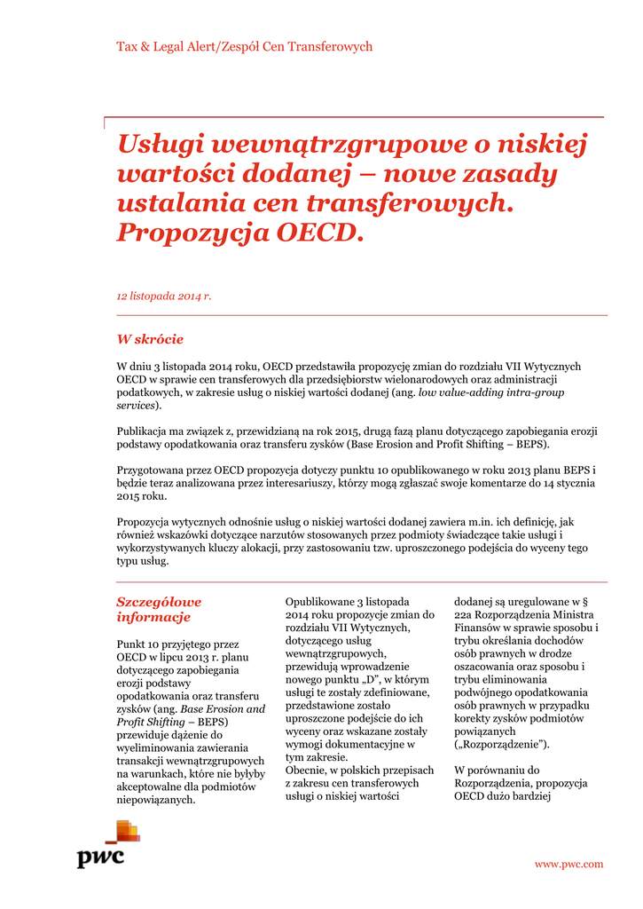 Tax & Legal Alert/Zespół Cen Transferowych Usługi wewnątrzgrupowe o niskiej wartości dodanej – nowe zasady ustalania cen transferowych. Propozycja OECD. 12 listopada 2014 r. W skrócie W dniu 3 listopada 2014 roku, OECD przedstawiła propozycję zmian do rozdziału VII Wytycznych OECD w sprawie cen transferowych dla przedsiębiorstw wielonarodowych oraz administracji podatkowych, w zakresie usług o niskiej wartości dodanej (ang. low value-adding intra-group services). Publikacja ma związek z, przewidzianą na rok 2015, drugą fazą planu dotyczącego zapobiegania erozji podstawy opodatkowania oraz transferu zysków (Base Erosion and Profit Shifting – BEPS). Przygotowana przez OECD propozycja dotyczy punktu 10 opublikowanego w roku 2013 planu BEPS i będzie teraz analizowana przez interesariuszy, którzy mogą zgłaszać swoje komentarze do 14 stycznia 2015 roku. Propozycja wytycznych odnośnie usług o niskiej wartości dodanej zawiera m.in. ich definicję, jak również wskazówki dotyczące narzutów stosowanych przez podmioty świadczące takie usługi i wykorzystywanych kluczy alokacji, przy zastosowaniu tzw. uproszczonego podejścia do wyceny tego typu usług. Szczegółowe informacje Punkt 10 przyjętego przez OECD w lipcu 2013 r. planu dotyczącego zapobiegania erozji podstawy opodatkowania oraz transferu zysków (ang. Base Erosion and Profit Shifting – BEPS) przewiduje dążenie do wyeliminowania zawierania transakcji wewnątrzgrupowych na warunkach, które nie byłyby akceptowalne dla podmiotów niepowiązanych. Opublikowane 3 listopada 2014 roku propozycje zmian do rozdziału VII Wytycznych, dotyczącego usług wewnątrzgrupowych, przewidują wprowadzenie nowego punktu „D”, w którym usługi te zostały zdefiniowane, przedstawione zostało uproszczone podejście do ich wyceny oraz wskazane zostały wymogi dokumentacyjne w tym zakresie. Obecnie, w polskich przepisach z zakresu cen transferowych usługi o niskiej wartości dodanej są uregulowane w § 22a Rozporządzenia Ministra Finansów w sprawie sposobu i trybu określania dochodów osób prawnych w drodze oszacowania oraz sposobu i trybu eliminowania podwójnego opodatkowania osób prawnych w przypadku korekty zysków podmiotów powiązanych („Rozporządzenie”). W porównaniu do Rozporządzenia, propozycja OECD dużo bardziej www.pwc.com Tax & Legal Alert szczegółowo traktuje kwestie opisywanych usług, w szczególności jeśli chodzi o sposób kalkulacji ceny. Usługi o niskiej wartości dodanej – jakie to usługi? Wedle definicji proponowanej przez OECD, katalog usług o niskiej wartości dodanej obejmuje usługi: pomocnicze, niezwiązane do podstawową działalnością grupy, nie angażujące istotnych wartości niematerialnych i nie prowadzące do ich wytworzenia, nie wiążące się z istotnym ryzykiem. Wśród kategorii usług o niskiej wartości dodanej wskazano w szczególności usługi: księgowe i audytu, zarządzania personelem (HR), przetwarzania danych, IT, PR, doradztwa prawnego i podatkowego oraz ogólną obsługę administracyjną. Inaczej niż w przypadku Rozporządzenia, w proponowanym rozdziale VII Wytycznych OECD wskazano również jakie kategorie usług nie powinny zostać uznane za usługi o niskiej wartości dodanej, tj. m.in.: stanowiące podstawową działalność grupy, badania i rozwój, usługi produkcyjne, sprzedaż, marketing i dystrybucja, usługi finansowe, ubezpieczeniowe i reasekuracji, usługi zarządcze oraz wydobycia i przetwarzania zasobów naturalnych. Uproszczone podejście do wyceny usług o niskiej wartości dodanej Zaproponowane, uproszczone podejście do ustalania ceny usług o niskiej wartości dodanej, przewiduje podjęcie następujących kroków: 1. określenie całkowitej bazy kosztowej związanej ze świadczeniem usług o niskiej wartości dodanej w grupie z wyłączeniem tzw. kosztów udziałowca, kosztów ponoszonych w związku z osiągnięciem korzyści wyłącznie dla podmiotu świadczącego usługi oraz kosztów związanych z usługami świadczonymi na rzecz wyłącznie jednego podmiotu z grupy. 2. alokację bazy kosztowej w do poszczególnych odbiorców usług w oparciu o klucze alokacji, które powinny być jednolicie stosowane w odniesieniu do poszczególnych kategorii świadczonych usług, 3. zastosowanie jednolitego narzutu zysku (niezależnie od kategorii usług) w wysokości od 2% do 5%, Warunki zastosowania uproszczonego podejścia Zastosowanie uproszczonego podejścia do ustalania ceny usług o niskiej wartości dodanej wymaga od podatnika zachowania szczególnej konsekwencji. Przy określaniu klucza alokacji kosztów w ramach ustalonej bazy kosztowej w skali grupy, kryterium alokacji musi być konsekwentnie stosowane dla poszczególnych kategorii usług. Jeśli więc np. dla jednego rodzaju usług HR za kryterium alokacji podatnik przyjmie liczbę pracowników poszczególnych podmiotów, to samo kryterium należy zastosować dla innych usług HR świadczonych w ramach grupy. Przyjęta wysokość narzutu musi być stosowana konsekwentnie do wszystkich kategorii usług o niskiej wartości dodanej. Przykładowo, przyjęcie narzutu w wysokości 3% do usług w zakresie IT oznacza, że taka sama wysokość narzutu będzie miała zastosowanie do usług HR. Niezależnie od zastosowania uproszczonej metody, na podatniku dalej będzie spoczywał obowiązek udowodnienia, iż nabywca usług osiągnął korzyść z tego tytułu, analogicznie jak w przypadku innych usług wewnątrzgrupowych. Wymogi dokumentacyjne Dokumentacja, jaką podatnik będzie zobowiązany sporządzić przy zastosowaniu uproszczonej metody będzie musiała zawierać następujące elementy: opis kategorii usług, uzasadnienie zakwalifikowania danej usługi jako usługi o niskiej wartości dodanej,, uzasadnienie nabycia usługi, opis oczekiwanych korzyści z tytułu nabycia usługi, opis oraz uzasadnienie zastosowanych kluczy alokacji, Propozycja OECD nie precyzuje czy wskazane w