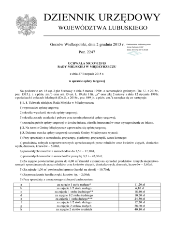 DZIENNIK URZĘDOWY WOJEWÓDZTWA LUBUSKIEGO Gorzów Wielkopolski, dnia 2 grudnia 2015 r. Elektronicznie podpisany przez: Anna Zacharia; LUW Poz. 2247 Data: 2015-12-02 14:25:26 UCHWAŁA NR XV/125/15 RADY MIEJSKIEJ W MIĘDZYRZECZU z dnia 27 listopada 2015 r. w sprawie opłaty targowej Na podstawie art. 18 ust. 2 pkt 8 ustawy z dnia 8 marca 1990r. o samorządzie gminnym (Dz. U. z 2015r., poz. 1515 j. t. z późn. zm.1) oraz art. 15 ust. 1, 19 pkt 1 lit. „a” oraz pkt 2 ustawy z dnia 12 stycznia 1991r. o podatkach i opłatach lokalnych (Dz.U. z 2014r., poz. 849 j.t. z późn. zm.2) zarządza się co następuje: § 1. 1. Uchwałą niniejszą Rada Miejska w Międzyrzeczu; 1) wprowadza opłatę targową; 2) określa wysokość stawek opłaty targowej; 3) określa zasady ustalania i poboru oraz termin płatności opłaty targowej; 4) zarządza pobór opłaty targowej w drodze inkasa, określa interesantów oraz wynagrodzenie za inkaso. § 2. Na terenie Gminy Międzyrzecz wprowadza się opłatę targową. § 3. Dzienna stawka opłaty targowej na terenie Gminy Międzyrzecz wynosi: 1) Przy sprzedaży z samochodu, przyczepy, platformy, przyczepki, wozu konnego: a) produktów rolnych nieprzetworzonych sprzedawanych przez rolników oraz kwiatów ciętych, doniczkowych, drzewek, krzewów – 5,60zł, b) pozostałych towarów z samochodów do 3,5 t – 17,30zł, c) pozostałych towarów z samochodów powyżej 3,5 t – 42,30zł; 2) Za zajęcie powierzchni gruntu do 6,00 m2 (handel z ziemi) na sprzedaż produktów rolnych nieprzetworzonych sprzedawanych przez rolników oraz kwiatów ciętych, doniczkowych, drzewek, krzewów – 5,60zł; 3) Za zajęcie 1,00 m2 powierzchni gruntu (handel na ziemi) – 10,70zł; 4) Za prowadzenie handlu z ręki, koszów itp. – 2,00zł; 5) Przy sprzedaży z oznaczonego stołu pod zadaszeniem: a b c d e f g h za zajęcie 1 stołu małego* za zajęcie 1/2 stołu małego za zajęcie 1 stołu średniego** za zajęcie 1/2 stołu średniego za zajęcie 1 stołu dużego*** za zajęcie 1/2 stołu dużego za zajęcie 2 stołów małych za zajęcie 2 stołów średnich 11,20 zł 6,10 zł 18,40 zł 10,20 zł 24,50 zł 12,20 zł 28,60 zł 40,10 zł Dziennik Urzędowy Województwa Lubuskiego i j k l ł m n –2– Poz. 2247 za zajęcie 2 stołów dużych za zajęcie 3 stołów małych za zajęcie 3 stołów średnich za zajęcie 3 stołów dużych za zajęcie 4 stołów małych za zajęcie 4 stołów średnich za zajęcie 4 stołów dużych 55,10 zł 49,00 zł 61,20 zł 74,50 zł 71,40 zł 106,00 zł 139,70 zł * - za stół mały przyjmuje się stół o powierzchni od 1,00m2 do 1,40m2 ** - za stół średni przyjmuje się stół o powierzchni od 1,41m2 do 1,70m2 *** - za stół duży przyjmuje się stół o powierzchni od 2,15m2 do 2,70m2 § 4. W przypadku, gdy dla danej sprzedaży właściwa jest więcej niż jedna stawka opłaty targowej stosuje się stawkę wyższą. § 5. Terminem płatności opłaty targowej jest dzień, w którym dokonywana jest sprzedaż. Opłata jest płatna, bez wezwania, na rachunek bankowy Gminy Międzyrzecz, z zastrzeżeniem § 6. § 6. 1. Zarządza się pobór opłaty targowej w drodze inkasa. 2. Pobór opłaty targowej powierza się Katarzynie Szabat i Annie Kuźma. 3. Ustala się wynagrodzenie inkasenta, o którym mowa w ust. 2, za pobór opłaty targowej w wysokości 10% pobranych i terminowo odprowadzonych kwot. § 7. Wykonanie uchwały powierza się Burmistrzowi Międzyrzecza. § 8. Z dniem wejścia w życie niniejszej uchwały, traci moc uchwała nr XI/112/03 Rady Miejskiej w Międzyrzeczu z dnia 2 grudnia 2003r. w sprawie ustalenia stawek opłaty targowej, zarządzania poboru opłat w drodze inkasa, wyznaczenia inkasenta oraz ustalenia wynagrodzenia za inkaso. (Dziennik Urzędowy Województwa Lubuskiego z 2003r., Nr 100, poz. 1483 zm. z 2008r., Nr 127, poz. 1902, z 2010r., Nr 96, poz. 1405, z 2014r., poz. 1117). § 9. 9. Uchwała wchodzi w życie po upływie 14 dniu od dnia ogłoszenia w Dzienniku Urzędowym Województwa Lubuskiego, nie wcześnie jednak niż z dniem 1 stycznia 2016r. Przewodnicząca Rady Miejskiej w Międzyrzeczu Maria Kijak 1] 2] Zmiany wymienionej ustawy zostały ogłoszone w Dz.U. 2015.1045 Zmiany wymienionej ustawy zostały ogłoszone w Dz.U. 2015.528, Dz.U. 2015.699, Dz.U. 2015.774, Dz.U. 2015.1045, Dz.U. 2015.1283, Dz.U. 2015.1777, M.P. 2015.735, M.P. 2015.912, M.P. 2015.1029.