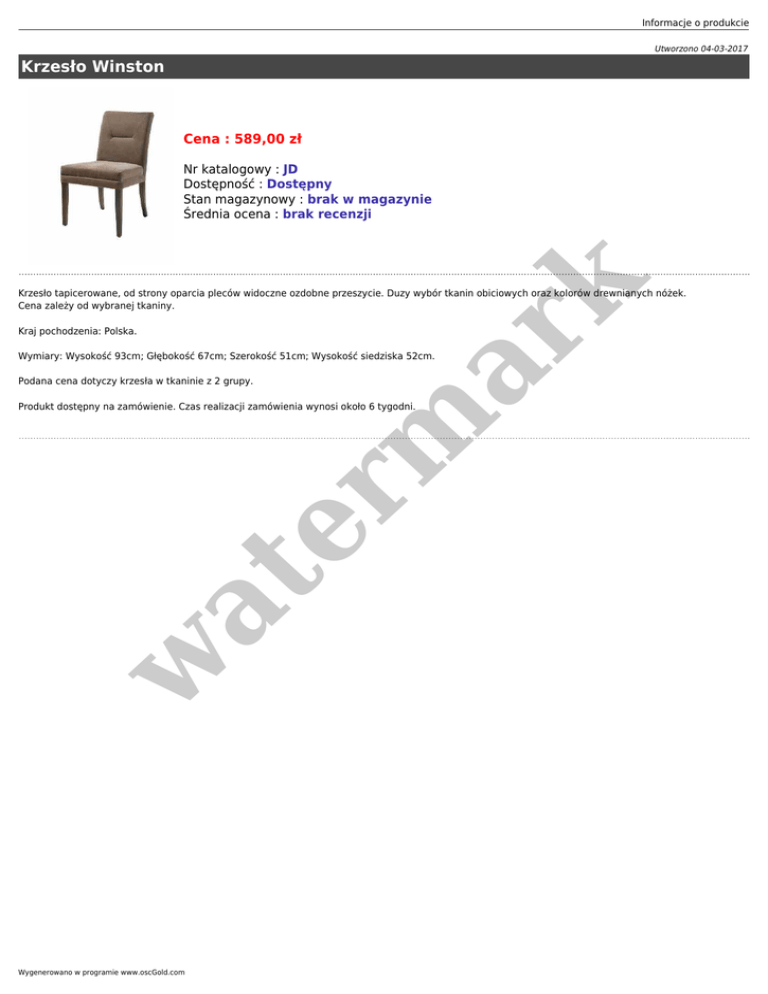 Informacje o produkcie Utworzono 04-03-2017 Krzesło Winston Cena : 589,00 zł er m ar k Nr katalogowy : JD Dostępność : Dostępny Stan magazynowy : brak w magazynie Średnia ocena : brak recenzji Krzesło tapicerowane, od strony oparcia pleców widoczne ozdobne przeszycie. Duzy wybór tkanin obiciowych oraz kolorów drewnianych nóżek. Cena zależy od wybranej tkaniny. Kraj pochodzenia: Polska. Wymiary: Wysokość 93cm; Głębokość 67cm; Szerokość 51cm; Wysokość siedziska 52cm. Podana cena dotyczy krzesła w tkaninie z 2 grupy. w at Produkt dostępny na zamówienie. Czas realizacji zamówienia wynosi około 6 tygodni. Wygenerowano w programie www.oscGold.com