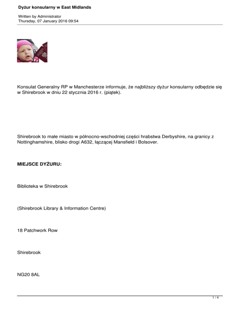 Dyżur konsularny w East Midlands Written by Administrator Thursday, 07 January 2016 09:54 Konsulat Generalny RP w Manchesterze informuje, że najbliższy dyżur konsularny odbędzie się w Shirebrook w dniu 22 stycznia 2016 r. (piątek). Shirebrook to małe miasto w północno-wschodniej części hrabstwa Derbyshire, na granicy z Nottinghamshire, blisko drogi A632, łączącej Mansfield i Bolsover. MIEJSCE DYŻURU: Biblioteka w Shirebrook (Shirebrook Library & Information Centre) 18 Patchwork Row Shirebrook NG20 8AL 1/4 Dyżur konsularny w East Midlands Written by Administrator Thursday, 07 January 2016 09:54 W tym dniu przyjmowane będą wnioski o wszystkie rodzaje paszportów – dla dzieci i dorosłych. ZAPISY NA SPOTKANIE Z KONSULEM – DYŻUR KONSULARNY Aby umówić się na spotkanie z konsulem w trakcie dyżuru konsularnego należy wysłać e-mail na adres: [email protected]. W temacie e-maila prosimy o podanie nazwy miejscowości, do której chcecie się Państwo umówić na dyżur (SHIREBROOK), a w treści e-maila następujących informacji: 1. Nazwisko i imię zgłaszającego. 2. Rodzaj załatwianej sprawy (np. paszport 5-letni dla małoletniego, paszport 10-letni dla osoby dorosłej lub małoletniego w wieku 13 – 18 lat, paszport tymczasowy dla dziecka do 1 roku życia urodzonego w Wielkiej Brytanii, które nie posiada numeru PESEL). 3. Dane osoby, dla której będzie składany wniosek w tym: – nazwisko i imię, – data urodzenia (RRRR-MM-DD), – informacja o posiadanym paszporcie, paszporcie tymczasowym lub dowodzie osobistym i terminie ważności dokumentów, 2/4 Dyżur konsularny w East Midlands Written by Administrator Thursday, 07 January 2016 09:54 – numer polskiego lub brytyjskiego aktu urodzenia, – numer PESEL. 4. Informacja o szczególnych okolicznościach dot. wydania dokumentu paszportowego, np. zagubienie, zniszczenie lub kradzież ważnego paszportu lub dowodu osobistego, brak zgody jednego z rodziców na wydanie paszportu dla dziecka, brak odpisu polskiego aktu urodzenia dziecka w przypadku aplikowania o dokument dla małoletniego powyżej 1 roku życia, fakt bycia poszukiwanym/ą przez polskie organy ścigania itp. 5. Dane kontaktowe, w tym numer telefonu oraz adres zamieszkania (wraz z nazwą hrabstwa). Zgłoszenie powinno zawierać dane jednej osoby. W przypadku zgłoszenia większej liczby osób, proszę wysłać oddzielny e-mail dot. każdej osoby. Osoby, które prześlą prawidłowe zgłoszenie i zostaną zapisane na dyżur otrzymają e-mail z potwierdzeniem spotkania wraz ze szczegółowymi informacjami dotyczącymi daty i godziny oraz dokumentów, które należy przynieść ze sobą na spotkanie. W pierwszej kolejności będą zapisywane osoby zamieszkujące w Manchesterskim Okręgu Konsularnym. Osoby spoza okręgu zostaną zapisane tylko w przypadku dostępnych miejsc. Jednocześnie informujemy, że liczba miejsc na spotkanie z konsulem jest ograniczona i o zapisie na spotkanie będzie decydować kolejność zgłoszeń. Tylko osoby, które otrzymają potwierdzenie z datą i godziną spotkania będą mogły załatwić swoją sprawę w trakcie dyżuru konsularnego. Źródło: Konsulat Generalny RP w Manchesterze 3/4 Dyżur konsularny w East Midlands Written by Administrator Thursday, 07 January 2016 09:54 4/4