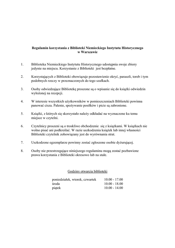 Regulamin korzystania z Biblioteki Niemieckiego Instytutu Historycznego w Warszawie 1. Biblioteka Niemieckiego Instytutu Historycznego udostępnia swoje zbiory jedynie na miejscu. Korzystanie z Biblioteki jest bezpłatne. 2. Korzystających z Biblioteki obowiązuje pozostawienie okryć, parasoli, toreb i tym podobnych rzeczy w przeznaczonych do tego szafkach. 3. Osoby odwiedzające Bibliotekę proszone są o wpisanie się do książki odwiedzin wyłożonej na recepcji. 4. W interesie wszystkich użytkowników w pomieszczeniach Biblioteki powinna panować cisza. Palenie, spożywanie posiłków i picie są zabronione. 5. Książki, z których się skorzystało należy odkładać na wyznaczone ku temu miejsce w czytelni. 6. Czytelnicy proszeni są o troskliwe obchodzenie się z książkami. W książkach nie wolno pisać ani podkreślać. W razie uszkodzenia książek lub innej własności Biblioteki czytelnik zobowiązany jest do wyrównania strat. 7. Uszkodzone egzemplarze powinny zostać zgłoszone osobie dyżurującej. 8. Osoby nie przestrzegające niniejszego regulaminu mogą zostać pozbawione prawa korzystania z Biblioteki okresowo lub na stałe. Godziny otwarcia biblioteki poniedziałek, wtorek, czwartek środa piątek 10.00 - 17.00 10.00 - 18.00 10.00 - 14.00