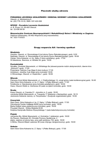 Placówki służby zdrowia PORADNIA LECZENIA UZALEŻNIEŃ I ODDZIAŁ DZIENNY LECZENIA UZALEŻNIEŃ Otwock, ul. Mickiewicza 8 tel. (22) 778-12-33, SMS: 537-422-006 SPZOZ - Poradnia Leczenia Uzależnień ul. B. Prusa 1/3, 05-400 Otwock tel.: 22 636 56 09 Mazowieckie Centrum Neuropsychiatrii i Rehabilitacji Dzieci i Młodzieży w Zagórzu Zagórze k/Warszawy, 05-462 Wiązowna (woj.mazowieckie) tel.: 022-7733323 Grupy wsparcia AA i terminy spotkań Niedziela Orędzie, Otwock, ul. Żeromskiego 6 (od strony Domu Rekolekcyjnego), godz. 9:30 Nadzieja, Otwock, ul. Żeromskiego 6 (od strony Domu Rekolekcyjnego), godz. 16:00 Ostoja, Góra Kalwaria, ul. Ks. Sajny 2 (dom parafialny), godz. 17:00 W klasztorze, Siennica, ul. Mińska 34, godz. 19:00 Poniedziałek Strzałka, Grodzisk Mazowiecki, ul. Kilińskiego 8a (stowarzyszenie rodzin abstynenckich, dawne kino „Wolność”) godz. 17:00 Przemiana, Halinów 3-go Maja 8 (dom kultury) 17:30 Antidotum, Józefów 3-go Maja (przy kościele) 18:00 U Wincentego, Otwock, ul. Kopernika 1, godz. 18:00 Wtorek Pierwszy Krok Mińsk Mazowiecki, ul. J. Chełmońskiego 14, urząd gminy (sala konferencyjna) godz. 16:45 Sami Swoi Góra Kalwaria, ul. ks. Z. Sajny 1 (Pałac Biskupi), godz. 17:00 Ś ródborów ul. Narutowicza (przy kościele parafialnym), godz. 18:00 Oaza, Otwock Wielki ul. Zamkowa 45 (sala na tyłach kościoła), godz. 18:00 Środa Kresy Otwock, ul. Czerska 21 - domofon nr. 5, godz. 18:00 Jutrzenka Mińsk Mazowiecki, ul. Traugutta 17 (plebania u Mariawitów), godz. 18:15 Jezioranie Sobienie Jeziory, ul. Parysowska 1 (budynek organistówki) godz. 19:00 Czwartek Sami Swoi, Góra Kalwaria ul. ks. Z. Sajny 1 (Pałac Biskupi), godz. 17:00 Odrodzenie Ś wider Kołłątaja 80/82 (przy kościele), godz. 18:00 Barka Kołbiel (stara plebania przy kościele), godz. 18:00 Przystań Otwock - Wólka Mlądzka18:00 Księdza Kardynała Stefana Wyszyńskiego 1 (sala katechetyczna przy kościele) Piątek Jutrzenka Bis, Mińsk Mazowiecki, ul. Kościelna 1 (plebania), godz. 18:00 Za Piecem, Radiówek 25, Ośrodek Pomocy Społecznej, 2 piętro, wejście od strony lasu, przy pętli autobusu 722, godz. 18:00 U Mirka, Otwock-Mlądz Laskowa 38 (czas mityngu nieograniczony), godz. 19:00 Sobota Sami Swoi Góra Kalwaria ks. Z. Sajny 1 (Pałac Biskupi), godz. 17:00