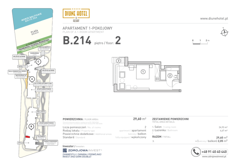 YCK A Ł TEA B RZE C S M O BALTI IE www.diunehotel.pl APARTAMENT 1-POKOJOWY ŻA P L AACH BE PLAN OF A 1-ROOM APARTMENT WA iego ERO wsk A ROW UTE o k ł u O K ul. S I ŚCIEŻ BIKE R ADA DE AND RESTAURACJA N E A M RESTAURANT PRO ROMEN P WEJŚCIE GŁÓWNE MAIN ENTRANCE B.214 piętro / floor: N 2 0 1 2m KAWIARNIA CAFÉ 3 C HOTEL***** WEJŚCIE GŁÓWNE MAIN ENTRANCE SALA ZABAW DLA DZIECI PLAY ROOM RESTAURACJA RESTAURANT 1 2 A SALA WIELOFUNKCYJNA MULTIFUNCTIONAL ROOM APARTAMENTOWIEC APARTMENT BUILDING WELLNESS POWIERZCHNIA / FLOOR AREA: B APARTAMENTOWIEC APARTMENT BUILDING SIŁOWNIA FITNESS SPA GARAŻ PODZIEMNY UNDERGROUND CAR PARK 29,60 m² Pomiarów dokonano zgodnie z polską normą PN-70/B-02365. Area measured in accordance with Polish standard PN-70/B-02365. Licza pomieszczeń / No. of rooms Rodzaj lokalu / Property type Powierzchnie dodatkowe / Additional areas Standard / Standard 2 apartment / apartament balcony / balkon fully equipped / wykończony ZESTAWIENIE POWIERZCHNI TOTAL AREA DETAILS: 1. Salon / Living room 2. Łazienka / Bathroom l RAZEM / TOTAL: 3. 24,93 m² 4,67 m² 29,60 m² + (balcony / balkon) 2,05 m² Inwestor / Investor: ZAINWESTUJ I ZARABIAJ PODWÓJNIE! INVEST AND EARN DOUBLE! +48 91 40 40 440 www.zdrojowainvest.pl