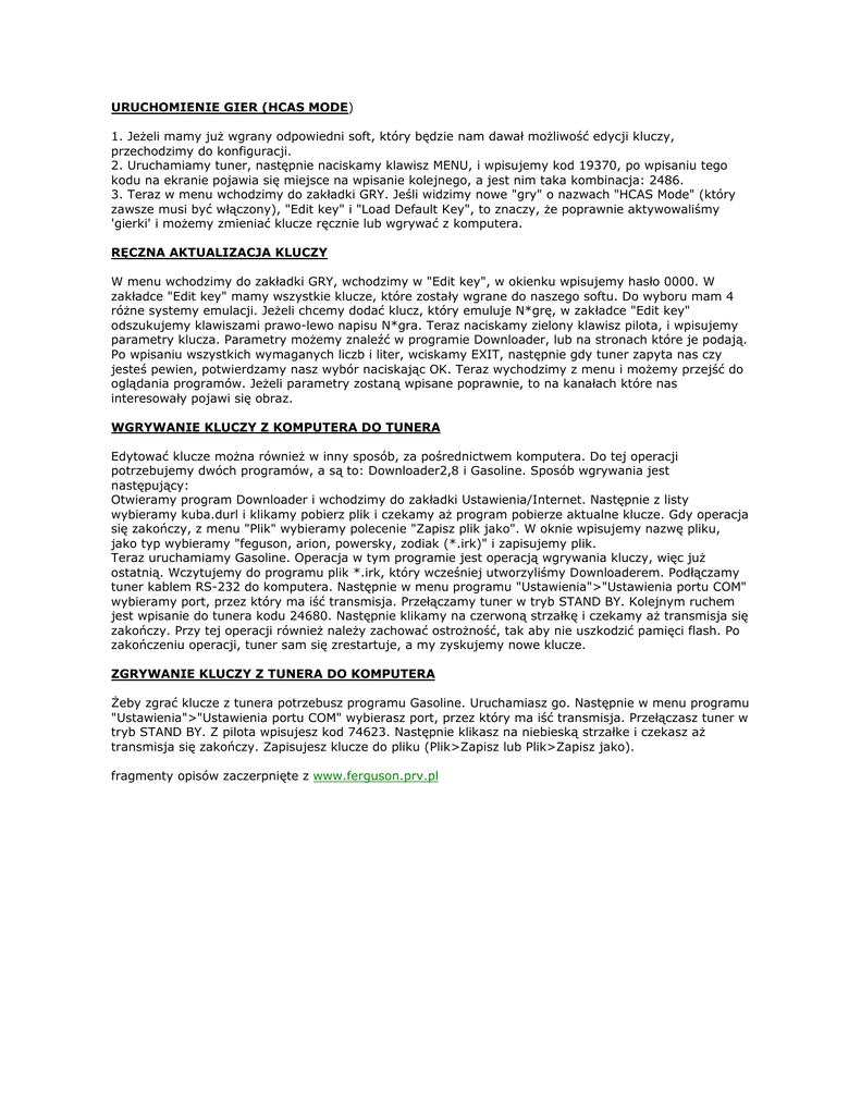 URUCHOMIENIE GIER (HCAS MODE) 1. Jeżeli mamy już wgrany odpowiedni soft, który będzie nam dawał możliwość edycji kluczy, przechodzimy do konfiguracji. 2. Uruchamiamy tuner, następnie naciskamy klawisz MENU, i wpisujemy kod 19370, po wpisaniu tego kodu na ekranie pojawia się miejsce na wpisanie kolejnego, a jest nim taka kombinacja: 2486. 3. Teraz w menu wchodzimy do zakładki GRY. Jeśli widzimy nowe "gry" o nazwach "HCAS Mode" (który zawsze musi być włączony), "Edit key" i "Load Default Key", to znaczy, że poprawnie aktywowaliśmy 'gierki' i możemy zmieniać klucze ręcznie lub wgrywać z komputera. RĘCZNA AKTUALIZACJA KLUCZY W menu wchodzimy do zakładki GRY, wchodzimy w "Edit key", w okienku wpisujemy hasło 0000. W zakładce "Edit key" mamy wszystkie klucze, które zostały wgrane do naszego softu. Do wyboru mam 4 różne systemy emulacji. Jeżeli chcemy dodać klucz, który emuluje N*grę, w zakładce "Edit key" odszukujemy klawiszami prawo-lewo napisu N*gra. Teraz naciskamy zielony klawisz pilota, i wpisujemy parametry klucza. Parametry możemy znaleźć w programie Downloader, lub na stronach które je podają. Po wpisaniu wszystkich wymaganych liczb i liter, wciskamy EXIT, następnie gdy tuner zapyta nas czy jesteś pewien, potwierdzamy nasz wybór naciskając OK. Teraz wychodzimy z menu i możemy przejść do oglądania programów. Jeżeli parametry zostaną wpisane poprawnie, to na kanałach które nas interesowały pojawi się obraz. WGRYWANIE KLUCZY Z KOMPUTERA DO TUNERA Edytować klucze można również w inny sposób, za pośrednictwem komputera. Do tej operacji potrzebujemy dwóch programów, a są to: Downloader2,8 i Gasoline. Sposób wgrywania jest następujący: Otwieramy program Downloader i wchodzimy do zakładki Ustawienia/Internet. Następnie z listy wybieramy kuba.durl i klikamy pobierz plik i czekamy aż program pobierze aktualne klucze. Gdy operacja się zakończy, z menu "Plik" wybieramy polecenie "Zapisz plik jako". W oknie wpisujemy nazwę pliku, jako typ wybieramy "feguson, arion, powersky, zodiak (*.irk)" i zapisujemy plik. Teraz uruchamiamy Gasoline. Operacja w tym programie jest operacją wgrywania kluczy, więc już ostatnią. Wczytujemy do programu plik *.irk, który wcześniej utworzyliśmy Downloaderem. Podłączamy tuner kablem RS-232 do komputera. Następnie w menu programu "Ustawienia">"Ustawienia portu COM" wybieramy port, przez który ma iść transmisja. Przełączamy tuner w tryb STAND BY. Kolejnym ruchem jest wpisanie do tunera kodu 24680. Następnie klikamy na czerwoną strzałkę i czekamy aż transmisja się zakończy. Przy tej operacji również należy zachować ostrożność, tak aby nie uszkodzić pamięci flash. Po zakończeniu operacji, tuner sam się zrestartuje, a my zyskujemy nowe klucze. ZGRYWANIE KLUCZY Z TUNERA DO KOMPUTERA Żeby zgrać klucze z tunera potrzebusz programu Gasoline. Uruchamiasz go. Następnie w menu programu "Ustawienia">"Ustawienia portu COM" wybierasz port, przez który ma iść transmisja. Przełączasz tuner w tryb STAND BY. Z pilota wpisujesz kod 74623. Następnie klikasz na niebieską strzałke i czekasz aż transmisja się zakończy. Zapisujesz klucze do pliku (Plik>Zapisz lub Plik>Zapisz jako). fragmenty opisów zaczerpnięte z www.ferguson.prv.pl