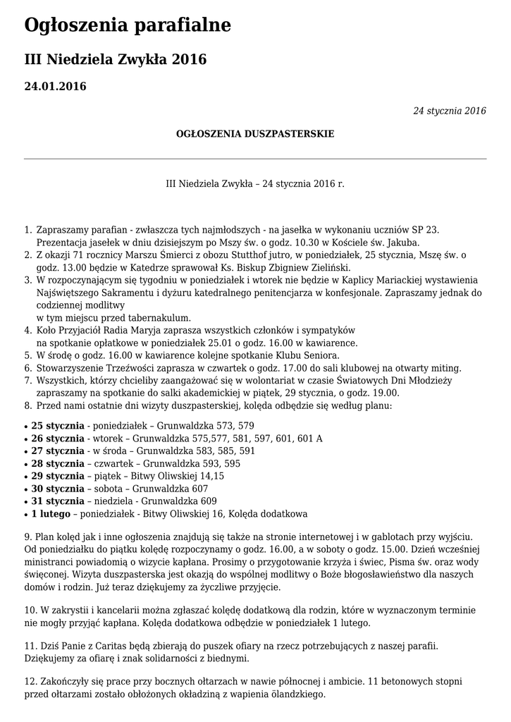 Ogłoszenia parafialne III Niedziela Zwykła 2016 24.01.2016 24 stycznia 2016 OGŁOSZENIA DUSZPASTERSKIE III Niedziela Zwykła – 24 stycznia 2016 r. 1. Zapraszamy parafian - zwłaszcza tych najmłodszych - na jasełka w wykonaniu uczniów SP 23. Prezentacja jasełek w dniu dzisiejszym po Mszy św. o godz. 10.30 w Kościele św. Jakuba. 2. Z okazji 71 rocznicy Marszu Śmierci z obozu Stutthof jutro, w poniedziałek, 25 stycznia, Mszę św. o godz. 13.00 będzie w Katedrze sprawował Ks. Biskup Zbigniew Zieliński. 3. W rozpoczynającym się tygodniu w poniedziałek i wtorek nie będzie w Kaplicy Mariackiej wystawienia Najświętszego Sakramentu i dyżuru katedralnego penitencjarza w konfesjonale. Zapraszamy jednak do codziennej modlitwy w tym miejscu przed tabernakulum. 4. Koło Przyjaciół Radia Maryja zaprasza wszystkich członków i sympatyków na spotkanie opłatkowe w poniedziałek 25.01 o godz. 16.00 w kawiarence. 5. W środę o godz. 16.00 w kawiarence kolejne spotkanie Klubu Seniora. 6. Stowarzyszenie Trzeźwości zaprasza w czwartek o godz. 17.00 do sali klubowej na otwarty miting. 7. Wszystkich, którzy chcieliby zaangażować się w wolontariat w czasie Światowych Dni Młodzieży zapraszamy na spotkanie do salki akademickiej w piątek, 29 stycznia, o godz. 19.00. 8. Przed nami ostatnie dni wizyty duszpasterskiej, kolęda odbędzie się według planu: ● ● ● ● ● ● ● ● 25 stycznia - poniedziałek – Grunwaldzka 573, 579 26 stycznia - wtorek – Grunwaldzka 575,577, 581, 597, 601, 601 A 27 stycznia - w środa – Grunwaldzka 583, 585, 591 28 stycznia – czwartek – Grunwaldzka 593, 595 29 stycznia – piątek – Bitwy Oliwskiej 14,15 30 stycznia – sobota – Grunwaldzka 607 31 stycznia – niedziela - Grunwaldzka 609 1 lutego – poniedziałek - Bitwy Oliwskiej 16, Kolęda dodatkowa 9. Plan kolęd jak i inne ogłoszenia znajdują się także na stronie internetowej i w gablotach przy wyjściu. Od poniedziałku do piątku kolędę rozpoczynamy o godz. 16.00, a w soboty o godz. 15.00. Dzień wcześniej ministranci powiadomią o wizycie kapłana. Prosimy o przygotowanie krzyża i świec, Pisma św. oraz wody święconej. Wizyta duszpasterska jest okazją do wspólnej modlitwy o Boże błogosławieństwo dla naszych domów i rodzin. Już teraz dziękujemy za życzliwe przyjęcie. 10. W zakrystii i kancelarii można zgłaszać kolędę dodatkową dla rodzin, które w wyznaczonym terminie nie mogły przyjąć kapłana. Kolęda dodatkowa odbędzie w poniedziałek 1 lutego. 11. Dziś Panie z Caritas będą zbierają do puszek ofiary na rzecz potrzebujących z naszej parafii. Dziękujemy za ofiarę i znak solidarności z biednymi. 12. Zakończyły się prace przy bocznych ołtarzach w nawie północnej i ambicie. 11 betonowych stopni przed ołtarzami zostało obłożonych okładziną z wapienia ölandzkiego. 13. Caritas Archidiecezji Gdańskiej zaprasza do udziału w Balu Charytatywnym w dniu 6 lutego. Będzie on okazją do finansowego wsparcia Domu Hospicyjnego św. Józefa w Sopocie. Więcej informacji można znaleźć na plakatach wywieszonych na tablicach z informacjami. (Sprzedaż zaproszeń oraz kontakt: 600 048 122; [email protected]). 14. Przypominamy, ze trwa ustanowiony przez Papieża Franciszka Rok Miłosierdzia. Ks. Arcybiskup Metropolita Gdański ustanowił na ten czas Bazylikę Archikatedralną jednym z Kościołów Jubileuszowych w archidiecezji gdańskiej. Związana jest z tym łaska odpustu. Odpust można zyskać raz dziennie dla siebie lub dla zmarłych. Aby uzyskać łaskę odpustu zupełnego należy spełnić zwyczajne warunki określone przez Kościół oraz dodatkowo wypełnić warunki dotyczące Roku Jubileuszowego. Przypominamy, iż zwykłe warunki uzyskania odpustu zupełnego to: ● ● ● ● sakramentalna spowiedź Komunia Eucharystyczna modlitwa według intencji Ojca świętego wykluczenie przywiązania do jakiegokolwiek grzechu, nawet lekkiego Dodatkowe warunki związane z odpustem zupełnym w Roku Jubileuszowym Miłosierdzia można spełnić na różne sposoby: ● ● ● ● ● pielgrzymka do Drzwi Świętych (Bram Miłosierdzia) w katedrze lub w kościele wyznaczonym przez biskupa uczestnictwo we Mszy Świętej refleksja nad miłosierdziem odmówienie wyznania wiary („Wierzę w Boga” lub „Wierzę w Jednego Boga”) modlitwa za papieża 15. Przy wyjściu do nabycia prasa religijna. 16. Polećmy Bogu naszych zmarłych w minionym tygodniu parafian: śp. Romana Wodkowskiego (l.93, ul. Poczty Gdańskiej), śp. Józefa Traczuka (l. 91, ul. Tatrzańska) oraz zmarłych z naszych rodzin. Dobry Jezu…