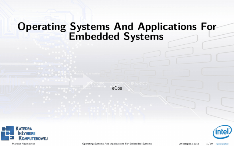 Operating Systems And Applications For Embedded Systems eCos Mariusz Naumowicz Operating Systems And Applications For Embedded Systems 20 listopada 2016 1 / 19 Plan eCos introduction eCos Core Components Processor and Evaluation Platform Support Component Repository Directory Structure Descriptions Exceptions and Interrupts Exceptions flow Interrupts flow Interreupts Synchronization Mechanisms Device driver packages Compatibility Layers POSIX µTRON File Systems Networking Support OpenBSD FreeBSD Mariusz Naumowicz Operating Systems And Applications For Embedded Systems 20 listopada 2016 2 / 19 eCos Core Components I Hardware Abstraction Layer (HAL)—providing a software layer that gives general access to the hardware. I Kernel—including interrupt and exception handling, thread and synchronization support, a choice of scheduler implementations, timers, counters, and alarms. I ISO C and math libraries—standard compatibility with function calls. I Device drivers—including standard serial, Ethernet, Flash ROM, and others. I GNU debugger (GDB) support—provides target software for communicating with a GDB host enabling application debugging. Mariusz Naumowicz Operating Systems And Applications For Embedded Systems 20 listopada 2016 3 / 19 Processor and Evaluation Platform Support I ARM I Fujitsu FR-V I Hitachi H8/300 I Intel x86 I Matsushita AM3x I MIPS I NEC V8xx I I PowerPC Samsung CalmRISC16/32 I SPARC I SPARClite I SuperH Mariusz Naumowicz Operating Systems And Applications For Embedded Systems 20 listopada 2016 4 / 19 Component Repository Directory Structure Descriptions I I compat: Contains packages for the POSIX (IEEE 1003.1) and µITRON 3.0 compatibility. cygmon Package contents for Cygmon standalone debug monitor. I devs: Includes all device driver hardware-specific components such as serial, Ethernet, and PCMCIA. I error: Contains common error and status code packages. This allows commonality among packages for error and status reporting. I fs: Includes the ROM and RAM file system packages. I hal: Incorporates all HAL target hardware packages. I infra: Contains the eCos infrastructure such as common types, macros, tracing, assertions, and startup options. I io: Packages for all generic hardware-independent Input/Output (I/O) system support, such as Ethernet, flash, and serial, which is the basis for system device drivers. I isoinfra: Contains package that provides support for ISO C libraries (such as stdlib and stdio) and POSIX implementations. Mariusz Naumowicz Operating Systems And Applications For Embedded Systems 20 listopada 2016 5 / 19 Component Repository Directory Structure Descriptions II I kernel: Includes the package that provides the core functionality (such as the scheduler, semaphores, and threads) of the eCos kernel. I language: Incorporates the packages for the ISO C and math libraries, which allows the application to use well-known standard C library functions and the floating-point mathematical library. I net: Packages for basic networking support including TCP, UDP and IP, and the SNMP protocol and agent support libraries based on the UCD-SNMP project. I redboot: Contains package for the RedBoot standalone debug ROM monitor. I services: Includes packages for dynamic memory allocation and support for compression and decompression library. Mariusz Naumowicz Operating Systems And Applications For Embedded Systems 20 listopada 2016 6 / 19 Exceptions flow Mariusz Naumowicz Operating Systems And Applications For Embedded Systems 20 listopada 2016 7 / 19 Interrupts flow Mariusz Naumowicz Operating Systems And Applications For Embedded Systems 20 listopada 2016 8 / 19 Interreupts I 1. The first item in Figure shows the execution of a thread. 2. The next event is an external hardware interrupt. 3. Now, the processor looks into the VSR table, hal_vsr_table, to determine the location of the interrupt vector service routine to execute. During HAL startup, hal_mon_init installs the default interrupt VSR into the VSR table for the external interrupt. 4. Next, the default interrupt VSR begins executing. The first task of the default interrupt VSR is to save the current processor state. As mentioned before, the current processor’s state can be saved either on a thread’s stack or on the separate interrupt stack, depending on the HAL interrupt configuration options selected. After the processor’s state information has been stored, the default interrupt VSR increments the cyg_scheduler_sched_lock kernel variable to ensure that scheduling does not take place. Next, the default vector service routine needs to find out what ISR to call. ISRs are installed by the application. The HAL uses three tables, implemented as arrays, to maintain the ISR information needed. The size of these tables is architecture specific. The ISR tables are: Mariusz Naumowicz Operating Systems And Applications For Embedded Systems 20 listopada 2016 9 / 19 Interreupts II 5. hal_interrupt_handlers—contains the addresses of the interrupt service routines installed by the application. 6. hal_interrupt_data—contains the data to be passed into the ISR. 7. hal_interrupt_objects—contains information that is used at the kernel level and hidden from the application layer. The HAL default interrupt VSR uses an architecture-specific function, hal_intc_decode, to perform the lookup into the hal_interrupt_handlers table. This function finds the index into the table based on the interrupt vector number and/or through examining the hardware, such as an interrupt controller. The value is used for indexing into the data (which is passed into the ISR) and objects (used at the kernel level) tables as well. 8. Next, the default VSR calls the ISR installed by the application. The ISR, which executes at the application level, performs any necessary functions for the particular interrupt. The ISR notifies the kernel that the DSR should be posted for execution by returning CYG_ISR_CALL_DSR. The ISR also returns CYG_