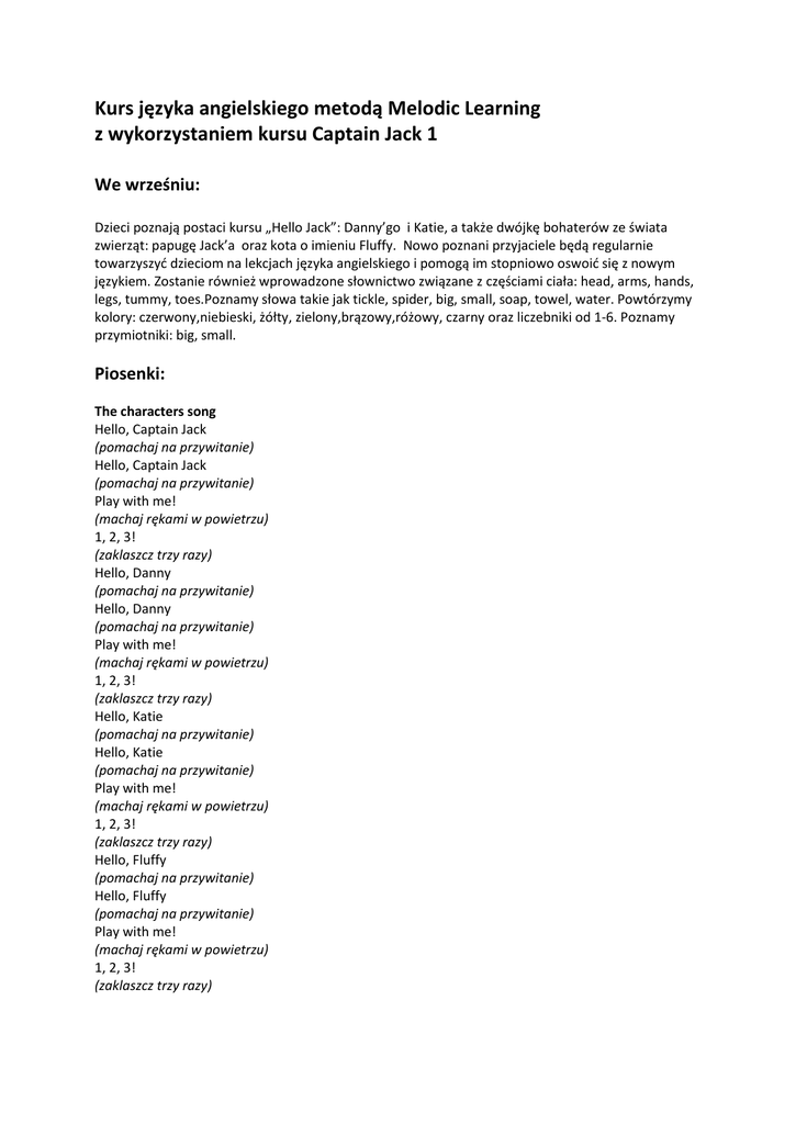 Kurs języka angielskiego metodą Melodic Learning z wykorzystaniem kursu Captain Jack 1 We wrześniu: Dzieci poznają postaci kursu „Hello Jack”: Danny’go i Katie, a także dwójkę bohaterów ze świata zwierząt: papugę Jack’a oraz kota o imieniu Fluffy. Nowo poznani przyjaciele będą regularnie towarzyszyć dzieciom na lekcjach języka angielskiego i pomogą im stopniowo oswoić się z nowym językiem. Zostanie również wprowadzone słownictwo związane z częściami ciała: head, arms, hands, legs, tummy, toes.Poznamy słowa takie jak tickle, spider, big, small, soap, towel, water. Powtórzymy kolory: czerwony,niebieski, żółty, zielony,brązowy,różowy, czarny oraz liczebniki od 1-6. Poznamy przymiotniki: big, small. Piosenki: The characters song Hello, Captain Jack (pomachaj na przywitanie) Hello, Captain Jack (pomachaj na przywitanie) Play with me! (machaj rękami w powietrzu) 1, 2, 3! (zaklaszcz trzy razy) Hello, Danny (pomachaj na przywitanie) Hello, Danny (pomachaj na przywitanie) Play with me! (machaj rękami w powietrzu) 1, 2, 3! (zaklaszcz trzy razy) Hello, Katie (pomachaj na przywitanie) Hello, Katie (pomachaj na przywitanie) Play with me! (machaj rękami w powietrzu) 1, 2, 3! (zaklaszcz trzy razy) Hello, Fluffy (pomachaj na przywitanie) Hello, Fluffy (pomachaj na przywitanie) Play with me! (machaj rękami w powietrzu) 1, 2, 3! (zaklaszcz trzy razy) The colours song Red and yellow (podnieś czerwony i żółty przedmiot) Red and yellow (pomachaj czerwonym i żółtym przedmiotem) Pirate hats (załóż piracką czapkę) Pirate hats! (kiwaj głową) Green and blue (podnieś zielony i niebieski przedmiot) Green and blue (pomachaj zielonym i niebieskim przedmiotem) Pirate hats (kiwaj głową) Pirate hats! (kiwaj głową) Pink and brown (podnieś różowy i brązowy przedmiot) Pink and brown (pomachaj różowym i brązowym przedmiotem) Pirate hats (kiwaj głową) Domowa zabawa z językiem angielskim • Piosenkę „The characters song”, która zawiera frazę: „Pobaw się ze mną! ”, można potraktować jako wstęp do różnych zabaw z rodzicem, nie tylko związanych z nauką języka angielskiego. • Do śpiewania piosenki „The colours song” warto przygotować pirackie czapki z papieru oraz karteczki lub przedmioty w kolorach pojawiających się w piosence. Wszystkie rekwizyty można położyć na podłodze i podnosić je w trakcie śpiewania. Rodzic może zachęcić dziecko, żeby stosowało zwrot „Hello!”, witając się z najbliższymi członkami rodziny. Wskazane jest, aby odpowiadać dziecku w taki sam sposób. Może ono również witać się zwrotem „Hello!” ze swoimi zabawkami. Znajdź kolory Zabawa polega na odnajdywaniu w najbliższym otoczeniu różnych kolorów. Rodzic mówi: Point to red / yellow / green / blue / pink / brown. Zadaniem dziecka jest wskazanie wybranego koloru. Piosenki: The body song Look at my arms! (dotknij swoich rąk) Look at my toes! (dotknij swoich palców u nóg) Look at my tummy! (dotknij swojego brzuszka) Look at my legs! (dotknij swoich nóg) Look at my hands! (dotknij swoich dłoni) Look at my head! (dotknij swojej głowy) Arms! Toes! Tummy! (dotknij swoich rąk, palców u stóp i swojego brzuszka) Legs! Hands! Head! (dotknij swoich nóg, dłoni i swojej głowy) The numbers song 1, 2, 3 pirates (pokaż po kolei jeden, dwa i trzy palce) 4, 5, 6 pirates (pokaż po kolei cztery, pięć i sześć palców) How many? How many? (pokaż wszystkie palce) How many pirates? (pokaż wszystkie palce) 1, 2, 3! (pokaż po kolei jeden, dwa i trzy palce) 4, 5, 6! (pokaż po kolei cztery, pięć i sześć palców) Big and small Small, small spider (pokaż dłonią pająka i pomachaj palcami) Tickle my hand (połaskocz drugą rękę) Small, small spider (pokaż dłonią pająka i pomachaj palcami) Tickle my leg (połaskocz swoją nogę) Small, small spider (pokaż dłonią pająka i pomachaj palcami) Tickle my head! (połaskocz swoją głowę) Big, big spider (pokaż obiema dłońmi pająka i pomachaj palcami) Tickle my hand (połaskocz swoją dłoń) Big, big spider (pokaż obiema dłońmi pająka i pomachaj palcami) Tickle my leg (połaskocz swoją nogę) Big, big spider (pokaż obiema dłońmi pająka i pomachaj palcami) Tickle my head! (połaskocz swoją głowę) Domowa zabawa z językiem angielskim Na początku piosenki można śpiewać w tempie zgodnym z nagraniem na płycie. Stopniowo natomiast warto zachęcać dziecko do zwiększania tempa i coraz szybszego wykonywania gestów. Rodzic może zaproponować dziecku zabawę w łaskotki. Należy podawać dziecku następujące polecenia: Tickle my tummy / head / legs / toes / hands / arms. Duże i małe Aby przygotować dziecko do zabawy, rodzic najpierw wskazuje różne części swojego ciała i mówi za każdym razem: big tummy / big head / big legs / big toes / big hands / big arms. Następnie wskazuje różne części ciała dziecka i mówi: small tummy / small head / small legs / small toes / small hands / small arms. Teraz można już rozpocząć zabawę. Rodzic nie wskazuje żadnej części ciała, tylko mówi na przykład: small head, a dziecko powinno wskazać swoją głowę. Kiedy rodzic powie: big toes, dziecko dotyka palców u nogi rodzica.
