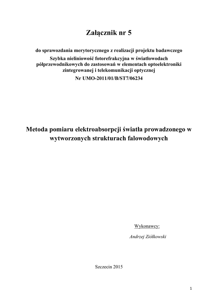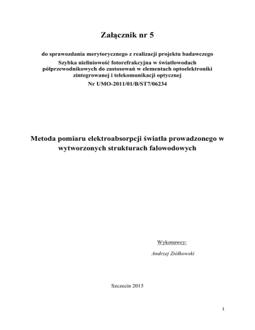 Załącznik nr 5 do sprawozdania merytorycznego z realizacji projektu badawczego Szybka nieliniowość fotorefrakcyjna w światłowodach półprzewodnikowych do zastosowań w elementach optoelektroniki zintegrowanej i telekomunikacji optycznej Nr UMO-2011/01/B/ST7/06234 Metoda pomiaru elektroabsorpcji światła prowadzonego w wytworzonych strukturach falowodowych Wykonawcy: Andrzej Ziółkowski Szczecin 2015 1 1. Układ pomiarowy służący do oceny absorpcji i elektroabsorpcji Pomiary sygnału świetlnego wprowadzonego do struktur wytworzonych falowodów przeprowadzone zostały w układzie, którego szczegóły przedstawiono w Załączniku nr 4 do sprawozdania merytorycznego. Przedstawiony został on również niżej (Rys. 1) przez wzgląd na klarowność niniejszego dokumentu. Rys. 1. Schemat układu pomiarowego. Użyto następujących oznaczeń: PF – półfalówka, P – polaryzator, KP – kostka światłodzieląca, polaryzująca, PD – płytka światłodzieląca, S – soczewka sferyczna, Sc - soczewka cylindryczna, OM – obiektyw mikroskopowy, T - Tłumik (pochłaniacz optyczny), BE – beam expander (poszerzacz wiązki), D – diafragma, CCD – kamera CCD (BeamProfiler). 2. Element pomiarowy W kontekście pomiarowym, kluczowym elementem przedstawionego wyżej układu badawczego jest element detekcyjny. Jak wynika z przedstawionego schematu zdecydowano się wykorzystać kamerę CCD z odpowiednim oprogramowaniem (BreamProfiler). Może ona zarówno ułatwić procedurę wprowadzania światła do struktury jak również może służyć do jakościowej oceny wprowadzonego do falowodu sygnału świetlnego. W trakcie prac przetestowano kilka urządzeń tego typu. Niżej przedstawiono podstawowe informacje na ich temat oraz ich zalety i wady w kontekście przeprowadzonych pomiarów. Pierwszym testowanym urządzeniem przy pomocy, którego zarejestrowano światło prowadzone w falowodzie był Micro-BeamProfiler wyprodukowany przez firmę Duma Optoelectronics, wyposażony w obiektywy mikroskopowe firmy Melles Griot. Urządzenie to wyposażone jest w matryce CCD zawierającą około 800 000 pikseli, czułą w typowym dla matryc tego typu, zakresie spektralnym 350 – 1000 nm. Urządzenie współpracuje z obiektywami mikroskopowymi, dzięki czemu możliwe jest efektywne powiększenie skanowanego obrazu. Powiększenie w tym przypadku realizowane jest za pomocą zarówno technik optycznych jak i elektronicznych. Dzięki 2 wykorzystaniu tego urządzenia zeskanowano powierzchnię wyjściową falowodu prowadzącego światło a typowe obrazy jakie można w tym przypadku otrzymać zamieszczone zostały w Załączniku nr 4 do sprawozdania merytorycznego. Mimo swoich zalet związanych głównie z wbudowanym układem optyki rozwiązanie to posiada również wadę istotną w kontekście prowadzonych eksperymentów - nie umożliwia pomiaru mocy skanowanego sygnału. Wykorzystanie Micro BeamProfilera było jednak istotne (szczególnie na początkowym etapie eksperymentu) aby przy jego pomocy ocenić poprawność przeprowadzanej procedury wprowadzania światła oraz dokonać pomiaru wiązki formowanej w układzie i na wyjściu falowodu. Rysunek 2 przedstawia opisane urządzenie. Rys. 2. Micro BeamProfilera firmy Duma Optoelectronics wraz z mikroskopowym obiektywem skanującym firmy Melles Griot. Urządzenie pozwala skanować wiązkę laserową o rozmiarach od 0.5 mikrona. Drugim testowanym urządzeniem był BeamProfiler firmy Newport (LBP - 4). Jest to urządzenie, którego konstrukcja również zawiera element CCD. Nie jest to jednak element wyposażony w sprzężony z nim układ optyczny przez co umożliwia pomiar wiązek laserowych o średnicach kilkudziesięciu mikronów. Aby można było zaadoptować tego typu rozwiązanie do skanowania powierzchni wyjściowej falowodu należało rozbudować stanowisko, łącząc wspomnianą kamerę z układem optycznym. Zbudowano układ mechaniczny, umożliwiający dokładne pozycjonowanie zarówno obiektywu skanującego próbkę jak i pozycjonowanie kamery względem obiektywu. Tak rozbudowany układ detekcyjny posiada podobne cechy do wcześniej wykorzystanego micro-beamprofilera. Wykorzystane urządzenie wyposażone jest w możliwość pomiaru mocy optycznej promieniowania padającego na matrycę. W trakcie prac okazało się jednak, że w posiadanym egzemplarzu nie jest ona aktywna. Mimo kontaktu z producentem i sprzedawcą problem ten nie został rozwiązany. Rysunek 3 przedstawia Beam Profiler LBP-4. 3 Rys. 3. BeamProfiler firmy Newport (LBP - 4) wykorzystany we wstępnych pracach nad stanowiskiem laboratoryjnym. Urządzenie nie posiada układu współpracującej z nim optyki bez której jest przeznaczone do pomiarów wiązek o wymiarach około kilkudziesięciu mikronów. Przy pomocy tego typu urządzenia możliwe jest zeskanowanie rozkładów natężenia światła wychodzącego z falowodu nie jest możliwy jednak pomiar jego mocy. Na Rys. 4 przedstawiono przykładowy pomiar wykonany za pomocą Beam Profilera LBP-4. Obrazuje on wpływ zewnętrznego napięcia przyłożonego do struktury falowodu na rozkład poprzeczny modu falowodowego. Badania wykonano dla kilku długości fal promieniowania świetlnego załączając napięcie o wartości 1400 V. Rys. 4. Przykładowy pomiar wykonany przy pomocy urządzenia LBP-4, przedstawia on wpływ zewnętrznego pola elektrycznego na rozkład modu prowadzonego w falowodzie. Widać zależność rozkładu modu zarówno od długości fali jak i napięcia. 4 Trzecim testowanym urządzeniem był Beam Profiler firmy Thorlabs (model BP104IR). W odróżnieniu od wcześniejszych urządzeń, nie jest to kamera CCD. Model BP104-IR jest Beam Profilerem wyposażonym w szczelinę skanującą i fotodiodę InGaAs czułą w zakresie od 700 do 1800 nm. Urządzenie posiada możliwość pomiaru mocy promieniowania padającego na jego element fotoczuły. W trakcie testów szybko zorientowano się, że mimo swoich zalet nie może ono zostać wy