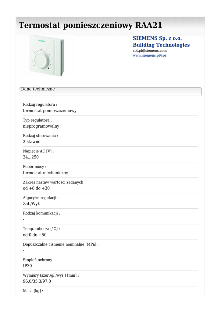 Termostat pomieszczeniowy RAA21 SIEMENS Sp. z o.o. Building Technologies [email protected] www.siemens.pl/cps Dane techniczne Rodzaj regulatora : termostat pomieszczeniowy Typ regulatora : nieprogramowalny Rodzaj sterowania : 2-stawne Napięcie AC [V] : 24...250 Pobór mocy : termostat mechaniczny Zakres nastaw wartości zadanych : od +8 do +30 Algorytm regulacji : Zał./Wył. Rodzaj komunikacji : Temp. robocza [°C] : od 0 do +50 Dopuszczalne ciśnienie nominalne [MPa] : Stopień ochrony : IP30 Wymiary (szer./gł./wys.) [mm] : 96,0/35,3/97,0 Masa [kg] : 0,140 Materiał : obudowa z tworzywa sztucznego, w kolorze białym RAL 9003 Gwarancja : 12 miesięcy Opis : Termostat pomieszczeniowy do instalacji ogrzewania lub chłodzenia. Stosowany do sterowania zaworami strefowymi i termicznymi, pompami cyrkulacyjnymi, wentylatorami, palnikami nadmuchowymi gazowymi lub olejowymi.