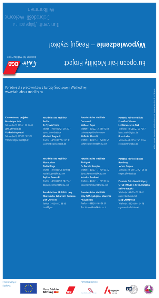 Bun venit Добре дошли Dobrodošli Welcome Willkommen Wypowiedzenie – Reaguj szybko! European Fair Mobility Project Kierownictwo projektu Poradnia Faire Mobilität Poradnia Faire Mobilität Poradnia Faire Mobilität Dominique John Berlin Dortmund Frankfurt/Menem Telefon (+49) 030 /21 24 05 40 Dr. Sylwia Timm Szabolcs Sepsi Letitia Matarea-Türk [email protected] Telefon (+49) 030 /21 01 64 37 Telefon (+49) 0231/54 50 79 82 Telefon (+49) 069/27 29 75 67 Vladimir Bogoeski [email protected] [email protected] [email protected] Telefon (+49) 030/21 23 29 96 Vladimir Bogoeski Stefanie Albrecht Ilona Jocher Telefon (+49) 030/21 23 29 96 Telefon (+49) 0151/12 28 18 57 Telefon (+49) 069/27 29 75 66 [email protected] [email protected] [email protected] Poradnia Faire Mobilität Poradnia Faire Mobilität Poradnia Faire Mobilität Monachium Stuttgart Hamburg Nadia Kluge Dr. Dorota Kempter Jochen Empen Telefon (+49) 089/51 39 90 18 Telefon (+49) 0711/12 09 36 35 Telefon (+49) 0151/22 21 64 38 [email protected] [email protected] [email protected] Bojidar Beremski Katarina Frankovic Telefon (+49) 089/51 24 27 72 Telefon (+49) 0711/12 09 36 36 Poradnia Faire Mobilität przy [email protected] [email protected] CITUB (KNSB) in Sofia, Bułgaria [email protected] Nelly Botevska Finansowany ze środków: Poradnia Faire Mobilität przy Poradnia Faire Mobilität Telefon (+359) 024 01 04 42 FGS Familia, Bukareszt, Rumunia przy ZSSS, Ljubljana, Słowenia [email protected] Dan Cristescu Ana Jakopič Maq Gramovska Telefon (+40) 03 12 38 86 Telefon (+386) 031 68 96 21 Telefon (+359 ) 024 01 04 78 [email protected] [email protected] [email protected] Partnerzy projektu:: V.i.S.d.P.: Annelie Buntenbach, DGB-Bundesvorstand, Henriette-Herz-Platz 2, 10178 Berlin European Fair Mobility Project Poradnie dla pracowników z Europy Środkowej i Wschodniej www.fair-labour-mobility.eu Jeżeli otrzymałeś wypowiedzenie z pracy, musisz reagować szybko. Damy ci wskazówki, jak prawidłowo postępować. Wypowiedzenie – co dalej? Można się bronić przed nieuzasadnionym lub wadliwym wypowiedzeniem – również w przypadku wypowiedzenia dokonanego w formie ustnej. W tym celu należy wnieść powództwo do sądu pracy. Masz na to jednak tylko 3 tygodnie od dnia otrzymania wypowiedzenia! Czy wypowiedzenie było dokonane na piśmie czy wypowiedziano Ci umowę ustnie? Wypowiedzenie dokonane w formie ustnej jest zasadniczo nieskuteczne! W takim przy- Wypowiedzenie dokonane na piśmie powinno odpowiadać określonym wymogom padku pownieneś zgłosić swoja gotowość do świadczenia pracy w obecności świadków! formalnym. Postaraj się o sprawdzenie swojego wypowiedzenia pod względem Uwaga: Jeżeli nie będziesz się bronić przed wypowiedzeniem dokonanym w formie zgodności z prawem i przechowuj kopertę ze stemplem pocztowym! ustnej i nie wniesiesz powództwa, to wypowiedzenie stanie się prawnie skuteczne. Czy jest to wypowiedzenie zwykłe czy ze skutkiem natychmiastowym? Wypowiedzenie ze skutkiem natychmiastowym wymaga zwykle ważnego powodu. 4 tygodnie (Uwaga: są wyjątki!). Terminy wypowiedzenia uregulowane są w umo- Natomiast w przypadku wypowiedzenia zwykłego obowiązują określone terminy wie o pracę lub w układzie zbiorowym pracy! Sprawdź koniecznie swoją umowę wypowiedzenia. W okresie próbnym są to z reguły 2 tygodnie, później przynajmniej o pracę lub obowiązujący układ zbiorowy pracy! Wypowiedzenie w czasie choroby? Wypowiedzenie stosunku pracy podczas przebywania na zwolnieniu lekarskim jest w przeciwnym wypadku możesz stracić prawo do zasiłku chorobowego i swoje w Niemczech dopuszczalne. Jeżeli stosunek pracy ustaje w czasie trwania niezdol- ubezpieczenie na wypadek choroby! ności do pracy, to można wnioskować w kasie chorych o zasiłek chorobowy. Kiedy Kobiety w ciąży obejmuje szczególna ochrona przed wypowiedzeniem. Również już wyzdrowiejesz, zgłoś się do urzędu pracy. Zawsze przesyłaj zwolnienia lekarskie w okresie próbnym! do kasy chorych! Poinformuj swoją kasę o chorobie zanim opuścisz Niemcy, Czy muszę podpisać wypowiedzenie dokonane na piśmie? Nie ma obowiązku złożenia podpisu na piśmie wypowiadającym stosunek pracy Uwaga: Często pracodawcy przedkładają pracownikowi umowę rozwiązującą przez pracodawcę. Decydującym dla rozpoczęcia biegu terminu wypowiedzenia jest stosunek pracy do podpisania (Aufhebungsvertrag). Umowa ta zawiera obustronną samo doręczenie tego pisma. zgodę na rozwiązanie stosunku pracy. Podpisanie tej umowy może oznaczać w praktyce dobrowolne zrzeczenie się określonych roszczeń ze strony pracownika. Podpisz tylko wtedy, gdy zgadzasz się na rozwiązanie stosunku pracy. Upewnij się, że nie stracisz przez to żadnych praw! Co można zrobić w przypadku otrzymania wypowiedzenia? Jeżeli pracujesz dłużej, niż 6 miesięcy w jednym zakładzie, w którym jest zatrudnio- zany na skutek dokonanego wypowiedzenia. Masz również wówczas możliwość nych więcej niż 10 osób na pełny etat, to podlegasz ustawie o szczególnej ochronie negocjowania z pracodawcą na temat odprawy w zamian za wyrażenie zgody na przed skutkami wypowiedzenia. Twój pracodawca potrzebuje wówczas wyjątkowe- rozwiązanie umowy o pracę. go powodu, by Cię zwolnić z pracy. Jeżeli masz wątpliwości, że istnieje taki powód, Jeżeli otrzymałeś wypowiedzenie, zwróć się natychmiast do związków zawodowych, możesz wystąpić do sądu. Sąd zbada wówczas czy stosunek pracy zostanie rozwią- adwokata lub do poradni. Co dalej? Otrzymałeś wypowiedzenie, a chcesz zostać w Niemczech? W takim wypadku zgłoś Ważne: Jeżeli otrzymujesz zasiłek dla bezrobotnych masz nadal ubezpieczenie się natychmiast (w ciągu 3 dni) do urzędu pracy w celu zarejestrowania się jako zdrowotne! osoba bezrobotna. Jeżeli zgłosisz się za późno zasiłek dla bezrobotnych może Ci Zwróć uwagę na to, czy otrzymałeś ostatnie wynagrodzenie po zakończeniu