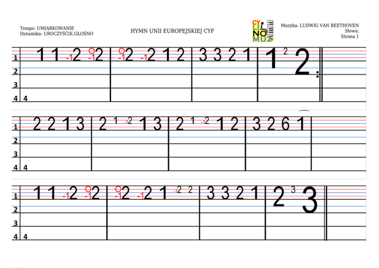 Tempo: UMIARKOWANIE Dynamika: UROCZYŚĆIE,GŁOŚNO HYMN UNII EUROPEJSKIEJ CYF Muzyka: LUDWIG VAN BEETHOVEN Słowa: Strona 1