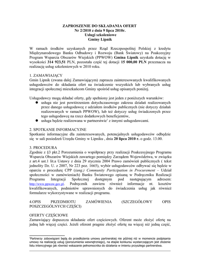 ZAPROSZENIE DO SKŁADANIA OFERT Nr 2/2010 z dnia 9 lipca 2010r. Usługi szkoleniowe Gminy Lipnik W ramach środków uzyskanych przez Rząd Rzeczpospolitej Polskiej z kredytu Międzynarodowego Banku Odbudowy i Rozwoju (Bank Światowy) na Poakcesyjny Program Wsparcia Obszarów Wiejskich (PPWOW) Gmina Lipnik uzyskała dotację w wysokości 314 923,51 PLN, pozostała część tej dotacji 15 000,00 PLN przeznacza na realizację usług szkoleniowych w 2010 roku. 1. ZAMAWIAJĄCY Gmin Lipnik (zwana dalej Zamawiającym) zaprasza zainteresowanych kwalifikowanych usługodawców do składania ofert na świadczenie wszystkich lub wybranych usług integracji społecznej mieszkańcom Gminy spośród usług opisanych poniżej. Usługodawcy mogą składać oferty, gdy spełniony jest jeden z poniższych warunków: usługa nie jest powtórzeniem dotychczasowego zakresu działań realizowanych przez danego usługodawcę z udziałem środków publicznych (nie dotyczy działań realizowanych w ramach PPWOW), lub też dotyczy usług świadczonych przez tego usługodawcę na rzecz dodatkowych beneficjentów, usługa będzie realizowana w partnerstwie1 z innymi usługodawcami. 2. SPOTKANIE INFORMACYJNE Spotkanie informacyjne dla zainteresowanych, potencjalnych usługodawców odbędzie się w sali posiedzeń Urzędu Gminy w Lipniku , dnia 20 lipca 2010 r. o godz. 13.00. 3. PROCEDURA Zgodnie z §3 pkt.2 Porozumienia o współpracy przy realizacji Poakcesyjnego Programu Wsparcia Obszarów Wiejskich zawartego pomiędzy Zarządem Województwa, w związku z art.4 ust.1 lit.a Ustawy z dnia 29 stycznia 2004 Prawo zamówień publicznych ( tekst jednolity Dz. U. z 2007, Nr 223 poz. 1665), wybór usługodawców odbywać się będzie w oparciu o procedurę CPP ((ang.) Community Participation in Procurement – Udział społeczności w zamówieniach) Banku Światowego opisaną w Podręczniku Realizacji Programu Integracji Społecznej dostępnym pod następującym adresem: http://www.ppwow.gov.pl. Podręcznik zawiera również informacje nt. kosztów kwalifikowanych, podmiotów uprawnionych do świadczenia usług jak również formularze wykorzystywane w realizacji programu. 4.OPIS PRZEDMIOTU POSZCZEGÓLNYCH CZĘŚCI) ZAMÓWIENIA (SZCZEGÓŁOWY OPIS OFERTY CZĘŚCIOWE Zamawiający dopuszcza składanie ofert częściowych. Oferent może złożyć ofertę na jedną lub więcej części. Jeżeli oferent pragnie złożyć ofertę na więcej niż jedną część, 1 Partnerzy zobowiązani będą do przedłożenia umowy partnerskiej nie później niż w momencie podpisania umowy na realizację usług (porozumienia wewnętrznego), na etapie konkursu wystarczającym jest złożenie listu intencyjnego jak również wskazanie pełnomocnika do działania w imieniu przyszłego partnerstwa. jest zobowiązany do złożenia odrębnych ofert techniczno – finansowych na każdą część. Wybór jest dokonywany odrębnie w stosunku do każdej części. WARIANTY Zamawiający nie dopuszcza składania ofert wariantowych Opis zamawianych usług – wynikający z zapisów zatwierdzonego Planu Działania 1)Część I Usługi szkoleniowe Działanie 6. Wsparcie szkoleniowe Warsztaty, szkolenia, wyjazd studyjny lub wyjazdy szkoleniowe dla grupy m. in. dla liderów społeczności lokalnej, przedstawicieli organizacji pozarządowych, grup nieformalnych, kadr gminy. Pozyskanie środków zewnętrznych jest dla samorządu terytorialnego istotnym elementem wsparcia finansowego w realizacji określonych działań społecznych. Szkolenia i warsztaty w kierunku nabycia umiejętności pisania projektów i wniosków . Dodatkowe wsparcie szkoleniowe dla istniejących już stowarzyszeń i innych usługodawców z terenu gminy stwarza szanse zachowania trwałości działań już realizowanych w obszarze usług społecznych. Gmina w sposób dwukierunkowy zamierza wykorzystać wsparcie w zakresie szkoleń. Działania planowane do realizacji: 1.1. podnoszenie wiedzy i umiejętności dla aktywnych społecznie działaczy - liderów organizacji, sołtysów, pedagogów, oraz pracowników samorządowych w zakresie realizacji przedsięwzięć społecznych, 1.2. zdobycie praktycznych umiejętności w pisaniu projektów i wniosków o dotacje na działania społeczne (Zamawiający w trakcie realizacji usługi wskaże konkretne programy i konkursy w ramach, których odbędzie się wsparcie szkoleniowe), 1.3 przeprowadzenie cyklu szkoleń (w formie warsztatów), których rezultatem będzie opracowanie min. 4 wniosków aplikacyjnych z tym że, Zamawiający w trakcje realizacji usługi wskaże konkretne programy i konkursy w ramach, których odbędzie się wsparcie szkoleniowe, 1.4 zorganizowanie wyjazdu studyjnego w celu zapoznania się z realizacją działań ogólnospołecznych w innych gminach realizujących program, bądź korzystających ze środków będących przedmiotem w/w szkoleń i warsztatów (Zamawiający wskaże i zorganizuje grupę liderów zainteresowanych uczestnictwem w wyjazdach) Termin wykonania zamówienia: od 09.08.2010 do 30.09.2010r. Na realizacje tej usługi przeznacza się maksymalnie kwotę: 15000,00 zł W ramach usług szkoleniowych w/w działania powinny obejmować lokalnych liderów w liczbie minimum 15 osób, które mają wpływ na rozwój społeczny gminy Lipnik. Oczekuje się, że w przypadku realizacji usługi szkoleniowej usługodawca zagwarantuje podstawowe wymagania dotyczące szkolenia z wyjazdem studyjnym i w rezultacie działaniami zmierzającymi do złożenia wniosków w konkretnych programach pomocowych. W szczególności usługodawca powinien zrealizować: I. Cykl szkoleń warsztatowych w zakresie nabycia wiedzy o zewnętrznych środkach pomocowych i umiejętności wykorzystania wiedzy teoretycznej w zastosowaniu do wiedzy praktycznej. Program szkoleń winien obejmować, co najmniej 30 godz. warsztatowych dla każdej grupy włączając w to czas niezbędny dla pomocy grupom związanym z wypracowaniem wniosków aplikacyjnych. Elementem wa