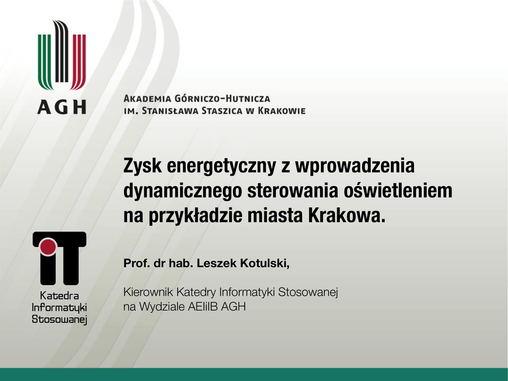 Zysk energetyczny z wprowadzenia dynamicznego sterowania oświetleniem na przykładzie miasta Krakowa. Prof. dr hab. Leszek Kotulski, Kierownik Katedry Informatyki Stosowanej na Wydziale AEIiIB AGH Działania AGH • Stały dialog z producentami oświetlenia: organizacja m.in. warsztatów dotyczących jakości systemów oświetleniowych. • Udział w kilku międzynarodowych projektach. • Efekt: stworzenie autorskiego rozwiązania do precyzyjnego projektowania oświetlenia, a także algorytmów dynamicznego sterowania mogących działać nawet w skali całego miasta. • Udział w pracach zapewniających integrację (np. w ramach konsorcjum TALQ) oraz wymianę danych (rozwiązania techniczne stanowiące podstawę smart city). Jakość Projektu Normy oświetleniowe • Określone przez ISO i odzwierciedlone w PN wymagane parametry oświetlenia. • Oparte o szereg kryteriów: klasa drogi, natężenie ruchu, bliskość budynków, obecność zaparkowanych pojazdów… • W istniejących instalacjach normy często nie są spełnione. • Ryzyko: odpowiedzialność prawna w przypadku kolizji, potrąceń, itd. Projektowanie - problemy Miliony kombinacji by obliczyć poprawne rozwiązanie 10 × odległość 10 × położenie lampy 10 wysokość słupa × 10 × kąt nachylenia 10 × typ lampy 10 variants sposób rozsyłu Człowiek kierując się intuicją zgaduje poprawne rozwiązanie i weryfikuje jego zgodność z normą EPN Długi czas realizacji projektu Projekt dla 5000 lamp to powstaje przez kilka tygodni Propozycja AGH • zbudowaliśmy model formalny danych po inwentaryzacji • zaimplementowaliśmy (wspólnie ze startupem GRADIS) wieloelementowy system sztucznej inteligencji wspomagający projektowanie Zysk efektywniejszy projekt oraz skrócenie czasu projektowania. Projekt ISE - zamiana oświetlenia sodowego na LED Dofinansowanie NFOŚIGW Realizacja: Gmina Miejska KRAKÓW (ZIKIT) Akademia Górniczo Hutnicza 3768 lamp LED i dynamiczne sterowanie 71,04% oszczędności energii Jak to osiągnąć? •prawidłowo przygotowana dokumentacja przetargowa •efektywny i zweryfikowany projekt •dynamiczne sterowanie Jakość urządzeń - diagnoza Rynek „zalewany” jest przez sprzęt niskiej jakości, oferowany przez nieznanych producentów. Rozwiązanie: • W tym przypadku mamy do czynienia z nie •spełnieniem Wzorcowa dokumentacja opracowana w projekcie na norm: bazie doświadczeń ZIKiT Kraków • • elektrycznych – wpływ na działanie sieci, Ogólnodostępna na stronie projektu • • fotometrycznych – zapewnienie oświetlenia i brak oślepień, www.oswietlenie.kraków.pl • trwałości – szybszy niż zakładany spadek strumienia świetlnego, usterki wykraczające poza wskazane parametry. Jakość projektu • Dobry projekt zapewnia spełnienie norm przy optymalizacji zużycia energii. • Projekty zazwyczaj wykonywane są przy założeniu pewnych uproszczeń, a projektant nie zawsze wybiera najlepszy z kilku tysięcy możliwych wariantów. Jakość projektu - rozwiązanie • projekt oddawany w postaci elektronicznej (w ustalonym formacie) • AGH udostępnia bazujący na rozwiązaniach sztucznej inteligencji weryfikator • weryfikacja formalna • weryfikacja jakościowa projektu Zaprojektuj i wybuduj czy Zweryfikuj co zaprojektowano • jasno określone co dostajesz • możliwość uwzględnienia jakości projektu w kryterium oceny przetargu • ograniczenie premii od ryzyka po stronie wykonawcy 30% Unikalne rozwiązanie Dynamiczne sterowanie oświetleniem zastosowane w celu podniesienia komfortu i bezpieczeństwa przy maksymalizacji oszczędności zużycia energii. Godziny „dzienne” (światło słoneczne) Wymagania odnośnie projektu Me1 Me2 Me3a Me3b Me3c Me4a • Aby zapewnić spełnienie norm przy każdej założonej klasie oświetleniowej (np. ME2, ME3b, ME4b), konieczne jest stworzenie planu wielowawariantowego. • Uwzględnienie światła naturalnego (zmierzch, świt) wymaga przeprowadzenia dodatkowych obliczeń. • Bez automatycznego projektowania przez system komputerowy przygotowanie takiego rozwiązania zajmie kilka miesięcy. Ambient lighting Musi być opracowane setki projektów Podsumowanie • Precyzyjny projekt wielowariantowy, przygotowany w oparciu o system sztucznej inteligencji generujący optymalne projekty, pozwala na zapewnienie komfortu przy redukcji zużycia energii. • Dynamiczne sterowanie daje możliwość uzyskania dodatkowych oszczędności. • Integracja danych sensorycznych stanowi przyczółek do stworzenia tzw. smart city. Projekt ISE podsumowanie ● 3768 lamp (Kraków, Polska) ● zamiana lamp Sodowych na LED zamiana&lamp&Sodowych&na&LED& 29% 40% Phoca&Design& Phoca&Control& 15% 16% Ostateczna&konsumpcja&energii& 1463,12 MWh rocznych oszczędności (ca. 1246 120 kg CO2 w Polsce Ponad 775 500 złotych oszczędności rocznie