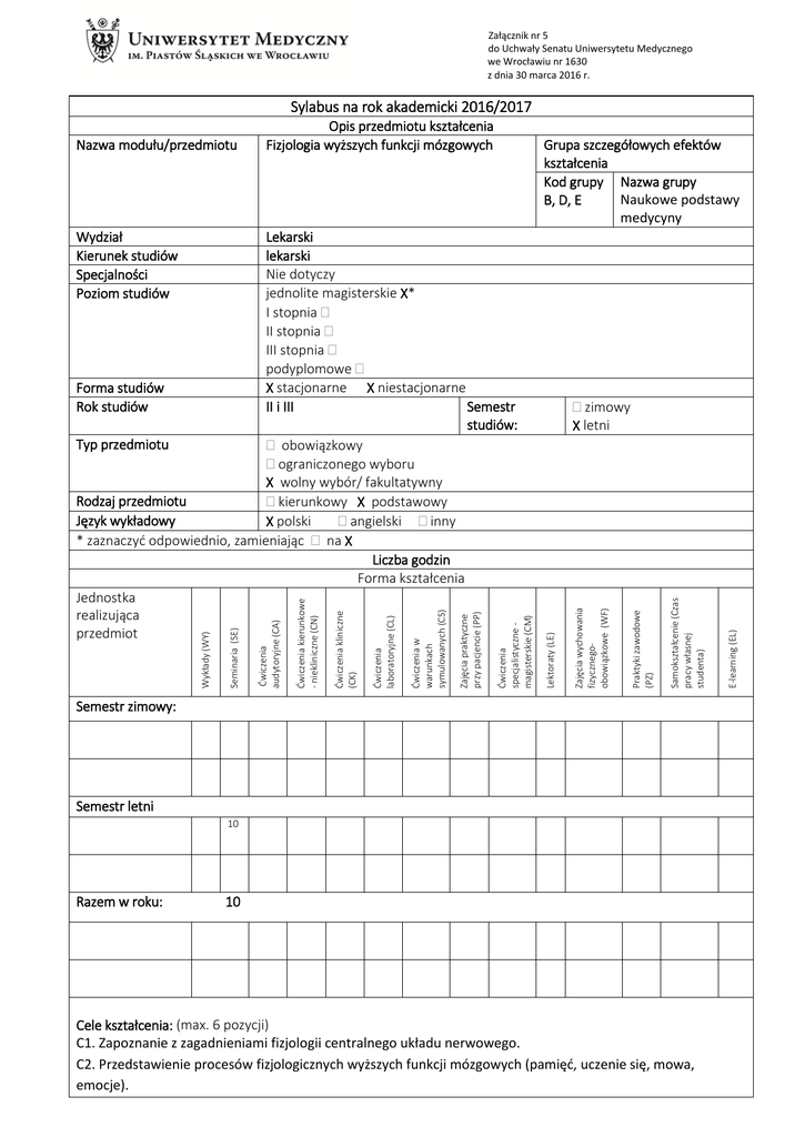 Załącznik nr 5 do Uchwały Senatu Uniwersytetu Medycznego we Wrocławiu nr 1630 z dnia 30 marca 2016 r. Sylabus na rok akademicki 2016/2017 Nazwa modułu/przedmiotu Opis przedmiotu kształcenia Fizjologia wyższych funkcji mózgowych Grupa szczegółowych efektów kształcenia Kod grupy Nazwa grupy B, D, E Naukowe podstawy medycyny Semestr zimowy: Semestr letni 10 Razem w roku: 10 Cele kształcenia: (max. 6 pozycji) C1. Zapoznanie z zagadnieniami fizjologii centralnego układu nerwowego. C2. Przedstawienie procesów fizjologicznych wyższych funkcji mózgowych (pamięć, uczenie się, mowa, emocje). E-learning (EL) Samokształcenie (Czas pracy własnej studenta) Praktyki zawodowe (PZ) Zajęcia wychowania fizycznegoobowiązkowe (WF) zimowy X letni Lektoraty (LE) Ćwiczenia specjalistyczne magisterskie (CM) Zajęcia praktyczne przy pacjencie (PP) Ćwiczenia w warunkach symulowanych (CS) Ćwiczenia laboratoryjne (CL) Ćwiczenia kliniczne (CK) Ćwiczenia kierunkowe - niekliniczne (CN) Ćwiczenia audytoryjne (CA) Seminaria (SE) Lekarski lekarski Nie dotyczy jednolite magisterskie X* I stopnia II stopnia III stopnia podyplomowe Forma studiów X stacjonarne X niestacjonarne Rok studiów II i III Semestr studiów: Typ przedmiotu obowiązkowy ograniczonego wyboru X wolny wybór/ fakultatywny Rodzaj przedmiotu kierunkowy X podstawowy Język wykładowy X polski angielski inny * zaznaczyć odpowiednio, zamieniając na X Liczba godzin Forma kształcenia Jednostka realizująca przedmiot Wykłady (WY) Wydział Kierunek studiów Specjalności Poziom studiów Załącznik nr 5 do Uchwały Senatu Uniwersytetu Medycznego we Wrocławiu nr 1630 z dnia 30 marca 2016 r. C3. Wykształcenie umiejętności wnioskowania i interpretacji wiedzy fizjologicznej. C4. Umiejętność wykorzystania literatury naukowej do oceny wyższych funkcji mózgowych. C5. Przedstawienie znaczenia wiedzy fizjologicznej i umiejętność jej zastosowania w praktyce klinicznej. Macierz efektów kształcenia dla modułu/przedmiotu w odniesieniu do metod weryfikacji zamierzonych efektów kształcenia oraz formy realizacji zajęć: Numer efektu kształcenia przedmiotowego Numer efektu kształcenia kierunkowego W.01 B.W24 W.02 B.W28 W.03 B.W34 W.04 D.W17 W.05 E.W14 W.06 E.W17 U.01 B.U3 U.02 B.U12 U.03 B.U15 U.04 D.U17 K.01 D.U11 K.02 D.U15 Student, który zaliczy moduł/przedmiot wie/umie/potrafi Zna podstawy pobudzenia i przewodzenia w układzie nerwowym oraz wyższe czynności nerwowe. Zna mechanizmy starzenia się organizmu. Zna zasady prowadzenia badań naukowych, obserwacyjnych i doświadczalnych. Zna historię początków medycyny, medycynę najdawniejszych cywilizacji i charakterystyczne cechy medycyny średniowiecznej. Zna i rozumie przyczyny, objawy, zasady diagnozowania i postępowania terapeutycznego w najczęstszych chorobach układu nerwowego, w tym: zespołów otępiennych, a w szczególności choroby Alzheimera. Zna objawy, zasady diagnozowania i postępowania terapeutycznego w najczęstszych chorobach psychicznych, w tym: zaburzeń afektywnych i adaptacyjnych. Potrafi wskazać związek między czynnikami zaburzającymi stan równowagi procesów biologicznych a zmianami fizjologicznymi i patofizjologicznymi. Korzysta z baz danych, w tym internetowych, i wyszukuje potrzebną informację za pomocą dostępnych narzędzi. Umie zaplanować i wykonać proste badanie naukowe oraz interpretuje jego wyniki i wyciąga wnioski. Krytycznie analizuje piśmiennictwo medyczne oraz wyciąga wnioski w oparciu o dostępną literaturę. Potrafi komunikować się ze współpracownikami zespołu, udzielając konstruktywnej informacji zwrotnej i wsparcia. Wykazuje odpowiedzialność za Metody weryfikacji osiągnięcia zamierzonych efektów kształcenia (formujące i podsumowujące) Forma zajęć dydaktycznych ** wpisz symbol Debata, odpowiedź ustna, prezentacja. SE Debata. SE Raport, debata. SE Prezentacja, debata. SE Prezentacja, debata. SE Prezentacja, debata SE Debata, odpowiedź ustna, prezentacja. SE Raport, debata SE Raport, debata SE Debata SE Raport, debata SE Debata SE Załącznik nr 5 do Uchwały Senatu Uniwersytetu Medycznego we Wrocławiu nr 1630 z dnia 30 marca 2016 r. K.03 D.U19 podnoszenie swoich kwalifikacji i przekazywanie wiedzy innym. Potrafi uczyć innych. Debata SE ** WY - wykład; SE - seminarium; CA - ćwiczenia audytoryjne; CN - ćwiczenia kierunkowe (niekliniczne); CK - ćwiczenia kliniczne; CL ćwiczenia laboratoryjne; CM – ćwiczenia specjalistyczne (mgr); CS - ćwiczenia w warunkach symulowanych; LE - lektoraty; zajęcia praktyczne przy pacjencie - PP; WF - zajęcia wychowania fizycznego (obowiązkowe); PZ- praktyki zawodowe; SK – samokształcenie, EL- Elearning. Proszę ocenić w skali 1-5 jak powyższe efekty lokują państwa zajęcia w działach: przekaz wiedzy, umiejętności czy kształtowanie postaw: Wiedza: 4 Umiejętności: 4 Kompetencje społeczne: 4 Nakład pracy studenta (bilans punktów ECTS): Forma nakładu pracy studenta Obciążenie studenta (h) (udział w zajęciach, aktywność, przygotowanie itp.) 1. Godziny kontaktowe: 10 2. Czas pracy własnej studenta (samokształcenie): 3 Sumaryczne obciążenie pracy studenta 13 Punkty ECTS za moduł/przedmiotu 0,5 Uwagi Treść zajęć: (proszę wpisać hasłowo tematykę poszczególnych zajęć z podziałem na formę zajęć dydaktycznych, pamiętając, aby przekładała się ona na zamierzone efekty kształcenia) Seminaria 1. Rodzaje i etapy pamięci. Pamięć krótkotrwała i sposoby jej badania (efekt pierwszeństwa, efekt świeżości i dystraktory). Pamięć operacyjna i jej rola w życiu codziennym przy wykonywaniu bieżących zadań. Rodzaje pamięci długotrwałej: pamięć deklaratywna i proceduralna; różnica między pamięcią emocjonalną a pamięcią o zdarzeniu emocjonalnym. Pamięć permanentna. Rolą hipokampa w konsolidacji pamięci. Mózgowe mechanizmy mowy. Drugi układ sygnalizacyjny, czuciowe i ruchowe ośrodki mowy. Język, jako narz