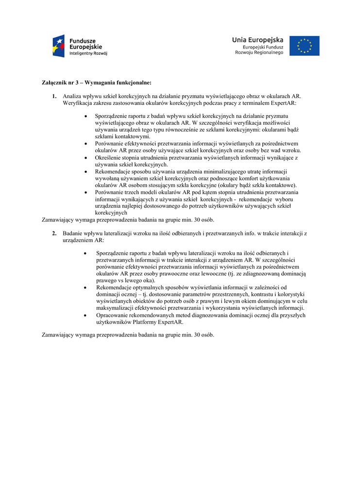 Załącznik nr 3 – Wymagania funkcjonalne: 1. Analiza wpływu szkieł korekcyjnych na działanie pryzmatu wyświetlającego obraz w okularach AR. Weryfikacja zakresu zastosowania okularów korekcyjnych podczas pracy z terminalem ExpertAR: Sporządzenie raportu z badań wpływu szkieł korekcyjnych na działanie pryzmatu wyświetlającego obraz w okularach AR. W szczególności weryfikacja możliwości używania urządzeń tego typu równocześnie ze szkłami korekcyjnymi: okularami bądź szkłami kontaktowymi. Porównanie efektywności przetwarzania informacji wyświetlanych za pośrednictwem okularów AR przez osoby używające szkieł korekcyjnych oraz osoby bez wad wzroku. Określenie stopnia utrudnienia przetwarzania wyświetlanych informacji wynikające z używania szkieł korekcyjnych. Rekomendacje sposobu używania urządzenia minimalizującego utratę informacji wywołaną używaniem szkieł korekcyjnych oraz podnoszące komfort użytkowania okularów AR osobom stosującym szkła korekcyjne (okulary bądź szkła kontaktowe). Porównanie trzech modeli okularów AR pod kątem stopnia utrudnienia przetwarzania informacji wynikających z używania szkieł korekcyjnych - rekomendacje wyboru urządzenia najlepiej dostosowanego do potrzeb użytkowników używających szkieł korekcyjnych Zamawiający wymaga przeprowadzenia badania na grupie min. 30 osób. 2. Badanie wpływu lateralizacji wzroku na ilość odbieranych i przetwarzanych info. w trakcie interakcji z urządzeniem AR: Sporządzenie raportu z badań wpływu lateralizacji wzroku na ilość odbieranych i przetwarzanych informacji w trakcie interakcji z urządzeniem AR. W szczególności porównanie efektywności przetwarzania informacji wyświetlanych za pośrednictwem okularów AR przez osoby prawooczne oraz lewooczne (tj. ze zdiagnozowaną dominacją prawego vs lewego oka). Rekomendacje optymalnych sposobów wyświetlania informacji w zależności od dominacji ocznej – tj. dostosowanie parametrów przestrzennych, kontrastu i kolorystyki wyświetlanych obiektów do potrzeb osób z prawym i lewym okiem dominującym w celu maksymalizacji efektywności przetwarzania i wykorzystania wyświetlanych informacji. Opracowanie rekomendowanych metod diagnozowania dominacji ocznej dla przyszłych użytkowników Platformy ExpertAR. Zamawiający wymaga przeprowadzenia badania na grupie min. 30 osób.