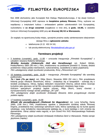 FILMOTEKA EUROPEJSKA Rok 2008 obchodzimy jako Europejski Rok Dialogu Międzykulturowego. Z tej okazji Centrum Informacji Europejskiej UKIE zaprasza na bezpłatne pokazy filmowe. Filmy, wybrane we współpracy z instytutami kultury i ambasadami państw członkowskich Unii Europejskiej, wyświetlamy w co drugi czwartek (wyjątkowo w inne dni), o godz. 16.00, w siedzibie Centrum Informacji Europejskiej UKIE przy ul. Kruczej 38/42 w Warszawie. Ze względu na ograniczoną liczbę miejsc, uprzejmie prosimy osoby zainteresowane obejrzeniem danego filmu o zgłoszenie udziału: • telefonicznie (0 22 455 54 54) • lub pocztą elektroniczną: [email protected] Terminarz projekcji • 3 kwietnia (czwartek), godz. 11.00 – uroczysta inauguracja „Filmoteki Europejskiej” z udziałem reŜysera Roberta Glińskiego. WróŜby kumaka (Unkenrufe. Zeit den Versöhnung); reŜ. Robert Gliński, Polska/Niemcy 2005 (90 min.). Film, zrealizowany na podstawie powieści G. Grassa, dotyka problemów relacji polsko-niemieckich, wykorzenienia, wysiedlenia a takŜe pojednania. Film udostępniony dzięki Ŝyczliwości producenta, firmy „Filmcontract Ltd.” • 10 kwietnia (czwartek), godz. 16.00 – inauguracja „Filmoteki Europejskiej” dla szerokiej publiczności. Tu i tam (Tu pa tam); reŜ. Mitja Okorn; Słowenia 2004 (92 min.). Film przedstawia historię grupy młodych Słoweńców, którzy - znalazłszy się w tarapatach - ocierają się o światek przestępczy. Obraz, będący debiutem reŜyserskim Okorna, zebrał dobre recenzje krytyków jako pierwszy od lat film słoweński o problemach młodzieŜy tego kraju. Gościem specjalnym projekcji będzie reŜyser, Mitja Okorn, znany równieŜ z wyreŜyserowania nowego serialu polskiego „39 i pół”. Film udostępniony dzięki Ŝyczliwości Ambasady Słowenii, która przygotowuje równieŜ polskie napisy. • 17 kwietnia (czwartek), godz. 16.00 Włoski dla początkujących (Italiensk for Begyndere); reŜ. Lone Scherfig; Dania 2000; (108 min.). Film, zrealizowany zgodnie z załoŜeniami duńskiej szkoły filmowej Dogma, przedstawia losy sześciorga samotnych ludzi, którzy spotykają się na kursie języka włoskiego. Losy bohaterów nieoczekiwanie splatają się, a Ŝycie kaŜdego z nich zmienia się diametralnie. Obraz zdobył wiele nagród, w tym Grand Prix XVII Warszawskiego Festiwalu Filmowego. Film udostępniony dzięki Ŝyczliwości Ambasady Królestwa Danii w Warszawie. Polska wersja językowa (napisy). • 29 kwietnia (wtorek), godz. 16.00 We are British but…, Wielka Brytania, pierwsza część zestawu krótkometraŜowych filmów fabularnych i dokumentalnych z lat 1997 – 2002, dotyczących tematu toŜsamości kulturowej w społeczeństwie brytyjskim. Filmy ukazują problemy asymilacji osób pochodzących z dawnych kolonii brytyjskich i barwną - choć niepozbawioną problemów - mozaikę etniczną współczesnej Wielkiej Brytanii. Filmy udostępnione dzięki Ŝyczliwości British Council w Warszawie. Wersja oryginalna (dodatkowo napisy w jęz. angielskim). • 8 maja (czwartek), godz. 16.00 Dzielnica! (Nyócker!); reŜ. Aron Gauder; Węgry 2004 (87 min.). Niekonwencjonalny film animowany dla dorosłych, inspirowany historią miłości Romea i Julii. Ukazuje walkę gangów w dotkniętej biedą, wieloetnicznej dzielnicy Budapesztu. Krytycy, wskazując na podobieństwa z amerykańskim „South Park”, podkreślali jednocześnie, Ŝe film Gaudera zachowuje typowo europejski punkt widzenia. Film w polskiej wersji językowej (napisy). • 20 maja (wtorek), godz. 16.00 We are British but… – druga część brytyjskiego zestawu krótkich filmów fabularnych i dokumentalnych o problemach etnicznych w Zjednoczonym Królestwie. Filmy udostępnione dzięki Ŝyczliwości British Council. Wersja oryginalna (dodatkowo napisy w jęz. angielskim). • 5 czerwca (czwartek), godz. 16.00 Jazda (Jizda); reŜ. Jan Svěrák; Czechy 2004 (85 min.). Finezyjna zabawa z konwencją kina drogi – historia o wolności i smakowaniu Ŝycia, pełna błyskotliwego humoru, ale teŜ niepozbawiona scen powaŜnych i pobudzających do refleksji. Dodatkowym atutem obrazu są malownicze zdjęcia z róŜnych rejonów Czech. Film w polskiej wersji językowej (napisy). • 19 czerwca (czwartek), godz. 16.00 Mondovino; reŜ. Jonathan Nossiter; Francja 2004 (135 min.). Obraz, będący pełnometraŜową wersją głośnego serialu dokumentalnego o produkcji wina, ukazuje rodzinne dramaty i zaciekłą walkę o wpływy w przemyśle winiarskim. Z drugiej strony – stanowi fascynującą, przesyconą dobrym humorem podróŜ po najsłynniejszych winiarniach i polach winorośli na świecie. Film nominowany do Złotej Palmy w Cannes. Film udostępniony dzięki Ŝyczliwości Ambasady Francji. Polska wersja językowa (napisy). Od października 2008 r. zapraszamy na kolejne pokazy filmowe. Więcej informacji na stronie www.cie.gov.pl SERDECZNIE ZAPRASZAMY!
