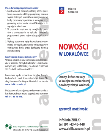 Procedura rozpatrywania wniosków 1. Każdy wniosek zostanie poddany ocenie punktowej, w oparciu o którą sporządzony zostanie wykaz złożonych wniosków uszeregowany wg liczby przyznanych punktów, a następnie przygotowany wykaz osób zakwalifikowanych do wynajęcia mieszkania. 2. W przypadku uzyskania tej samej liczby punktów o umieszczeniu na wykazie i kolejności przyznawania prawa najmu zdecyduje losowanie. 3. Wykazy podawane będą do publicznej wiadomości, a uwagi i zastrzeżenia wnioskodawców opiniowane będą przez Społeczną Komisję Mieszkaniową Kiedy i gdzie składać dokumenty? Wnioski o najem lokalu komunalnego należy składać w siedzibie Zarządu Budynków i Lokali Komunalnych przy ul. Mariackiej 25, od dnia 21 czerwca 2012 r. do 20 października 2012 r. Formularze są do pobrania w siedzibie Zarządu Budynków i Lokali Komunalnych, w Biurze Obsługi Interesantów Urzędu Miasta lub na stronie: www.zbilk.szczecin.pl Dodatkowe informacje w sprawie wynajmu mieszkań komunalnych można uzyskać pod numerem tel. (91) 43 45 448. infolinia: tel. (91) 43-45-448, www.zbilk.szczecin.pl Najem mieszkań komunalnych Osoby, które czekały w dotychczasowej kolejce mieszkaniowej i nadal są zainteresowane wynajęciem lokalu powinny złożyć nowy wniosek w tej sprawie. Przejrzyste i proste zasady najmu pomogą rozwiązać problem wieloletniego oczekiwania na mieszkanie, a także przyczynią się do wskazania lokali osobom najbardziej potrzebującym. Jakie dokumenty należy złożyć? Wniosek o wynajęcie lokalu mieszkalnego wraz z niezbędnymi załącznikami, którymi są: l zaświadczenia o dochodach za okres ostatnich 3 miesięcy wszystkich członków gospodarstw domowego. l zaświadczenie z Urzędu Skarbowego o wysokości dochodu od osób fizycznych za poprzedni rok kalendarzowy wszystkich członków gospodarstwa domowego l zaświadczenie z MOPR lub organizacji pożytku publicznego o udziale w programach pomocowych, w przypadku wychowanków placówek opiekuńczo-wychowawczych – dokument potwierdzający zakończenie procesu usamodzielniania.* l zaświadczenie z MOPR potwierdzające status bezdomności.* l zaświadczenie z MOPR potwierdzające okres wynajmowania lokalu finansowanego ze źródeł pomocy społecznej.* l kopie dowodów osobistych – obu małżonków. l wyrok o rozwodzie lub separacji * l wyrok o alimentach * l orzeczenie o niepełnosprawności wydane przez Powiatowy lub Wojewódzki Zespół ds. Orzekania o Niepełnosprawności lub w przypadku dziecka – decyzja o pobieraniu zasiłku pielęgnacyjnego.* l Inne * – dołączyć jeżeli dany fakt dotyczy wnioskodawcy Celem zmian polityki mieszkaniowej jest: l ustalenie rzeczywistego wykazu osób, które ubiegają się o przyznanie prawa najmu , l punktowa ocena wniosku, w oparciu o sytuację bytową gospodarstwa domowego wnioskodawcy, l losowanie w przypadku uzyskania przez co najmniej dwóch wnioskodawców tej samej liczby punktów, l dodatkowa punktacja dla osób, które złożyły wnioski przed dniem wejścia w życie Uchwały nr XVIII/507/12, a nie zostały one zrealizowane, l wyłonienie wnioskodawców o najtrudniejszej sytuacji bytowej, l ustalenie kolejności rozpatrywania wniosków i zatwierdzenie listy do realizacji w danym roku. UWAGA: wykaz osób zakwalifikowanych do zawarcia umowy najmu podawany będzie do publicznej wiadomości. Kto może ubiegać się o wynajęcie mieszkania? Każdy pełnoletni mieszkaniec Gminy Miasto Szczecin o niezaspokojonych potrzebach mieszkaniowych i niskich dochodach. Najem mieszkań komunalnych Osoby, które czekały w dotychczasowej kolejce mieszkaniowej i nadal są zainteresowane wynajęciem lokalu powinny złożyć nowy wniosek w tej sprawie. Przejrzyste i proste zasady najmu pomogą rozwiązać problem wieloletniego oczekiwania na mieszkanie, a także przyczynią się do wskazania lokali osobom najbardziej potrzebującym. Jakie dokumenty należy złożyć? Wniosek o wynajęcie lokalu mieszkalnego wraz z niezbędnymi załącznikami, którymi są: l zaświadczenia o dochodach za okres ostatnich 3 miesięcy wszystkich członków gospodarstw domowego. l zaświadczenie z Urzędu Skarbowego o wysokości dochodu od osób fizycznych za poprzedni rok kalendarzowy wszystkich członków gospodarstwa domowego l zaświadczenie z MOPR lub organizacji pożytku publicznego o udziale w programach pomocowych, w przypadku wychowanków placówek opiekuńczo-wychowawczych – dokument potwierdzający zakończenie procesu usamodzielniania.* l zaświadczenie z MOPR potwierdzające status bezdomności.* l zaświadczenie z MOPR potwierdzające okres wynajmowania lokalu finansowanego ze źródeł pomocy społecznej.* l kopie dowodów osobistych – obu małżonków. l wyrok o rozwodzie lub separacji * l wyrok o alimentach * l orzeczenie o niepełnosprawności wydane przez Powiatowy lub Wojewódzki Zespół ds. Orzekania o Niepełnosprawności lub w przypadku dziecka – decyzja o pobieraniu zasiłku pielęgnacyjnego.* l Inne * – dołączyć jeżeli dany fakt dotyczy wnioskodawcy Celem zmian polityki mieszkaniowej jest: l ustalenie rzeczywistego wykazu osób, które ubiegają się o przyznanie prawa najmu , l punktowa ocena wniosku, w oparciu o sytuację bytową gospodarstwa domowego wnioskodawcy, l losowanie w przypadku uzyskania przez co najmniej dwóch wnioskodawców tej samej liczby punktów, l dodatkowa punktacja dla osób, które złożyły wnioski przed dniem wejścia w życie Uchwały nr XVIII/507/12, a nie zostały one zrealizowane, l wyłonienie wnioskodawców o najtrudniejszej sytuacji bytowej, l ustalenie kolejności rozpatrywania wniosków i zatwierdzenie listy do realizacji w danym roku. UWAGA: wykaz osób zakwalifikowanych do zawarcia umowy najmu podawany będzie do publicznej wiadomości. Kto może ubiegać się o wynajęcie mieszkania? Każdy pełnoletni mieszkaniec Gminy Miasto Szczecin o niezaspokojonych potrzebach mieszkaniowych i niskich dochodach. Procedura rozpatrywani