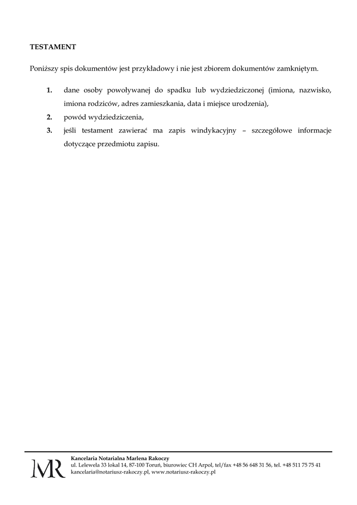 TESTAMENT Poniższy spis dokumentów jest przykładowy i nie jest zbiorem dokumentów zamkniętym. 1. dane osoby powoływanej do spadku lub wydziedziczonej (imiona, nazwisko, imiona rodziców, adres zamieszkania, data i miejsce urodzenia), 2. powód wydziedziczenia, 3. jeśli testament zawierać ma zapis windykacyjny – szczegółowe informacje dotyczące przedmiotu zapisu. Kancelaria Notarialna Marlena Rakoczy ul. Lelewela 33 lokal 14, 87-100 Toruń, biurowiec CH Arpol, tel/fax +48 56 648 31 56, tel. +48 511 75 75 41 [email protected], www.notariusz-rakoczy.pl
