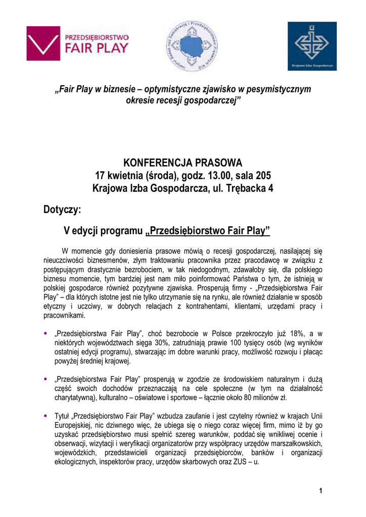 „Fair Play w biznesie – optymistyczne zjawisko w pesymistycznym okresie recesji gospodarczej” KONFERENCJA PRASOWA 17 kwietnia ( roda), godz. 13.00, sala 205 Krajowa Izba Gospodarcza, ul. Tr/backa 4 Dotyczy: V edycji programu „Przedsi/biorstwo Fair Play” W momencie gdy doniesienia prasowe mówi o recesji gospodarczej, nasilaj cej si nieuczciwo ci biznesmenów, z ym traktowaniu pracownika przez pracodawc w zwi zku z post puj cym drastycznie bezrobociem, w tak niedogodnym, zdawa oby si , dla polskiego biznesu momencie, tym bardziej jest nam mi o poinformowa Pa!stwa o tym, "e istniej w polskiej gospodarce równie" pozytywne zjawiska. Prosperuj firmy - „Przedsi biorstwa Fair Play” – dla których istotne jest nie tylko utrzymanie si na rynku, ale równie" dzia anie w sposób etyczny i uczciwy, w dobrych relacjach z kontrahentami, klientami, urz dami pracy i pracownikami. „Przedsi biorstwa Fair Play”, cho bezrobocie w Polsce przekroczy o ju" 18%, a w niektórych województwach si ga 30%, zatrudniaj prawie 100 tysi cy osób (wg wyników ostatniej edycji programu), stwarzaj c im dobre warunki pracy, mo"liwo rozwoju i p ac c powy"ej redniej krajowej. „Przedsi biorstwa Fair Play” prosperuj w zgodzie ze rodowiskiem naturalnym i du" cz swoich dochodów przeznaczaj na cele spo eczne (w tym na dzia alno charytatywn ), kulturalno – o wiatowe i sportowe – cznie oko o 80 milionów z . Tytu „Przedsi biorstwo Fair Play” wzbudza zaufanie i jest czytelny równie" w krajach Unii Europejskiej, nic dziwnego wi c, "e ubiega si o niego coraz wi cej firm, mimo i" by go uzyska przedsi biorstwo musi spe ni szereg warunków, podda si wnikliwej ocenie i obserwacji, wizytacji i weryfikacji organizatorów przy wspó pracy urz dów marsza kowskich, wojewódzkich, przedstawicieli organizacji przedsi biorców, banków i organizacji ekologicznych, inspektorów pracy, urz dów skarbowych oraz ZUS – u. 1 7 grudnia 2001 r. zako!czyli my IV edycj programu „Przedsi biorstwo Fair Play”. Certyfikaty otrzyma y wtedy 463 firmy, a nagrody g ówne w postaci statuetek – 15. Tytu „Przedsi biorstwo Fair Play” jest dla firm wa"ny - od momentu rozpocz cia programu certyfikacji w roku 1998 zainteresowanie nim wzros o dziesi ciokrotnie. Laureatami statuetek „Przedsi biorstwo Fair Play” s m.in.: ASPEL S.A., Zabierzów k/Krakowa (aktywnie w cza si w "ycie spo eczno ci lokalnej, zw aszcza z okolic Zabierzowa) Firma Handlowo-Produkcyjna GIEWONT Sp. z o.o., Rzeszów (finansuje m.in. warsztaty terapii zaj ciowej dla dzieci niepe nosprawnych) JERZY RUTKOWSKI Ltd., Gniewkowo k/Bydgoszczy (zapewnia szeroki pakiet socjalny i opiek zdrowotn pracownikom: szczepienia, badania specjalistyczne, zabiegi rehabilitacyjne) KRONOPOL Sp. z o.o., Aary, lubuskie (dba o rodowisko naturalne - realizuje m.in. program „ograniczanie zanieczyszcze! emitowanych do atmosfery”) NOVOL Sp. z o.o., Komorniki k/Poznania (pomaga osobom umys owo niepe nosprawnym poprzez zatrudnianie ich w ramach oddzia u firmy Novol-manu-service) Przedsi/biorstwo Produkcyjne OKNOPLUS Sp. z o.o., Libertów k/Krakowa (sprawuje mecenat kulturalny, dotuje m.in. Teatr Stu w Krakowie) ZakBady Farmaceutyczne POLFA-CÓDE S.A., CódF (m.in. 2-krotne wyró"nienie tytu em „Pracodawca – Organizator Pracy Bezpiecznej”) Przedsi/biorstwo WodociGgów i Kanalizacji Sp. z o.o. w Kaliszu (zapewnia szczególnie wysoki standard obs ugi mieszka!ców Kalisza: komfortowe, wzorcowo wyposa"one i funkcjonuj ce stanowiska obs ugi klienta) ZakBady Magnezytowe „ROPCZYCE” S.A., podkarpackie (znakomite warunki pracy i p acy stworzone pracownikom - najbardziej po" dany pracodawca w ca ym powiecie) SAUR NEPTUN GDAISK S.A. (wieloletni program pomocy charytatywnej dla Fundacji „Rodzina Nadziei”, zajmuj cej si opiek nad dzie mi w domach dziecka, rodzinach dysfunkcyjnych i patologicznych) SERTOP Sp. z o.o., Tychy (nieustanne d "enie do polepszania jako ci produktów, dostosowanie si do wymogów Unii Europejskiej) Przedsi/biorstwo Produkcyjno-UsBugowe „SEZUP Clima” Sp. z o.o., PiBa (wspó pracuje ze spo eczno ci lokaln na wielu szczeblach) ZakBad Przetwórstwa Mi/snego TARCZYISKI Sp. z o.o., Trzebnica k/WrocBawia (bogaty pakiet socjalny dla pracowników obejmuj cy m.in. program emerytalny w III filarze) UNION-VIS Sp. z o.o., Bielsko-BiaBa (przeci tne wynagrodzenie pracownika operacyjnego jest wy"sze od przeci tnej krajowej o 50%) ZAKCAD CERAMIKI SANITARNEJ StanisBaw Hybner, Kroda Wlkp. (zach canie pracowników do podnoszenia kwalifikacji w szko ach rednich i wy"szych - pokrywanie czesnego) . 31 maja 2002 r. ko!czymy przyjmowanie deklaracji zg oszeniowych do bie" cej, V – jubileuszowej edycji programu „Przedsi biorstwo Fair Play”, który ma na celu promowanie uczciwo ci i kultury przedsi biorczo ci w biznesie. Jest przedsi wzi ciem: - realizowanym w skali ogólnopolskiej - trwaj cym ca y rok, przebiegaj c dwuetapowo - mog bra w nim udzia wszystkie firmy niezale"nie od wielko ci, które maj swoj siedzib w Polsce. Program organizuje Fundacja „Instytut Bada! nad Demokracj i Przedsi biorstwem Prywatnym” KIG pod patronatem Ministerstwa Gospodarki oraz przy poparciu Prezydenta RP, Premiera RP oraz w adz regionalnych. • SzczegóBowe informacje na temat programu oraz firm „Przedsi/biorstwo Fair Play” do uzyskania na konferencji prasowej lub w biurze programu: Anna Szcze niak, tel/fax: (22) 8262596, tel: (22) 6309705, 0-502 249979, e-mail: [email protected], http://www.fairplay.pl. 2