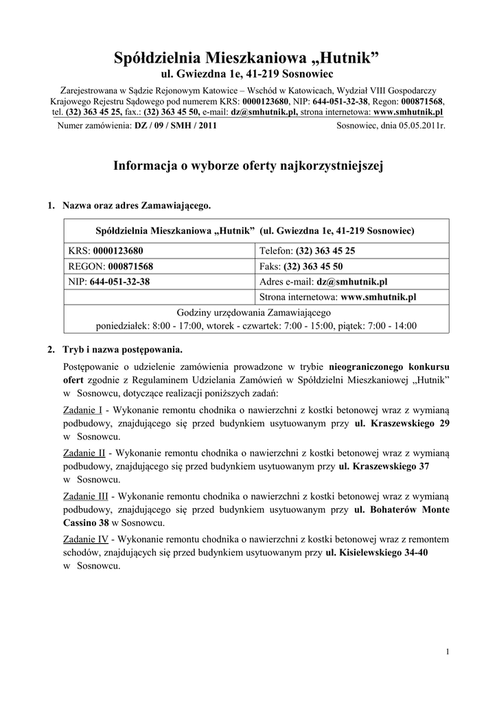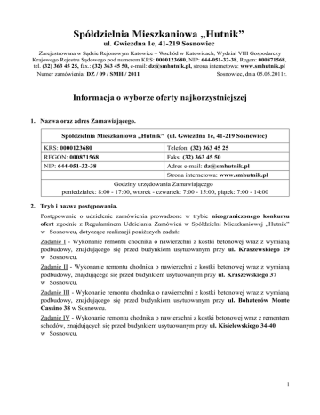 Spółdzielnia Mieszkaniowa „Hutnik” ul. Gwiezdna 1e, 41-219 Sosnowiec Zarejestrowana w Sądzie Rejonowym Katowice – Wschód w Katowicach, Wydział VIII Gospodarczy Krajowego Rejestru Sądowego pod numerem KRS: 0000123680, NIP: 644-051-32-38, Regon: 000871568, tel. (32) 363 45 25, fax.: (32) 363 45 50, e-mail: [email protected], strona internetowa: www.smhutnik.pl Numer zamówienia: DZ / 09 / SMH / 2011 Sosnowiec, dnia 05.05.2011r. Informacja o wyborze oferty najkorzystniejszej 1. Nazwa oraz adres Zamawiającego. Spółdzielnia Mieszkaniowa „Hutnik” (ul. Gwiezdna 1e, 41-219 Sosnowiec) KRS: 0000123680 Telefon: (32) 363 45 25 REGON: 000871568 Faks: (32) 363 45 50 NIP: 644-051-32-38 Adres e-mail: [email protected] Strona internetowa: www.smhutnik.pl Godziny urzędowania Zamawiającego poniedziałek: 8:00 - 17:00, wtorek - czwartek: 7:00 - 15:00, piątek: 7:00 - 14:00 2. Tryb i nazwa postępowania. Postępowanie o udzielenie zamówienia prowadzone w trybie nieograniczonego konkursu ofert zgodnie z Regulaminem Udzielania Zamówień w Spółdzielni Mieszkaniowej „Hutnik” w Sosnowcu, dotyczące realizacji poniższych zadań: Zadanie I - Wykonanie remontu chodnika o nawierzchni z kostki betonowej wraz z wymianą podbudowy, znajdującego się przed budynkiem usytuowanym przy ul. Kraszewskiego 29 w Sosnowcu. Zadanie II - Wykonanie remontu chodnika o nawierzchni z kostki betonowej wraz z wymianą podbudowy, znajdującego się przed budynkiem usytuowanym przy ul. Kraszewskiego 37 w Sosnowcu. Zadanie III - Wykonanie remontu chodnika o nawierzchni z kostki betonowej wraz z wymianą podbudowy, znajdującego się przed budynkiem usytuowanym przy ul. Bohaterów Monte Cassino 38 w Sosnowcu. Zadanie IV - Wykonanie remontu chodnika o nawierzchni z kostki betonowej wraz z remontem schodów, znajdujących się przed budynkiem usytuowanym przy ul. Kisielewskiego 34-40 w Sosnowcu. 1 3. Nazwy i adresy Wykonawcy, których oferty wybrano. Zadanie I VAR – MONT ul. Niwecka 1, Sosnowiec Zadanie II VAR – MONT ul. Niwecka 1, Sosnowiec Zadanie III Z.R.B. TECHBUD ul. Perla 66, Dąbrowa Górnicza Zadanie IV Usługi i Wykonawstwo Budowlane Z. Banach ul. Sobieskiego 36/115, Dąbrowa Górnicza 4. Uzasadnienie wyboru oferty. Oferty powyższych Wykonawców złożone do przedmiotowego postępowania spełniają wszystkie wymagane warunki zawarte w Specyfikacji Istotnych Warunków Zamówienia (SIWZ), co zostało zweryfikowane przez Członków Komisji Przetargowej na podstawie dokumentów złożonych na potwierdzenie spełniania warunków udziału w postępowaniu. Uzyskały również najwyższą ilość punktów, wyliczoną matematycznie na zasadach określonych w SIWZ w odniesieniu do poszczególnych zadań. 5. Nazwy i adresy Wykonawców, którzy złożyli oferty. Zadanie I Numer oferty Nazwa Wykonawcy 1 P.W. CIOSBUDER 2 Usługi i Wykonawstwo Budowlane Z. Banach 3 VAR - MONT 4 P.U.H BOGMAR 5 Z.R.B. TECHBUD Adres Wykonawcy ul. Kordonowa 30a Sosnowiec ul. Sobieskiego 36/115 Dąbrowa Górnicza ul. Niwecka 1 Sosnowiec ul. Zuzanny 60 Sosnowiec ul. Perla 66 Dąbrowa Górnicza Zadanie II Numer oferty Nazwa Wykonawcy 1 P.W. CIOSBUDER 2 Usługi i Wykonawstwo Budowlane Z. Banach 3 VAR - MONT 4 P.U.H BOGMAR 5 Z.R.B. TECHBUD Adres Wykonawcy ul. Kordonowa 30a Sosnowiec ul. Sobieskiego 36/115 Dąbrowa Górnicza ul. Niwecka 1 Sosnowiec ul. Zuzanny 60 Sosnowiec ul. Perla 66 Dąbrowa Górnicza 2 Zadanie III Numer oferty Nazwa Wykonawcy 1 P.W. CIOSBUDER 2 Usługi i Wykonawstwo Budowlane Z. Banach 3 VAR - MONT 4 P.U.H BOGMAR 5 Z.R.B. TECHBUD Adres Wykonawcy ul. Kordonowa 30a Sosnowiec ul. Sobieskiego 36/115 Dąbrowa Górnicza ul. Niwecka 1 Sosnowiec ul. Zuzanny 60 Sosnowiec ul. Perla 66 Dąbrowa Górnicza Zadanie IV Numer oferty Nazwa Wykonawcy 1 P.W. CIOSBUDER 2 Usługi i Wykonawstwo Budowlane Z. Banach 4 P.U.H. BOGMAR 5 Z.R.B. TECHBUD Adres Wykonawcy ul. Kordonowa 30a Sosnowiec ul. Sobieskiego 36/115 Dąbrowa Górnicza ul. Zuzanny 60 Sosnowiec ul. Perla 66 Dąbrowa Górnicza 6. Punktacja przyznana ofertom w kryterium ich oceny. Zadanie I Numer oferty Nazwa Wykonawcy Kryterium - CENA 1 P.W. CIOSBUDER 84,17 pkt. 2 Usługi i Wykonawstwo Budowlane Z. Banach 78,54pkt. 3 VAR - MONT 100 pkt. 4 P.U.H BOGMAR 80,90 pkt. 5 Z.R.B. TECHBUD 83,84 pkt. 3 Zadanie II Numer oferty Nazwa Wykonawcy Kryterium - CENA 1 P.W. CIOSBUDER 85,49 pkt. 2 Usługi i Wykonawstwo Budowlane Z. Banach 76,41pkt. 3 VAR - MONT 100 pkt. 4 P.U.H BOGMAR 77,83 pkt. 5 Z.R.B. TECHBUD 84,13 pkt. Zadanie III Numer oferty Nazwa Wykonawcy Kryterium - CENA 1 P.W. CIOSBUDER 98,35 pkt. 2 Usługi i Wykonawstwo Budowlane Z. Banach 91,43 pkt. 3 VAR - MONT 45,82 pkt. 4 P.U.H BOGMAR 95,43 pkt. 5 Z.R.B. TECHBUD 100 pkt. Zadanie IV Numer oferty Nazwa Wykonawcy Kryterium - CENA 1 P.W. CIOSBUDER 72,86 pkt. 2 Usługi i Wykonawstwo Budowlane Z. Banach 100 pkt. 4 P.U.H. BOGMAR 90,02 pkt. 5 Z.R.B. TECHBUD 97,45 pkt. 7. Informacja o Wykonawcach wykluczonych z postępowania. Zamawiający nie wykluczył z niniejszego postępowania żadnego z Wykonawców. 4