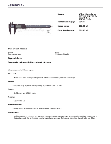 Nazwa: Numer katalogwy: Wiha - Suwmiarka cyfrowa digiMax®, odczyt 0,01 mm.4111701 29422 Nasza cena: 282.08 zł. Cena katalogowa: 331.85 zł. Dane techniczne Waga Zakres pomiaru 48 g 150 mm (6 cali) O produkcie Suwmiarka cyfrowa digiMax, odczyt 0,01 mm W opakowaniu blistrowym. Materiał: Niemetaliczne tworzywo high-tech z 50% zawartością włókna szklanego. Skala: 5-pozycyjny wyświetlacz cyfrowy, wysokość cyfr 7,5 mm. Oczyt: 0,01 mm lub 0,0005 cala. Normy: Zgodne z CE. Zastosowanie: Do pomiarów zewnętrznych, wewnętrznych i głębokości. Dodatkowo: Jeśli urządzenie nie jest używane, wyłącza się automatycznie po 5 minutach. Możliwe zerowanie w każdej pozycji dla szybkiego pomiaru porównawczego. Załączona bateria o żywotności ok. 2 lat. Powered by TCPDF (www.tcpdf.org)