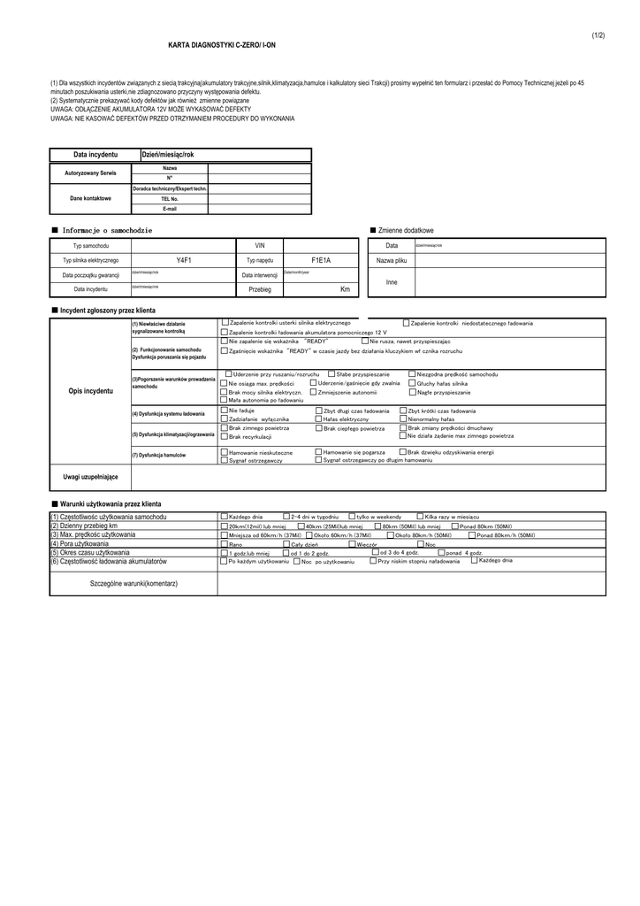 (1/2) KARTA DIAGNOSTYKI C-ZERO/ I-ON (1) Dla wszystkich incydentów związanych z siecią trakcyjną(akumulatory trakcyjne,silnik,klimatyzacja,hamulce i kalkulatory sieci Trakcji) prosimy wypełnić ten formularz i przesłać do Pomocy Technicznej jeŜeli po 45 minutach poszukiwania usterki,nie zdiagnozowano przyczyny występowania defektu. (2) Systematycznie prekazywać kody defektów jak równieŜ zmienne powiązane UWAGA: ODŁĄCZENIE AKUMULATORA 12V MOśE WYKASOWAĆ DEFEKTY UWAGA: NIE KASOWAĆ DEFEKTÓW PRZED OTRZYMANIEM PROCEDURY DO WYKONANIA Data incydentu Dzień/miesiąc/rok Nazwa Autoryzowany Serwis N° Doradca techniczny/Ekspert techn. Dane kontaktowe TEL No. E-mail ■ Informacje o samochodzie ■ Zmienne dodatkowe VIN Typ samochodu Y4F1 Typ silnika elektrycznego Data poczxątku gwarancji Data incydentu dzień/miesiąc/rok dzień/miesiąc/rok Data F1E1A Typ napędu Data interwencji dzień/miesiąc/rok Nazwa pliku Date/month/year Inne Km Przebieg ■ Incydent zgłoszony przez klienta Opis incydentu (1) Niewłaściwe działanie sygnalizowane kontrolką Zapalenie kontrolki usterki silnika elektrycznego Zapalenie kontrolki niedostatecznego ładowania Zapalenie kontrolki ładowania akumulatora pomocniczego 12 V Nie zapalenie się wskażnika "READY" Nie rusza, nawet przyspieszając (2) Funkcjonowanie samochodu Dysfunkcja poruszania się pojazdu Zgaśnięcie wskażnika "READY" w czasie jazdy bez działania kluczykiem wł cznika rozruchu (3)Pogorszenie warunków prowadzenia samochodu Uderzenie przy ruszaniu/rozruchu Słabe przyspieszanie Uderzenie/gaśnięcie gdy zwalnia Nie osiąga max. prędkości Brak mocy silnika elektryczn. Mała autonomia po ładowaniu Zmniejszenie autonomii Niezgodna prędkość samochodu Głuchy hałas silnika Nagłe przyspieszanie (4) Dysfunkcja systemu ładowania Nie ładuje Zadziałanie wyłącznika Zbyt długi czas ładowania Hałas elektryczny Zbyt krótki czas ładowania Nienormalny hałas Brak zimnego powietrza Brak recyrkulacji Brak ciepłego powietrza (5) Dysfunkcja klimatyzacji/ogrzewania Brak zmiany prędkości dmuchawy Nie działa żądanie max zimnego powietrza (7) Dysfunkcja hamulców Hamowanie nieskuteczne Sygnał ostrzegawczy Hamowanie się pogarsza Brak dzwięku odzyskiwania energii Sygnał ostrzegawczy po długim hamowaniu Uwagi uzupełniające ■ Warunki uŜytkowania przez klienta (1) Częstotliwośc uŜytkowania samochodu (2) Dzienny przebieg km (3) Max. prędkośc uŜytkowania (4) Pora uŜytkowania (5) Okres czasu uŜytkowania (6) Częstotliwość ładowania akumulatorów Szczególne warunki(komentarz) Każdego dnia 2-4 dni w tygodniu tylko w weekendy Kilka razy w miesiącu 20km(12mil) lub mniej 40km (25Mil)lub mniej 80km (50Mil) lub mniej Ponad 80km (50Mil) Mniejsza od 60km/h (37Mil) Około 60km/h (37Mil) Około 80km/h (50Mil) Ponad 80km/h (50Mil) Rano Cały dzień Wieczór Noc od 3 do 4 godz. ponad 4 godz. 1 godz.lub mniej od 1 do 2 godz. Każdego dnia Przy niskim stopniu naładowania Po każdym użytkowaniu Noc po użytkowaniu ## (2/2) ■ Warunki pojawienia się incydentu Okresowo( w roku/miesiącu/przy przebiegu km ) Od początku użytkowania (1)Od kiedy (2) Znaki ostrzegawcze (3) Częstotliwośc incydentu (4) Warunki klimatyczne (5) Temperetura zewnętrzna (6) Typ drogi (7) Poziom wskaznika akumulatora (8) Warunki jazdy Tak (częstotliwośc w miesiącu/ w roku ) W pewnych warunkach( ) Okresowa Pochmurno Dzień pogodny Opady deszczu Opady śniegu Inne ( ) Powyżej 40°C (104°F) Od 0°C do 10°C (32°F à 50°F)Od -20°C do 0°C (-4°F à 32°F) Od 20°C do 40°C (68°F do 104°F)Od 10°C do 20°C (50°F à 68°F) Jazda w mieście Jazda poza miastem Autostrada W górach Spadek Wzniesienie Inne( ) Około "F" Około 1/2 1/2 "E" Zapalenie kontrolki F na 1/2 Około "E" Przy rozruchu Spadek Rozruch ponowny. Normalna jazda Autostrada Korek drogowy Wzniesienie Zatrzymanie Ruszanie Przyspieszanie Stała prędk.(km/h -Miles/h ) Hamowanie Wsteczny bieg Długie pozostawienie w pozycji "READY" Inne( ) Przy wciskaniu. Lekkie naciśnięcie Pełne naciśnięcie % otwarcia( %) *Pozycja pedału przyspieszenia. Po zwolnieniu Nie Stała *Pozycja pedału hamulca *Pozycja zmiany biegów (9) Włączone wyposaŜenie A/C (10) Ilośc pasaŜerów w samoch. 1 osoba Pusty (11) Stan obciąŜenia samochodu (12) Metoda ładowania akumulatorów Lekkie naciśnięcie Ciągłe naciskanie W pozycji Park W pozycji Revers Usuwanie zaparowania 3 osoby 4 osoby Ogrzewanie 2 osoby Obciążony (kg ) Szybkie ładowanie * Typ ładowania Ładowanie normalne(V ) Po zwolnieniu W pozycji Drive Ponowne naciśnięcie W pozycji Neutre * Stan naładowania(ilóśc segmentów) Szczególne warunki(komentarz) ■ Rezultat analizy warsztatu No Nie (1)Historia obsługi i napraw Tak 1 2 Stały (2)Incydent Okresowy (3)Kod defektu (P-kod) Nie odtworzony Przejściowy Stały (Kod: . . Przy obecności P-kodu opisać historię interwencji posprzedaŜnych EV-ECU MCU * Nazwa ECU Bez defektu . BMU . System ładowania . ). Klimatyzacja & ogrzewanie ECU (4) Opisać warunki pojawiania się defektu Sprawdzona funkcja Rezultat Oznaczenie procedury naprawczej 1 2 3 (5) Analiza (6) Przyczyna incydentu (7)Część przyczynowa usterki Określona( ) Nazwa (w przypadku incydentu akumulatora trakcyjnegonaleŜy zastosować specjalną kartę diagnostyki ) Szczególne warunki(komentarz) Przypuszczalna( ) Nr.ref części Nieznana